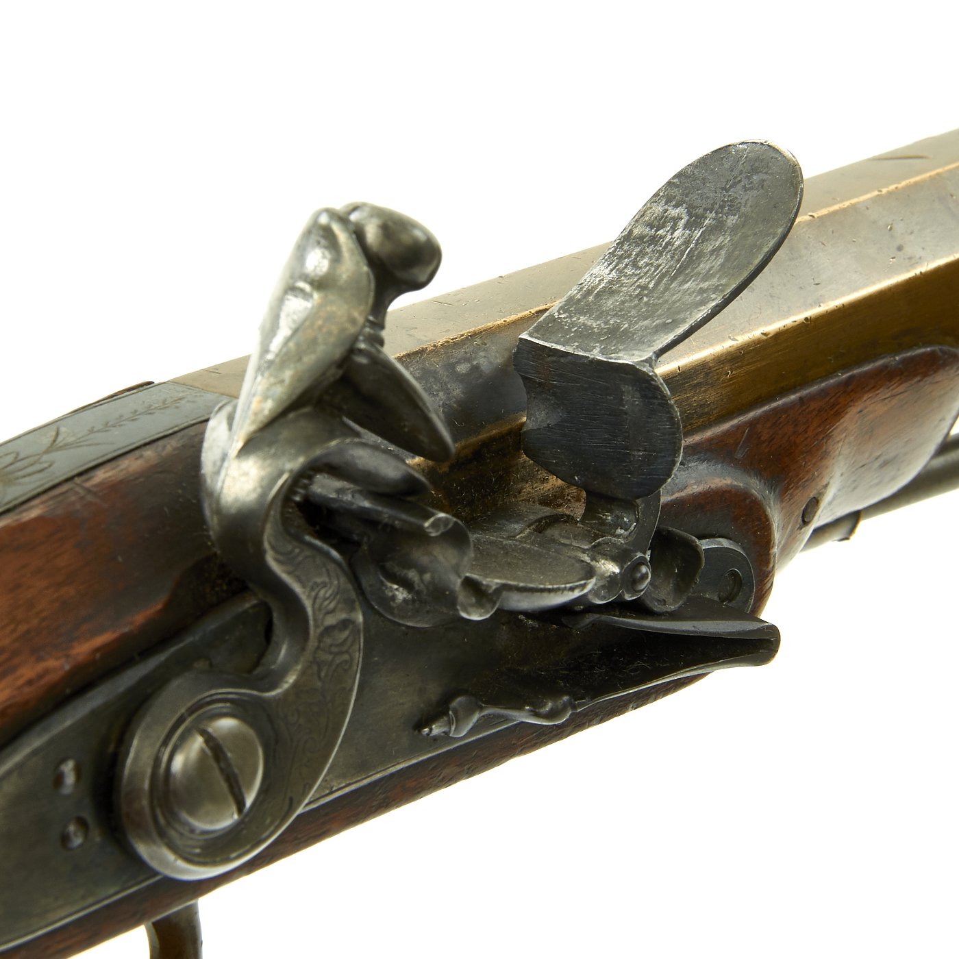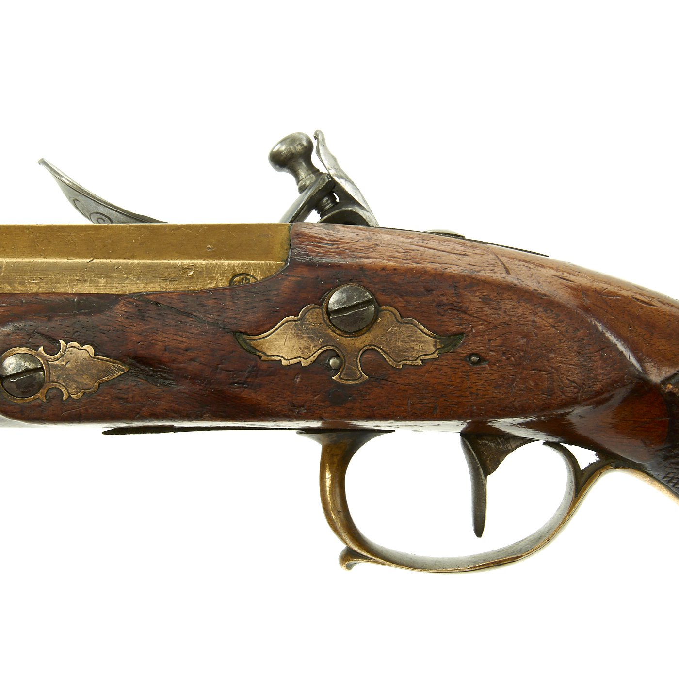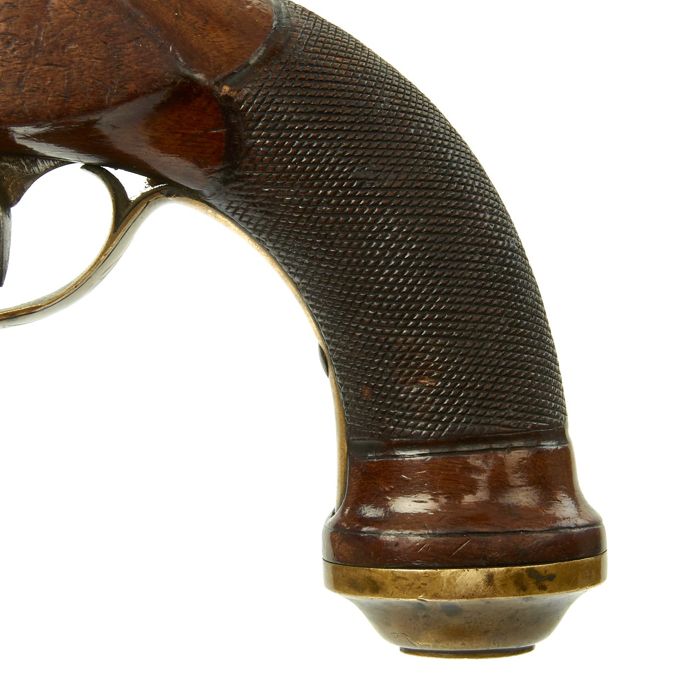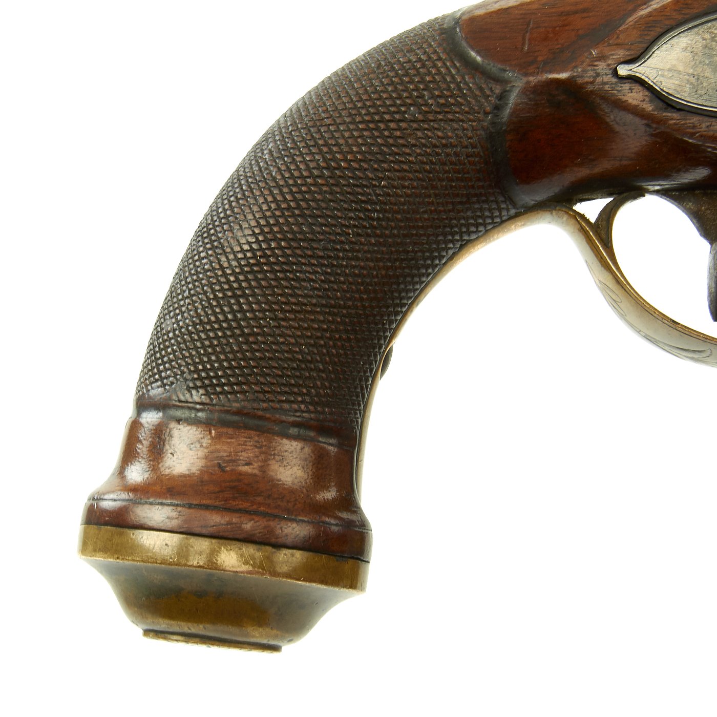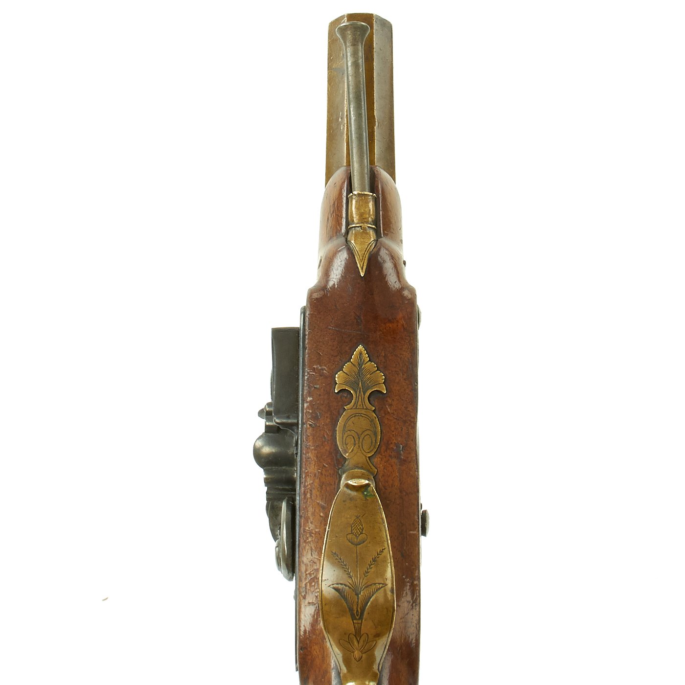 It has a quality Walnut stock and the grip is elegantly checkered, brass/bronze Mounts and brass/bronze 6 3/4" octagonal barrel. The lock plate is un-signed. Decorated mounts, complete with iron ram rod. Overall 11 1/2" in length, and in great shape. The lock functions correctly, holding at half cock and firing at full.