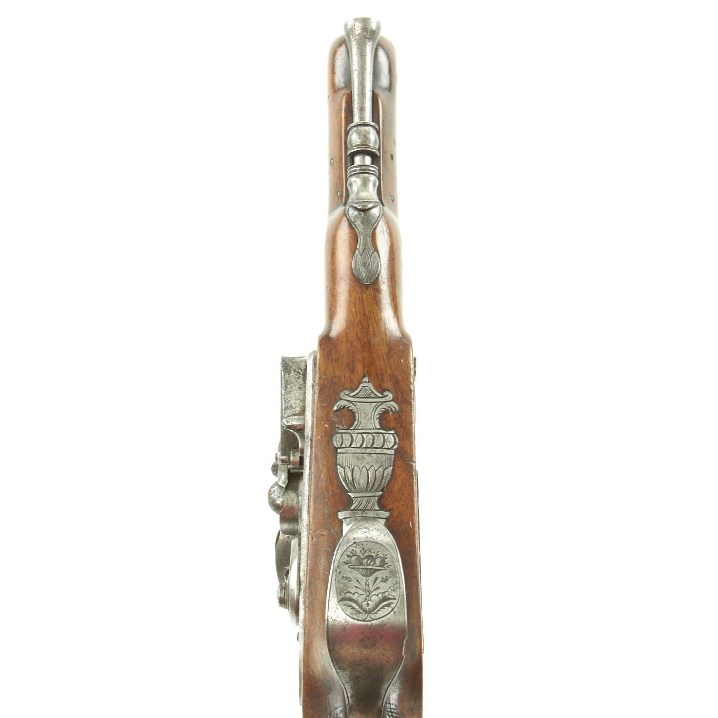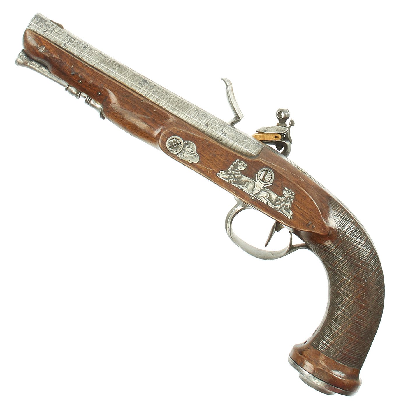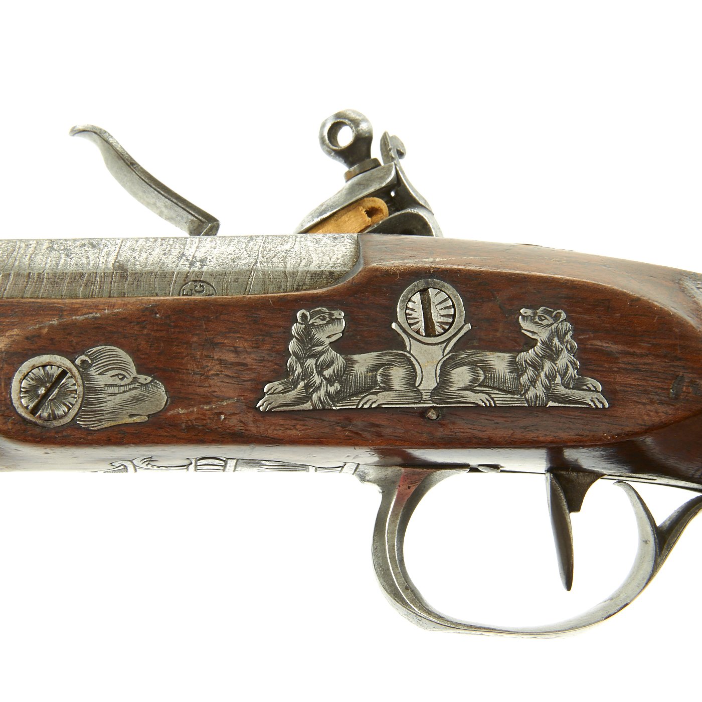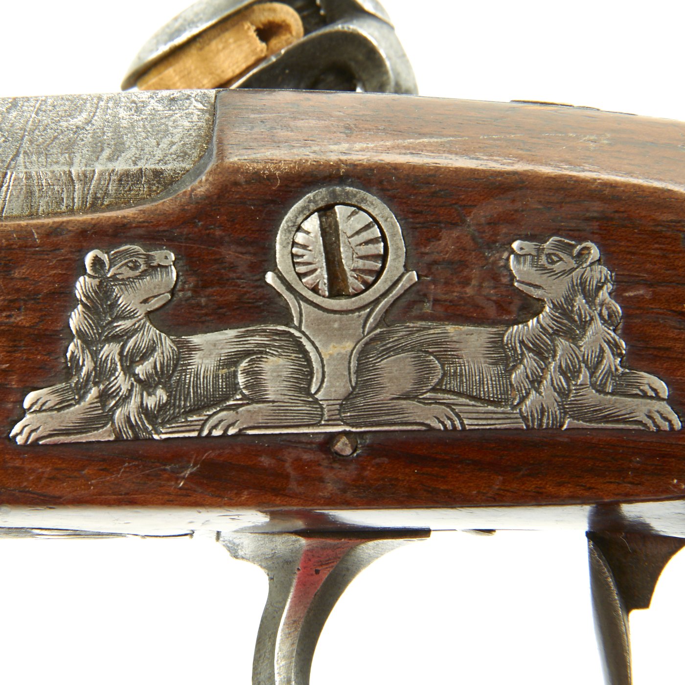 The pistol has all iron mounts extensively engraved with Lions on the side plate. The walnut stock is checkered around the wrist and comes complete with its original steel ramrod.