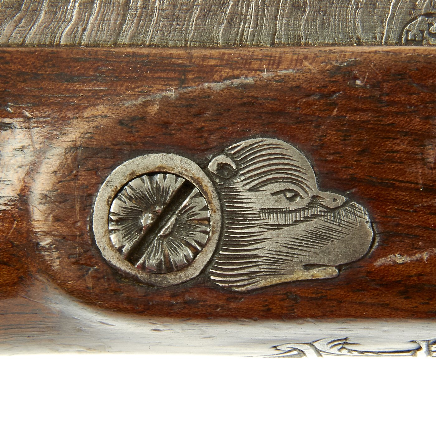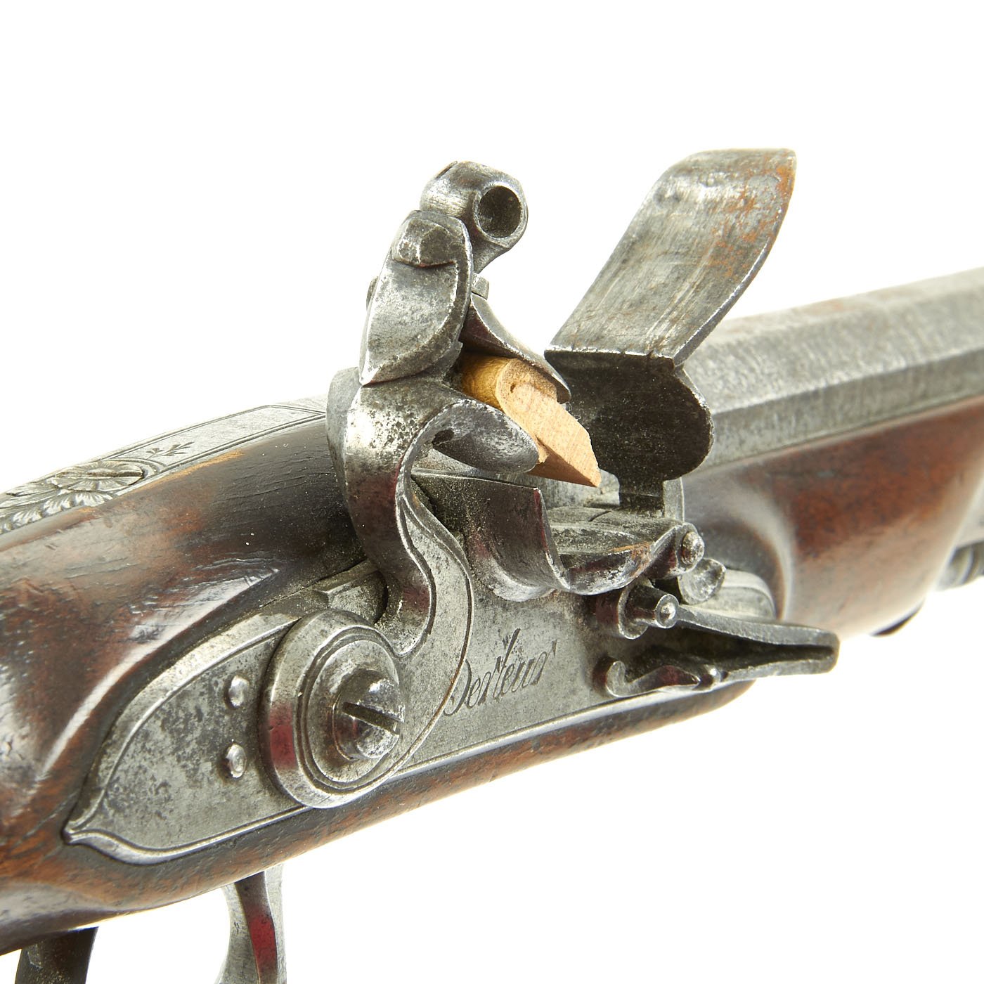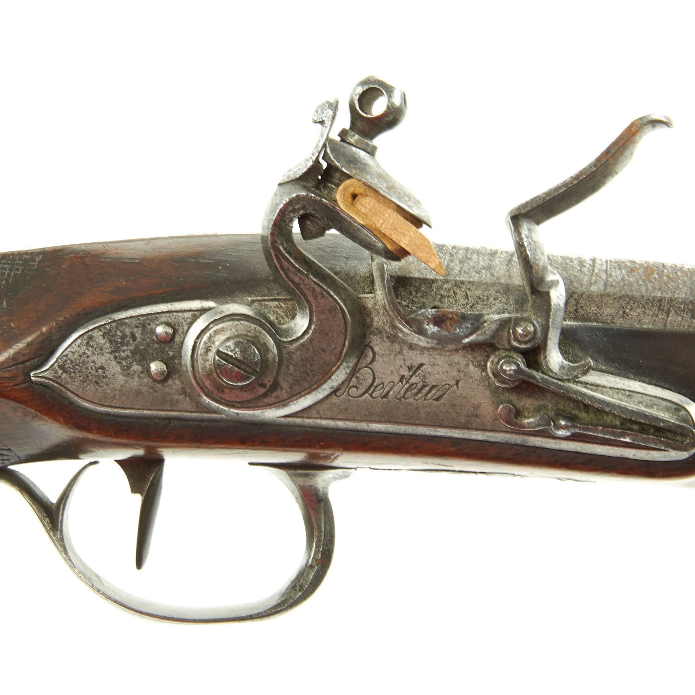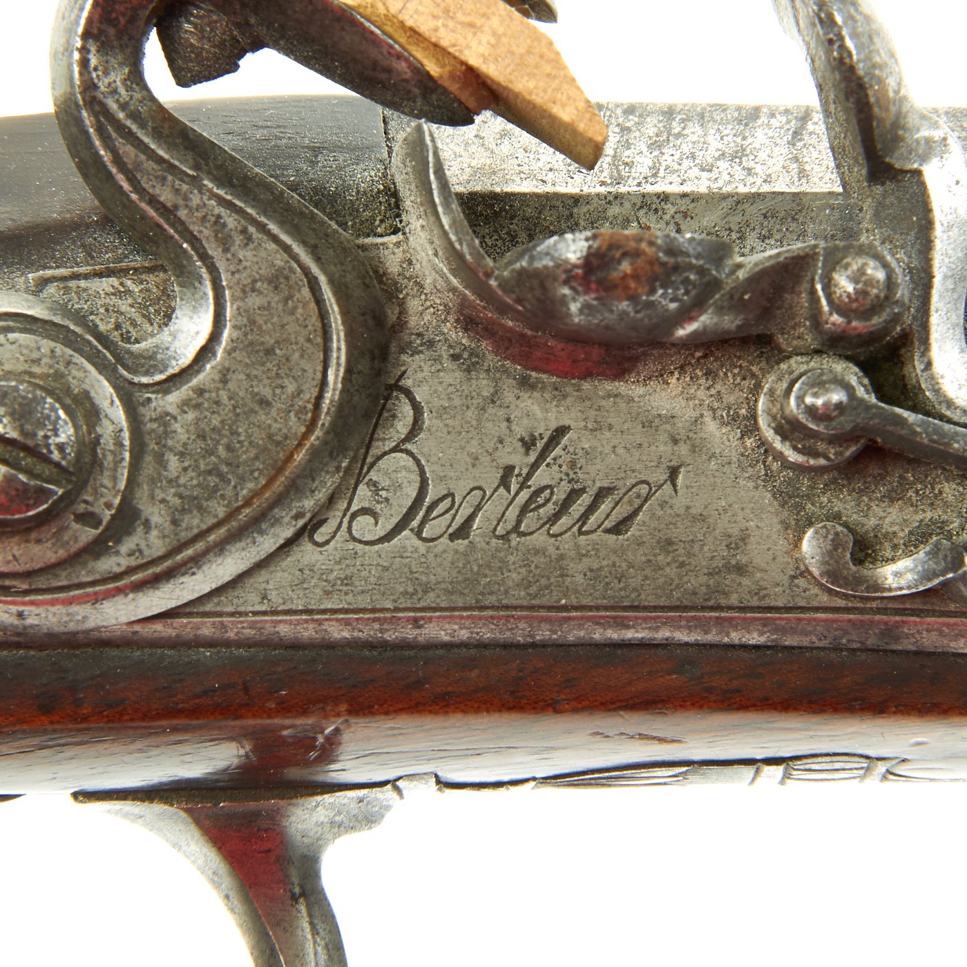 The lock plate is marked G. Berleur in script, for famous Belgian gunsmith Guillaume Berleur. Berleur was listed as an arquebusier et fournissieur (gunsmith & contractor) in Liège, Belgium and was active from about 1780 until about 1840. Berleur’s reputation for quality arms was significant enough for him to be brought to France around 1800 to work at the Imperial Armory at Versailles, directly under renowned arms maker Nicholas Noël Boutet.