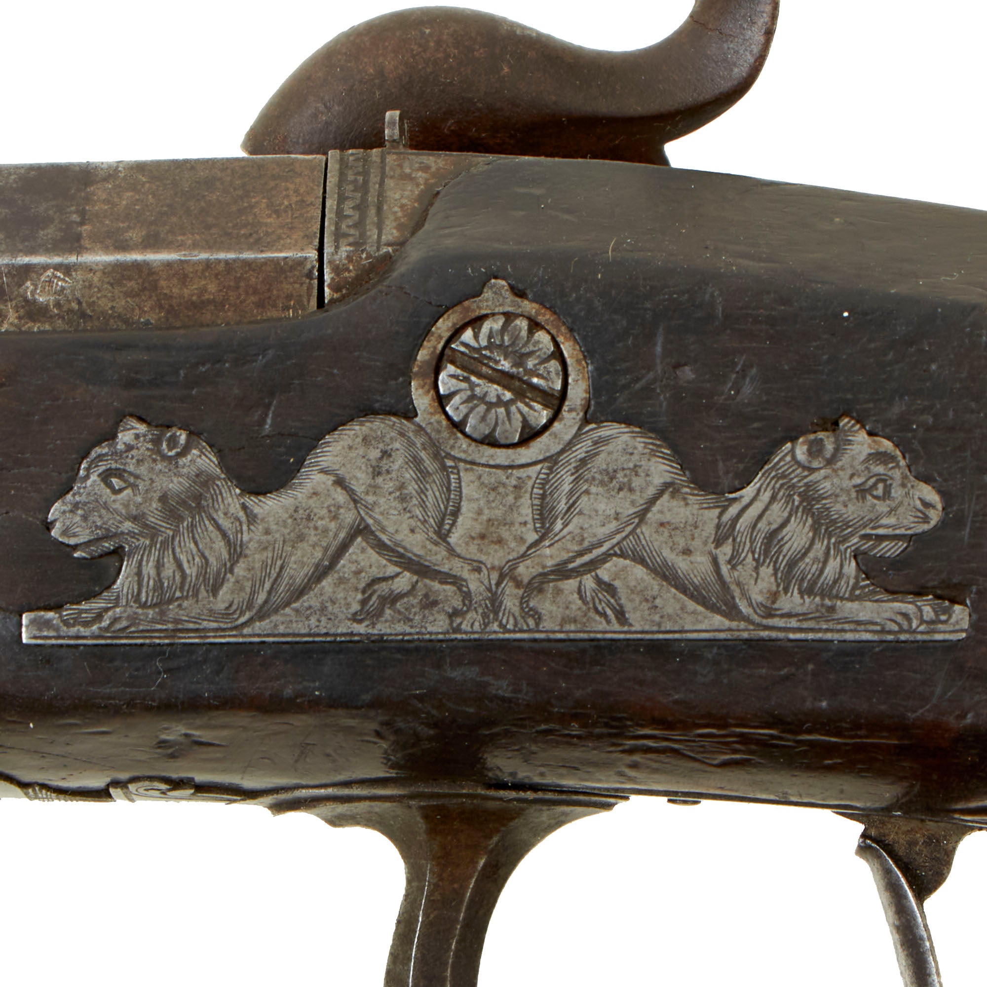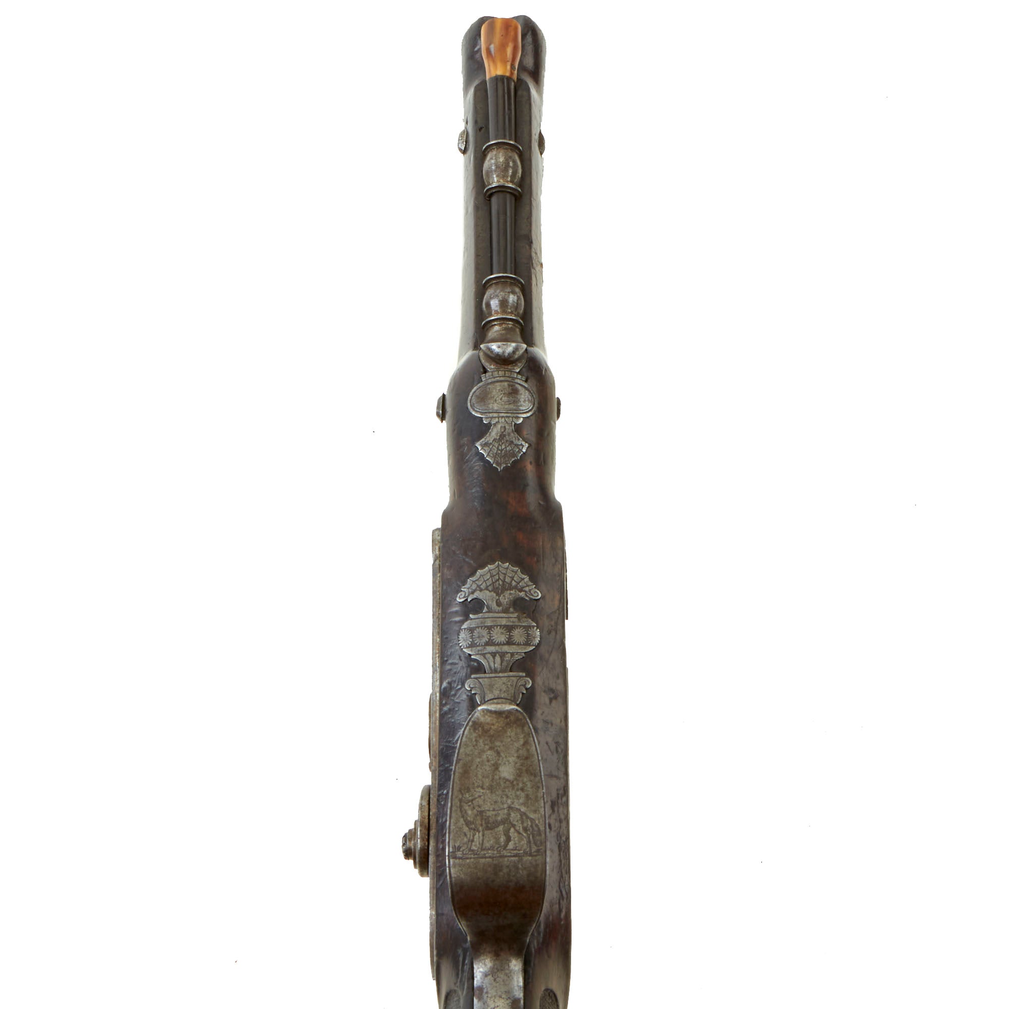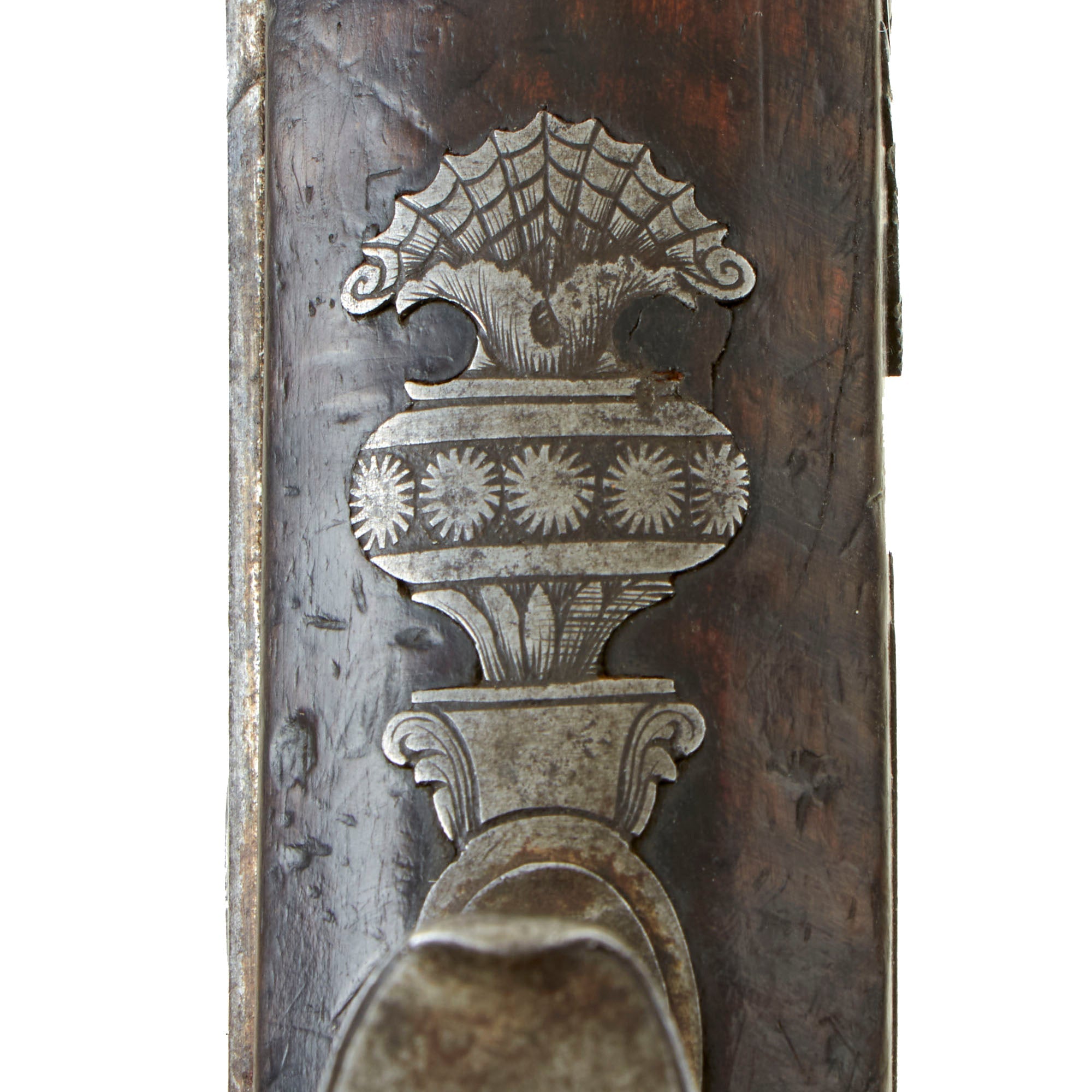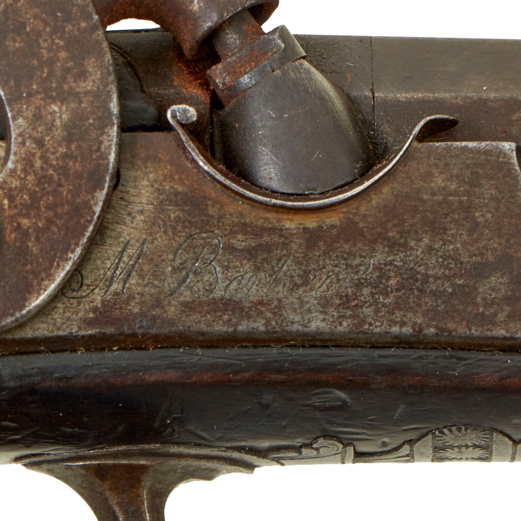 The lock plate is marked M. Berleur in script, for the very well-known Belgian gunsmith Michel Berleur, who operated 1758-1810. We have seen many other examples of his fine work, and he was also the older brother of the famous Guillaume Berleur, also listed as an arquebusier et fournissieur (gunsmith & contractor) in Liège, Belgium and was active from about 1780 until about 1840. Berleur’s reputation for quality arms was significant enough for him to be brought to France around 1800 to work at the Imperial Armory at Versailles, directly under renowned arms maker Nicholas Noël Boutet, who developed this style of pistol.
