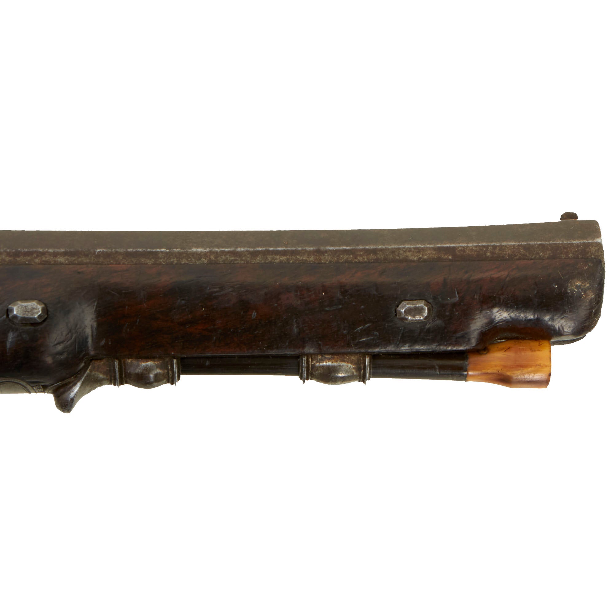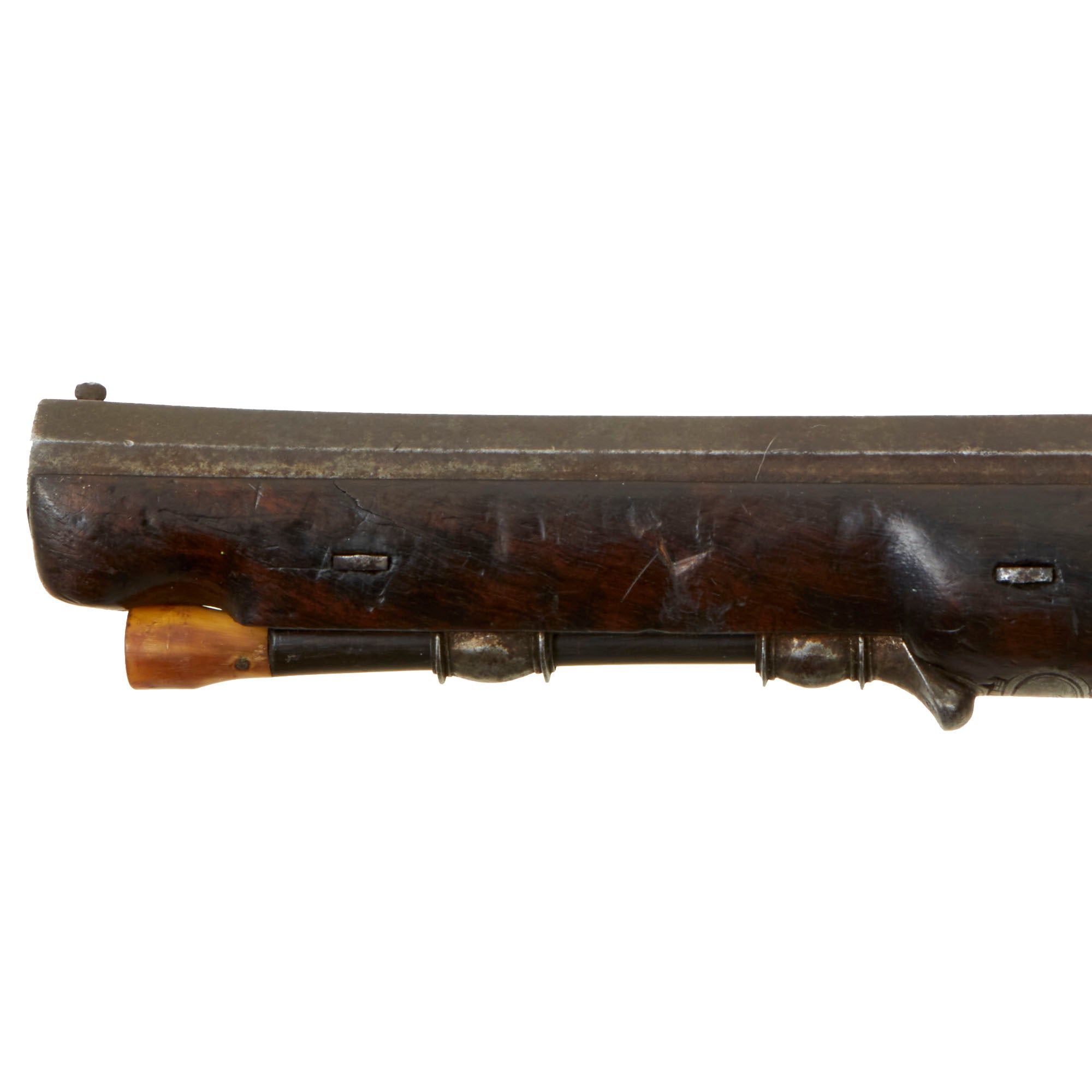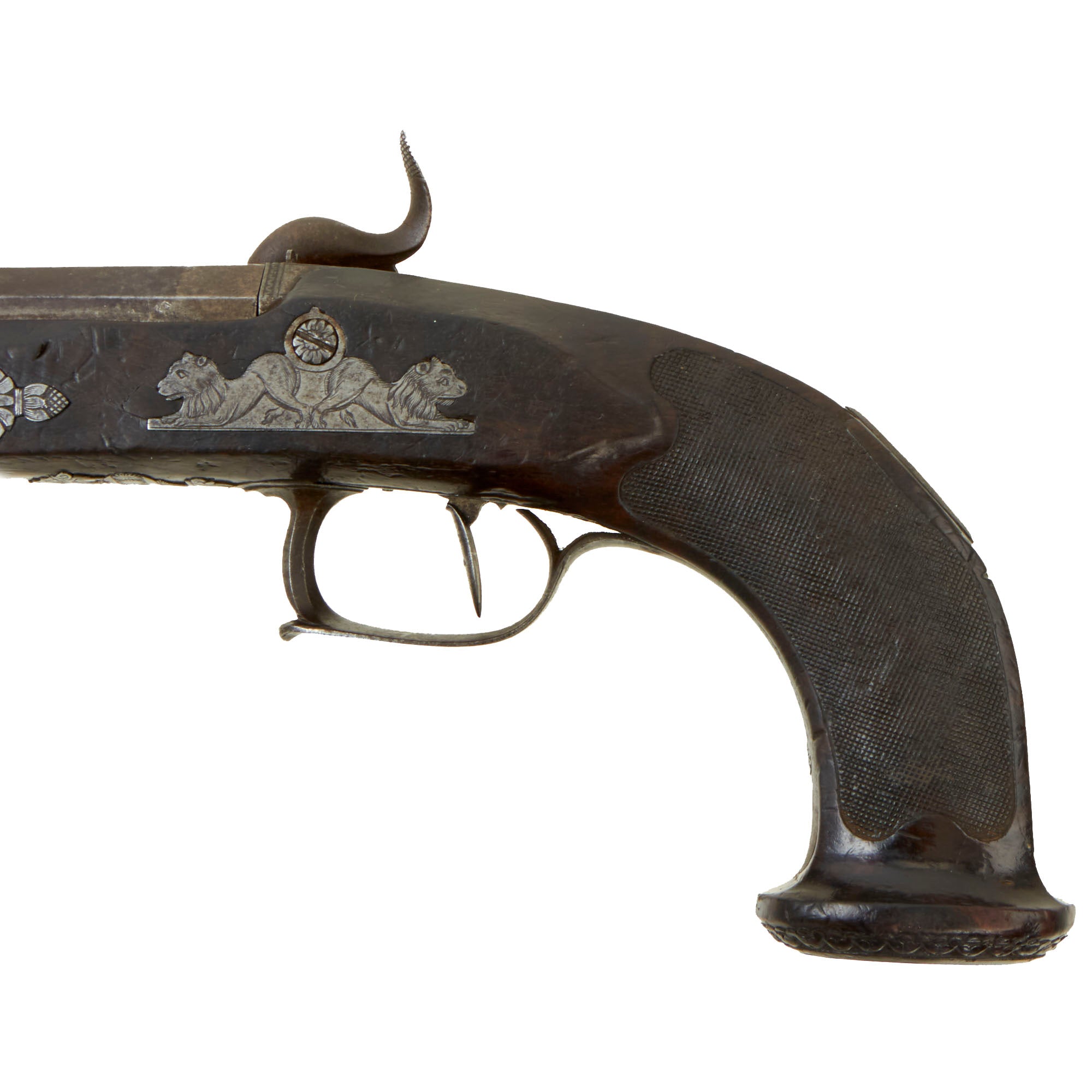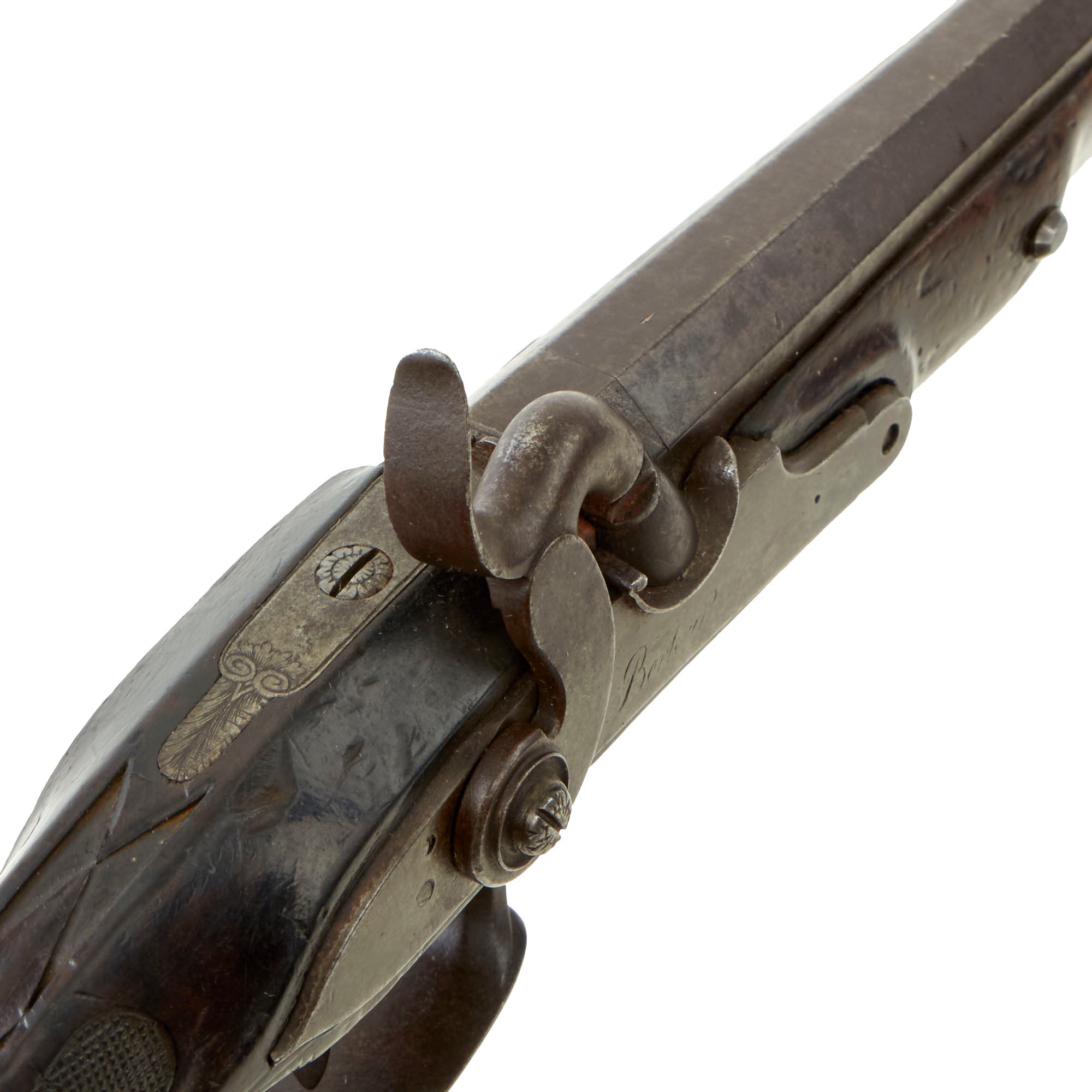 The lock plate is marked M. Berleur in script, for the very well-known Belgian gunsmith Michel Berleur, who operated 1758-1810. We have seen many other examples of his fine work, and he was also the older brother of the famous Guillaume Berleur, also listed as an arquebusier et fournissieur (gunsmith & contractor) in Liège, Belgium and was active from about 1780 until about 1840. Berleur’s reputation for quality arms was significant enough for him to be brought to France around 1800 to work at the Imperial Armory at Versailles, directly under renowned arms maker Nicholas Noël Boutet, who developed this style of pistol.