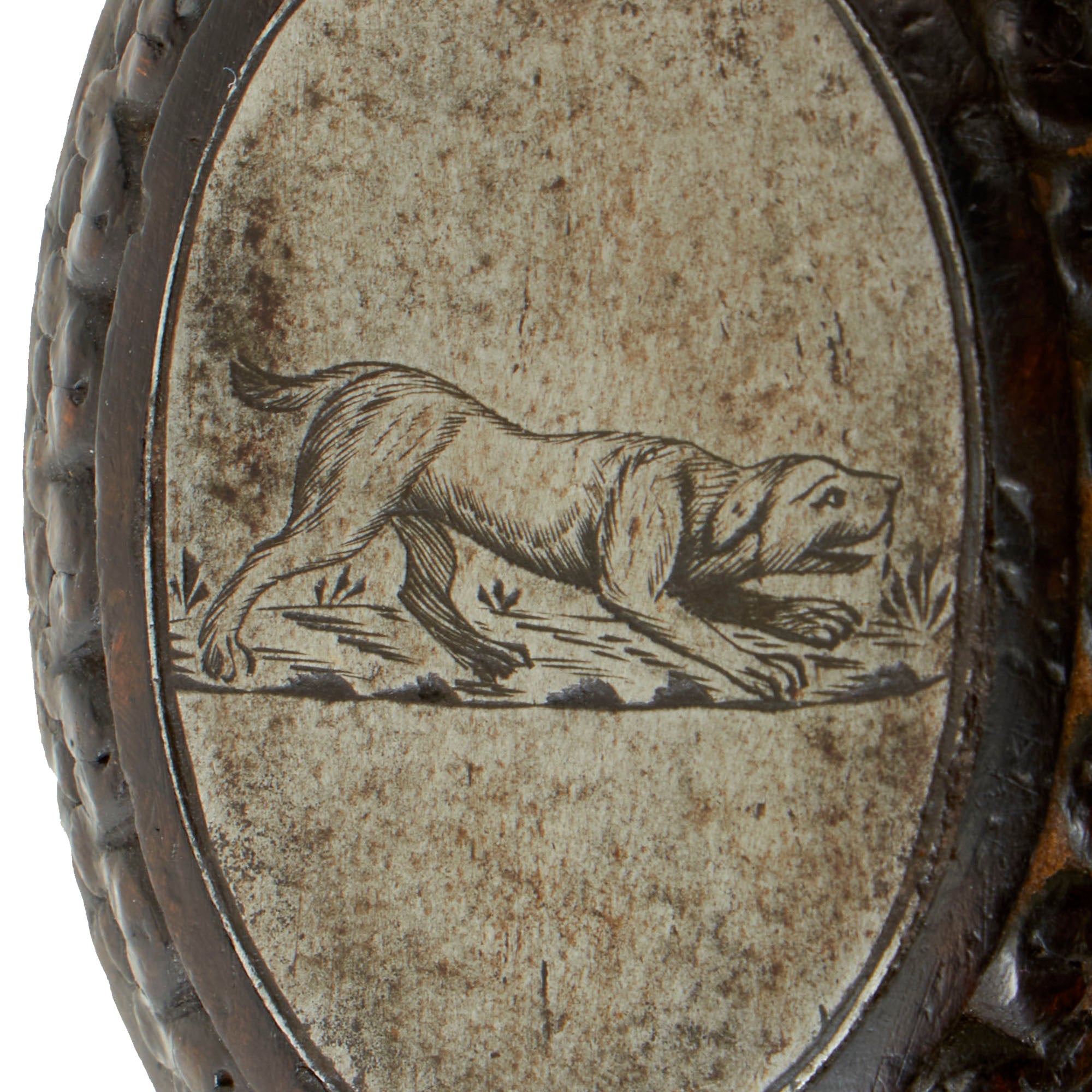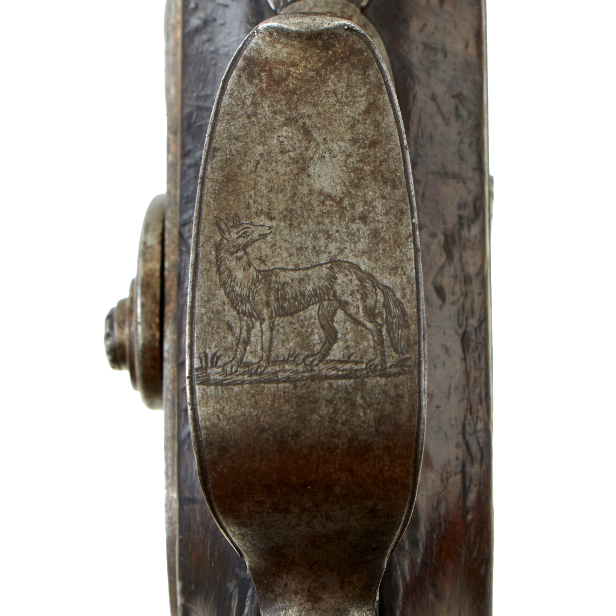 The pistol has all iron mounts extensively engraved with Lions on the side plate, and stands of arms around the finials of the trigger guard and the ramrod pipe. The butt cap displays a fantastic hunting hound engraving, while the trigger guard shows what looks to be a fox. There is really a very high level of craftsmanship used to make this pistol, which in its prime must have been quite the head-turner.