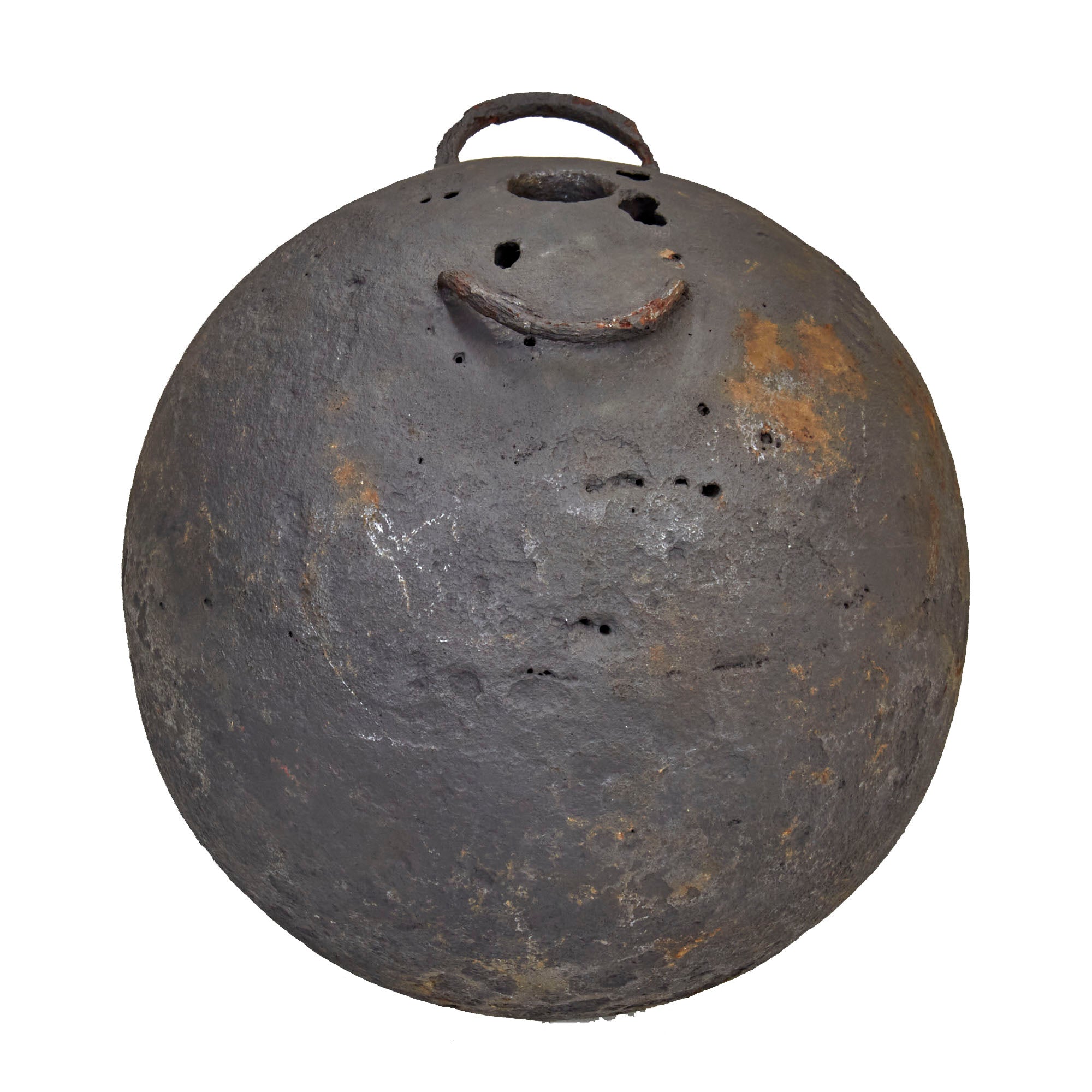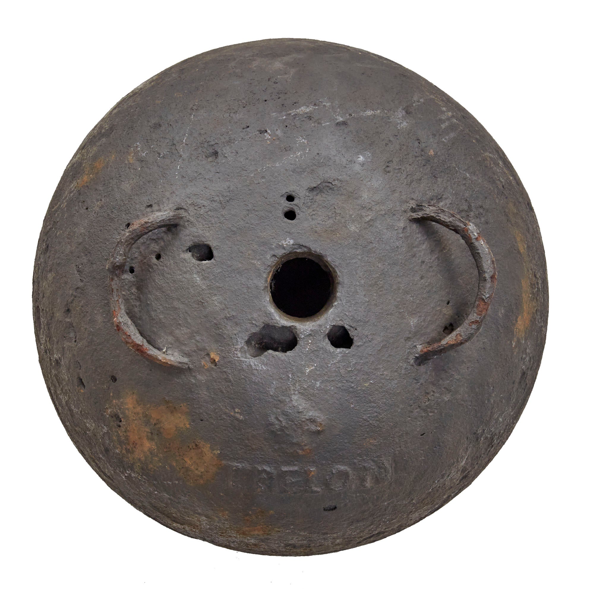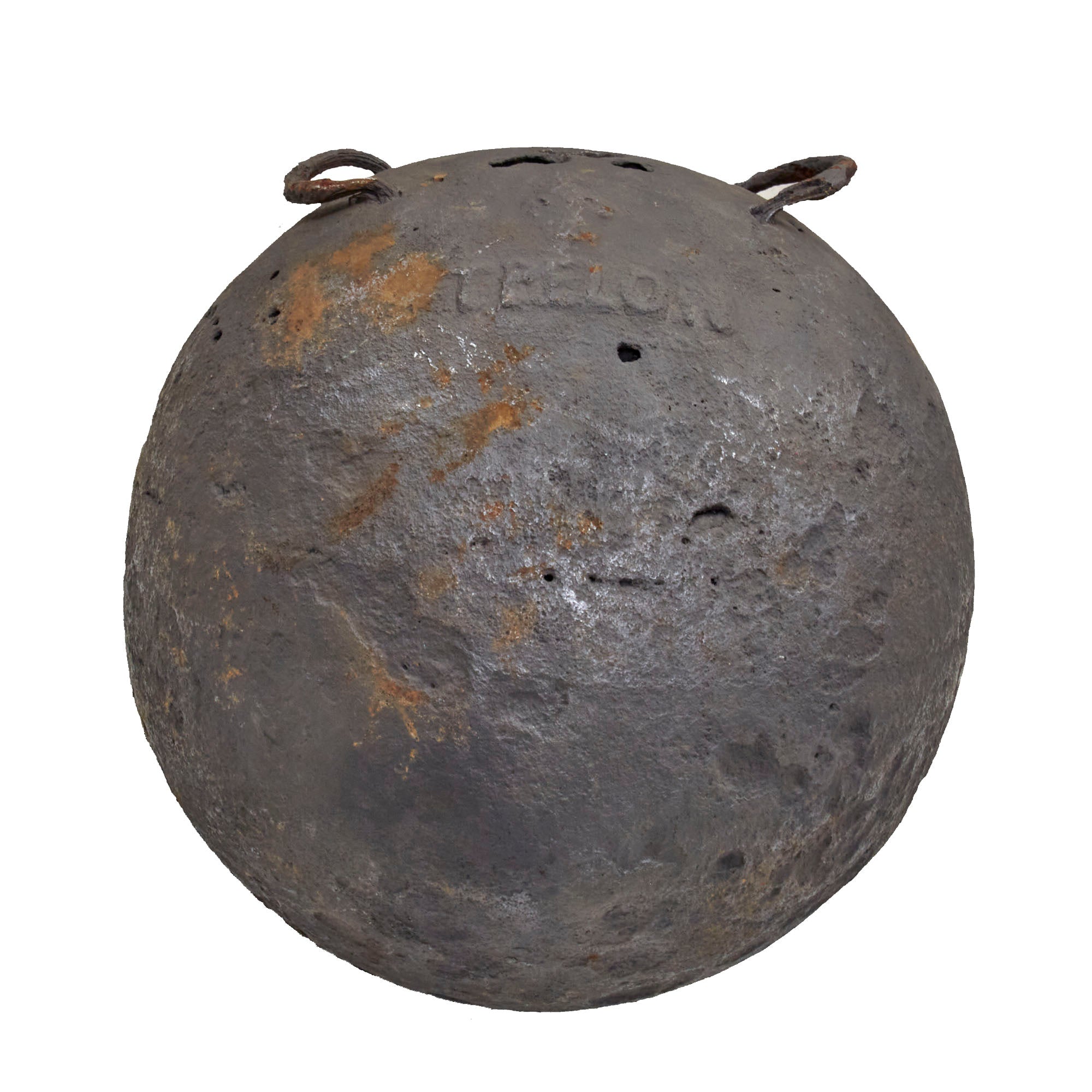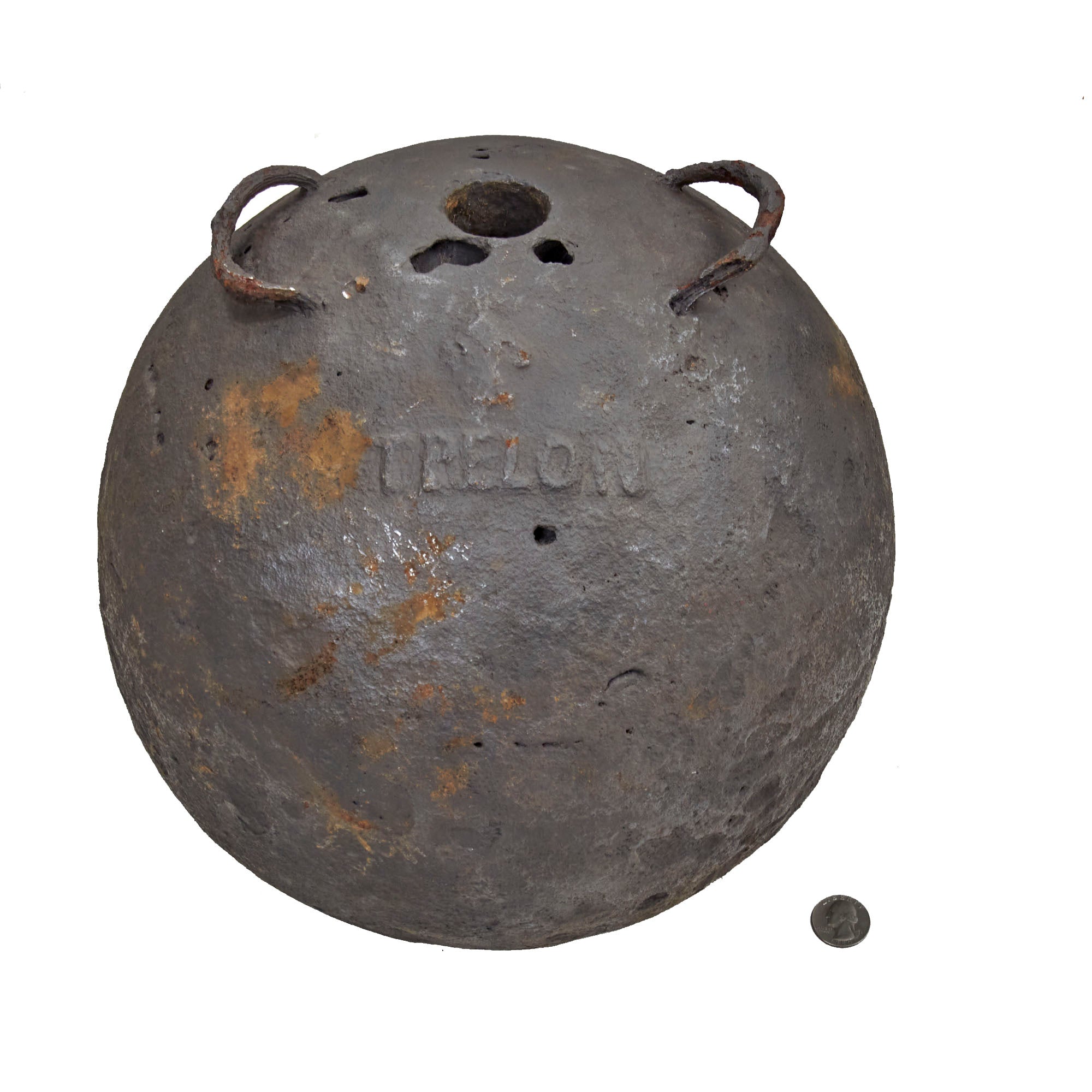 Original Item: Only One Available.This is a fantastic example of a genuine French 18th or early 19th century 12 inch diameter hollow mortar bomb with two lifting rings or lifting "ears" still intact. The mortar is iron and has a Fleur-de-Lis over the word TRELON embossed near the top, for the Trélon foundry or arsenal where it was manufactured. The ball measures approximately 12 inches in diameters with a 39 inch circumference and weight approximately 100 LBS. Overall condition is good with areas of heavy material loss as shown, and previous rust which has been eradicated. A very rare hard-to-find piece that dates from the American Revolution or Napoleonic Wars!