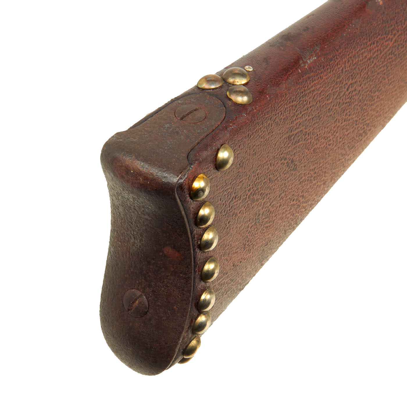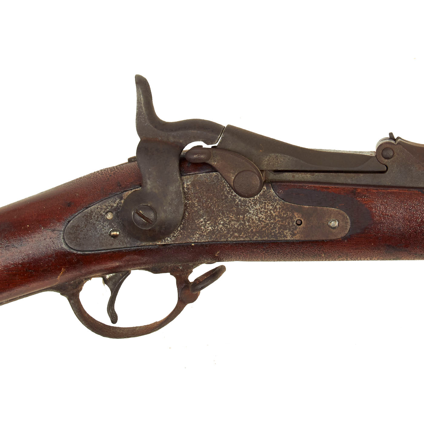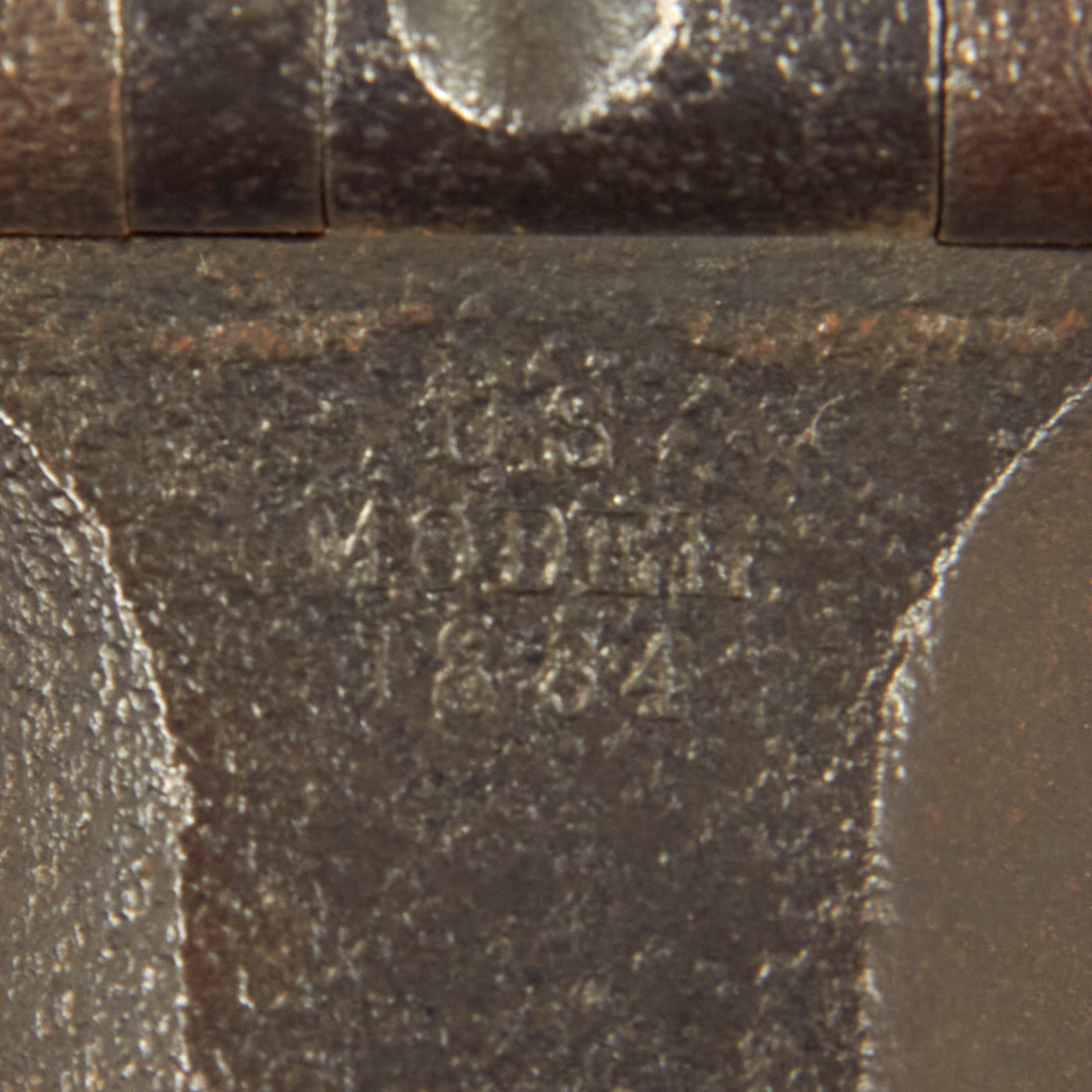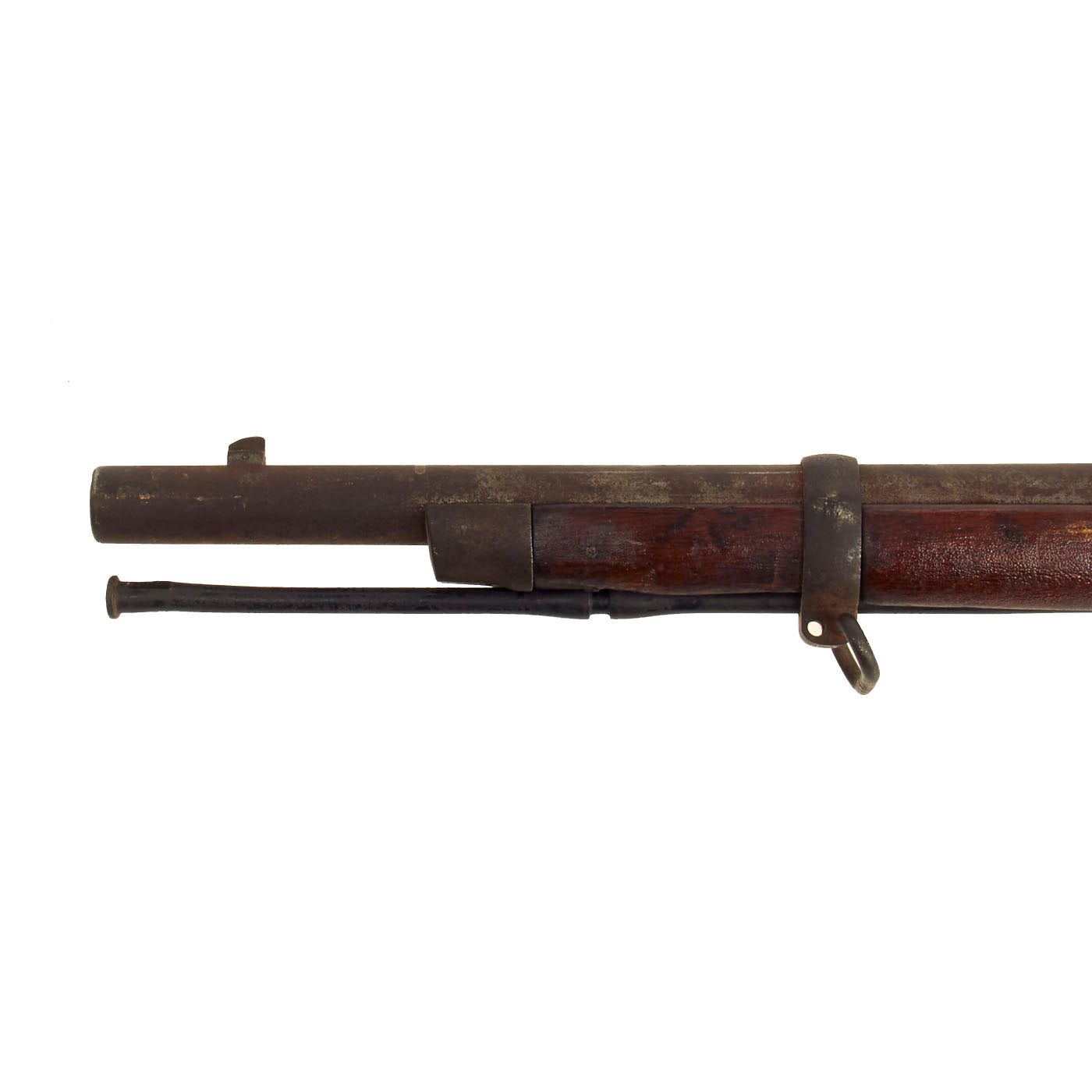This frontier-worn example still features a standard ramrod, and was not later updated do the "1888" pattern. The metalwork is oxidized with light pitting, especially on the receiver area, which has made the serial number impossible to read. All we can see is that it ends with "38". Both barrel bands are U marked, however the butt plate stamping is not visible, and the lock plate only has a "ghost" of the original "U.S. / SPRINGFIELD" marking, though it definitely is there. Both sling swivels are still present, however the stacking swivel has been removed.