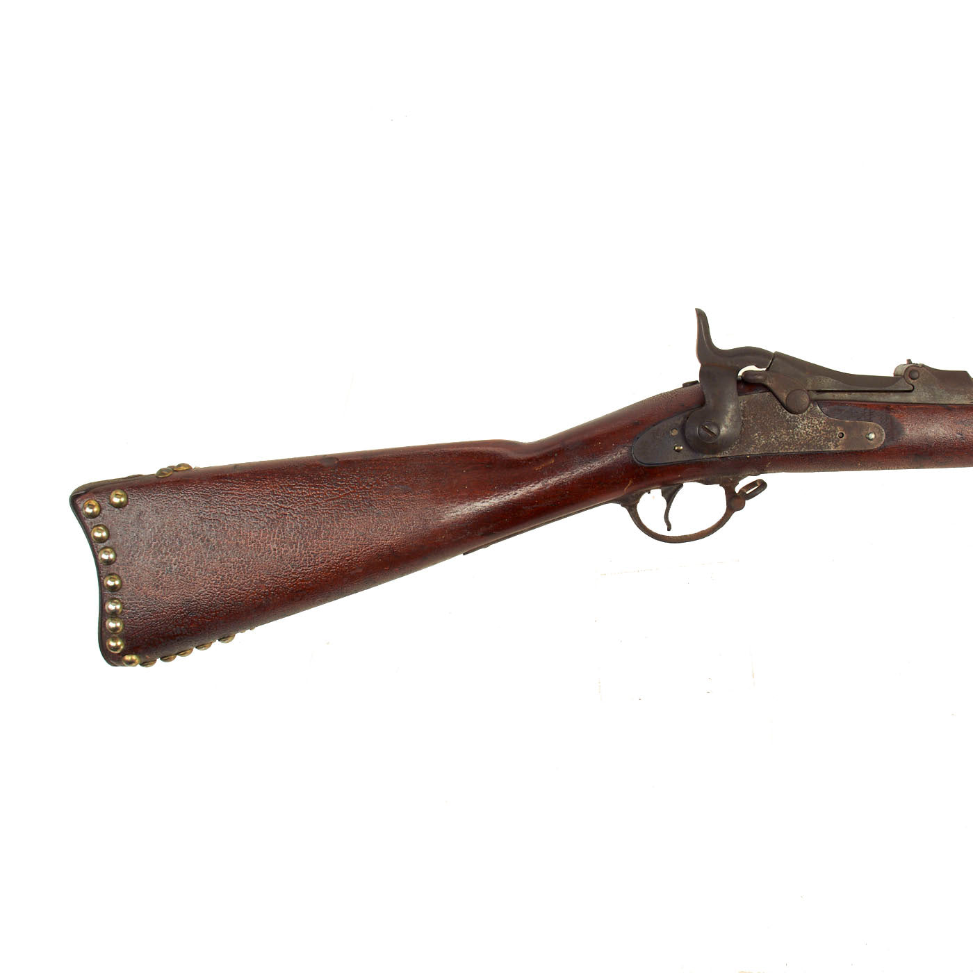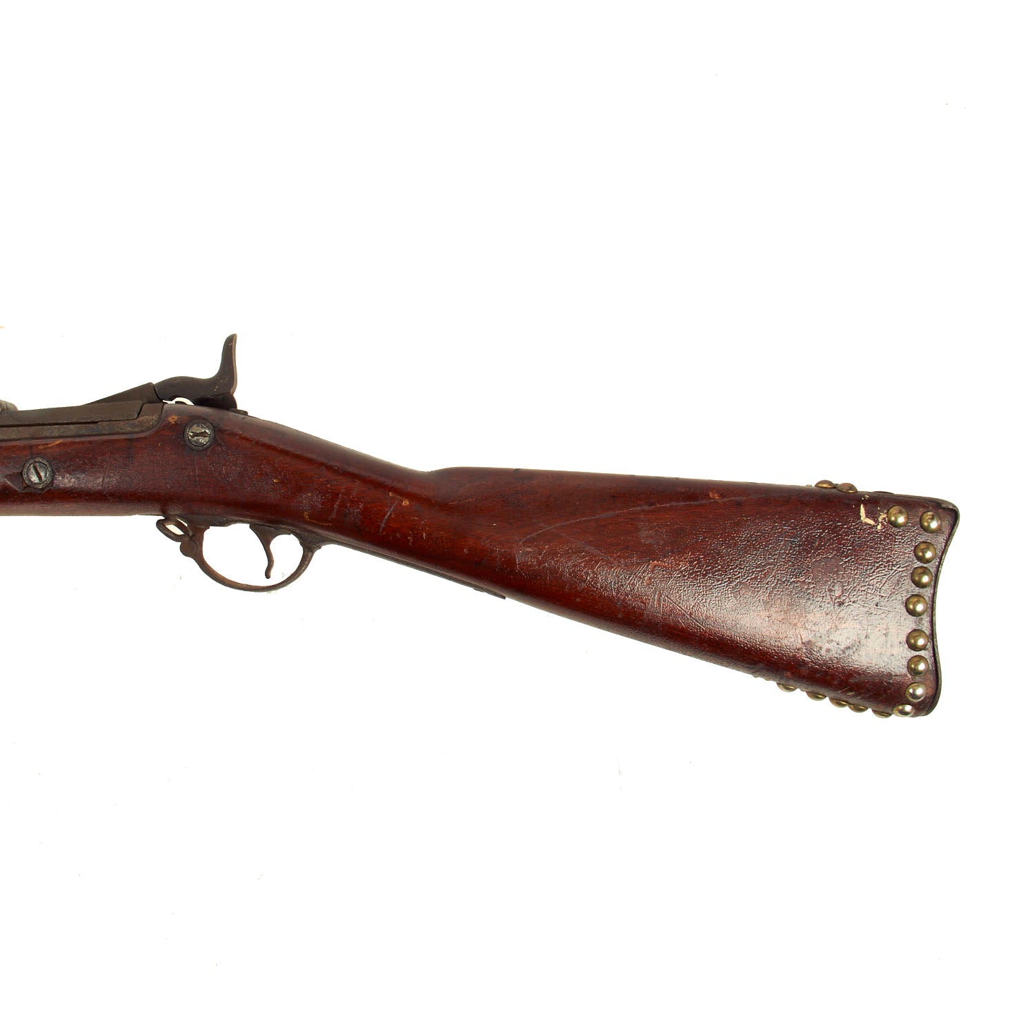 Original Item: Only One available. This is a very nice example of the classic Springfield trapdoor rifle, the weapon used, in its carbine form, by the troopers of the 7th Cavalry that met their fate at the Battle of Little Big Horn in 1876. After official service, this rifle found its way into in the hands of Native Americans, where it saw long service. The butt stock has had brass tacks added around the butt plate, a very common decoration used on Native American used firearms. It also at some point had the rear sight replaced with a 1861 Springfield style sight, and the lower barrel band was replaced as well.