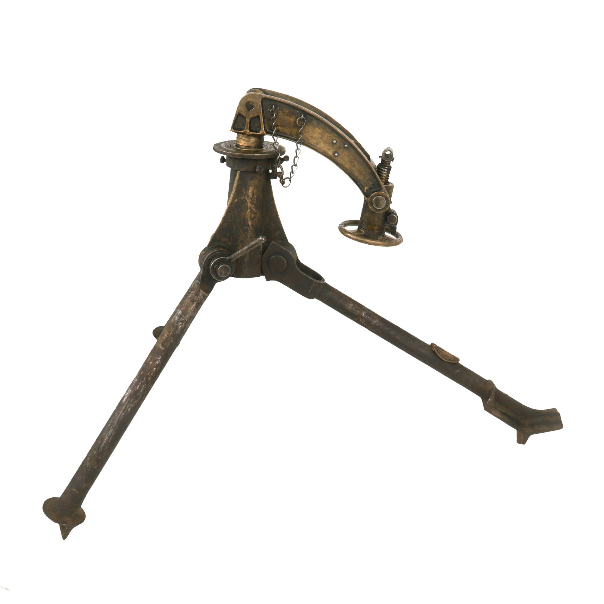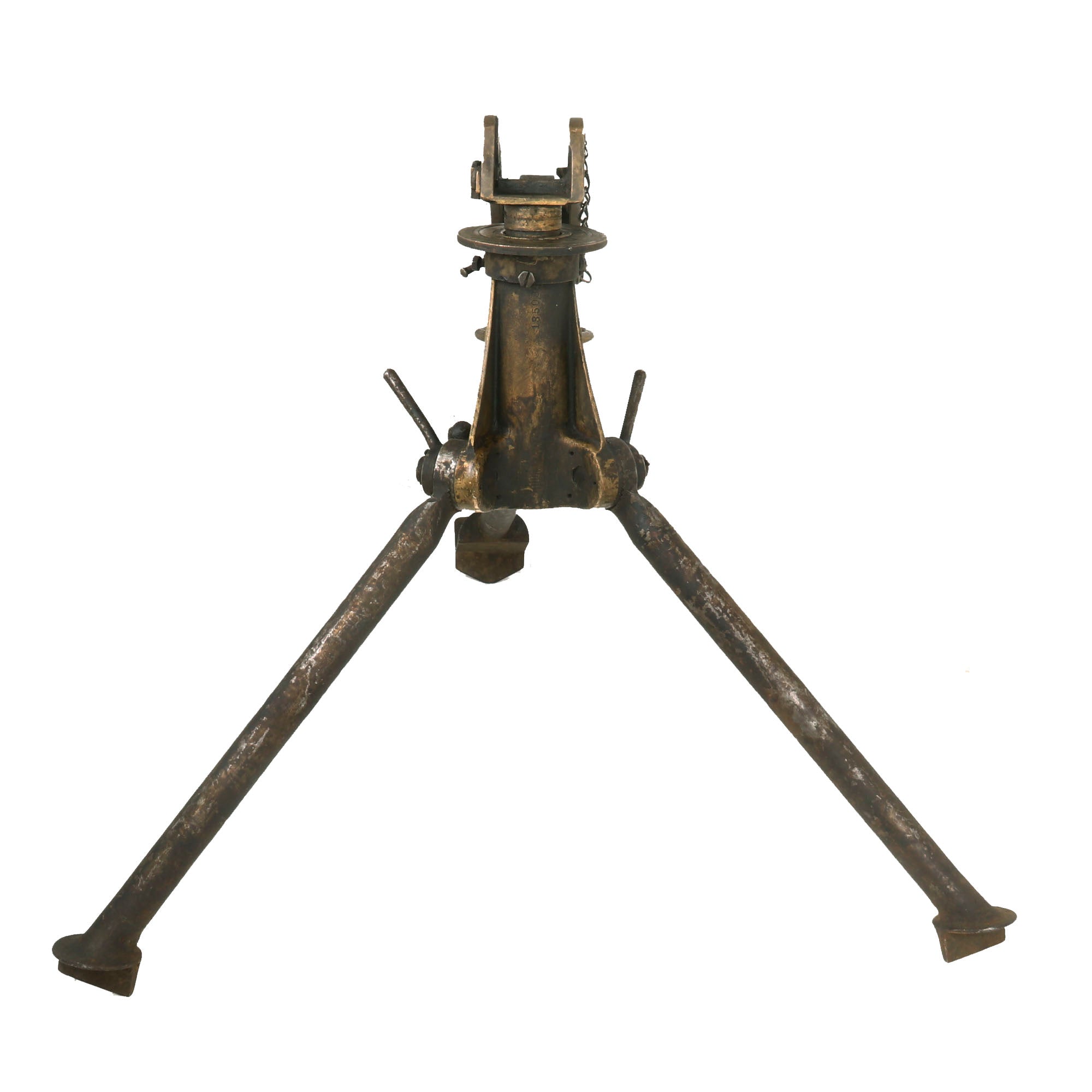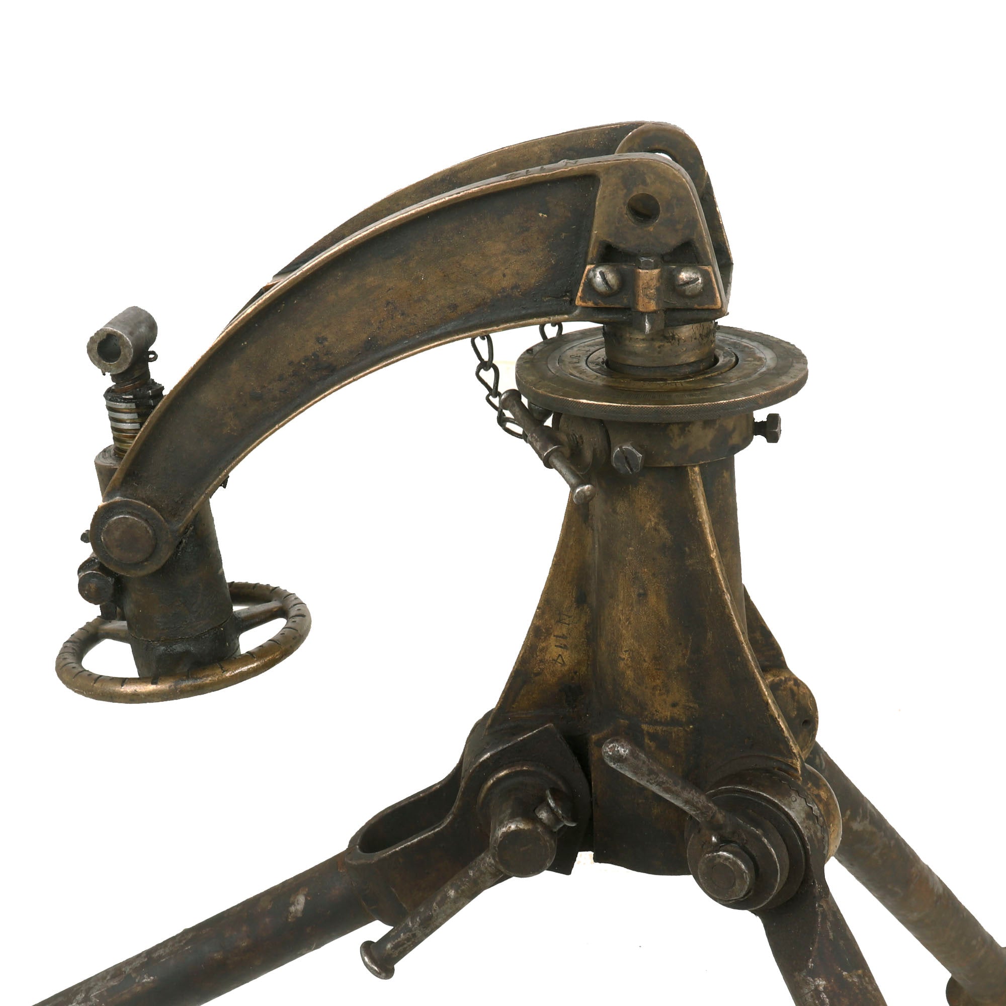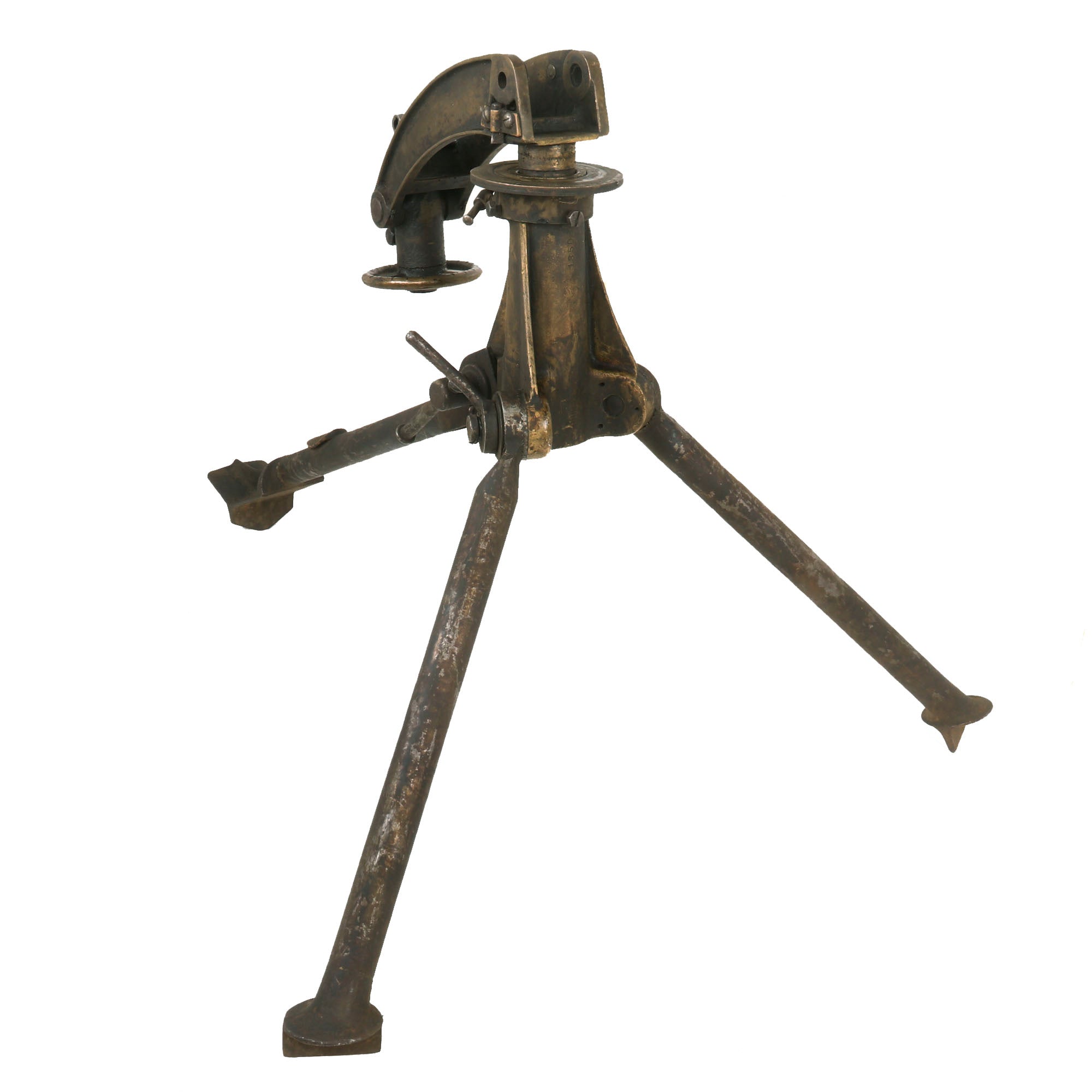 Extraordinarily each gun was fitted with an optical sight mount very similar in style and location to the MG 08 optical system (sight regrettably absent). Additionally each gun was accompanied by a matching numbered tripod (number location is on original tripod data plate). Each of these original tripods was made by COLT and are the U.S. Pattern but the data plates were customized. Still showing VICKERS MACH. GUN / TRIPOD / MARK IV on the upper half the Colt inscription below was removed and SOLEY - GRIMARD stamped in its place. This was done presumably in the hope of future reorders.