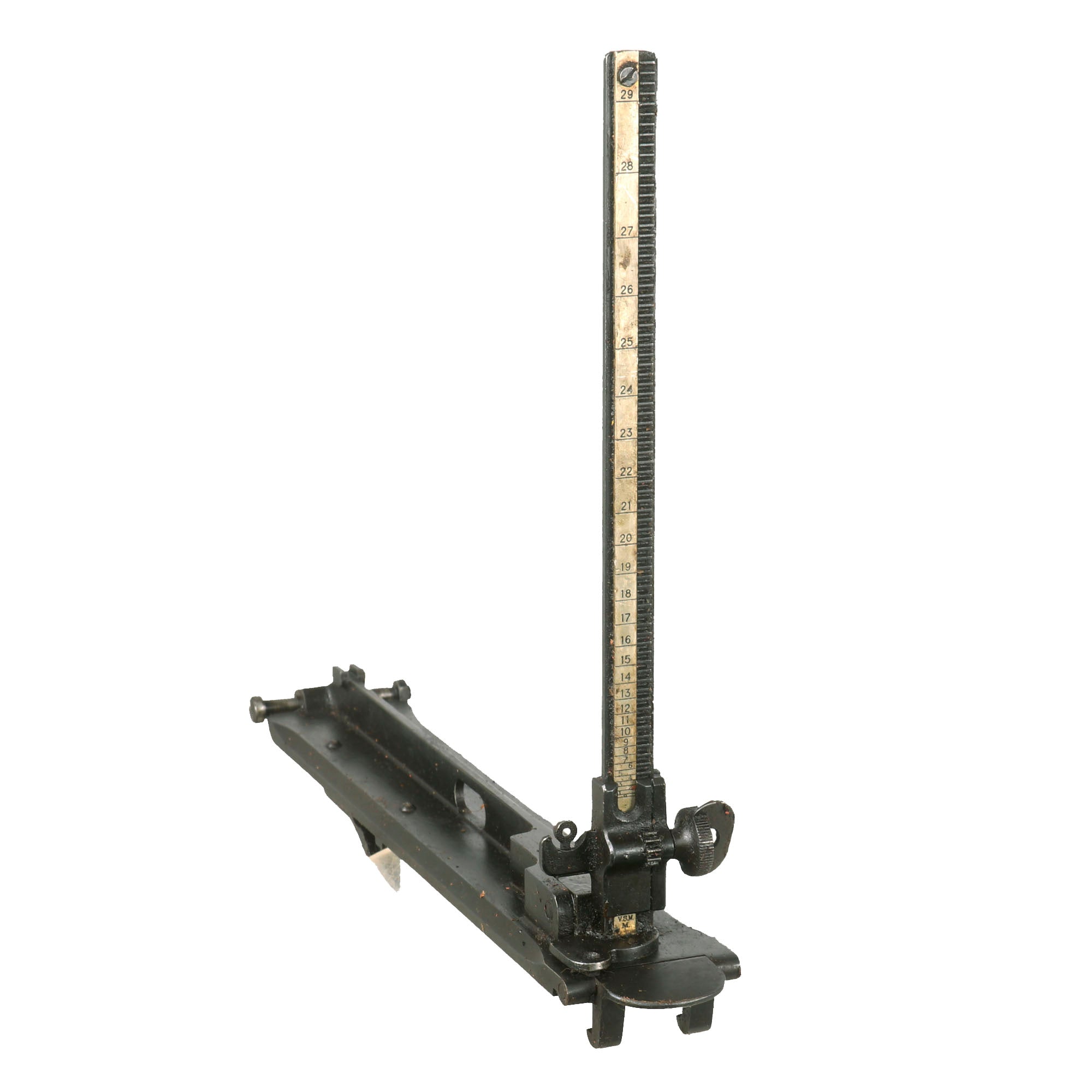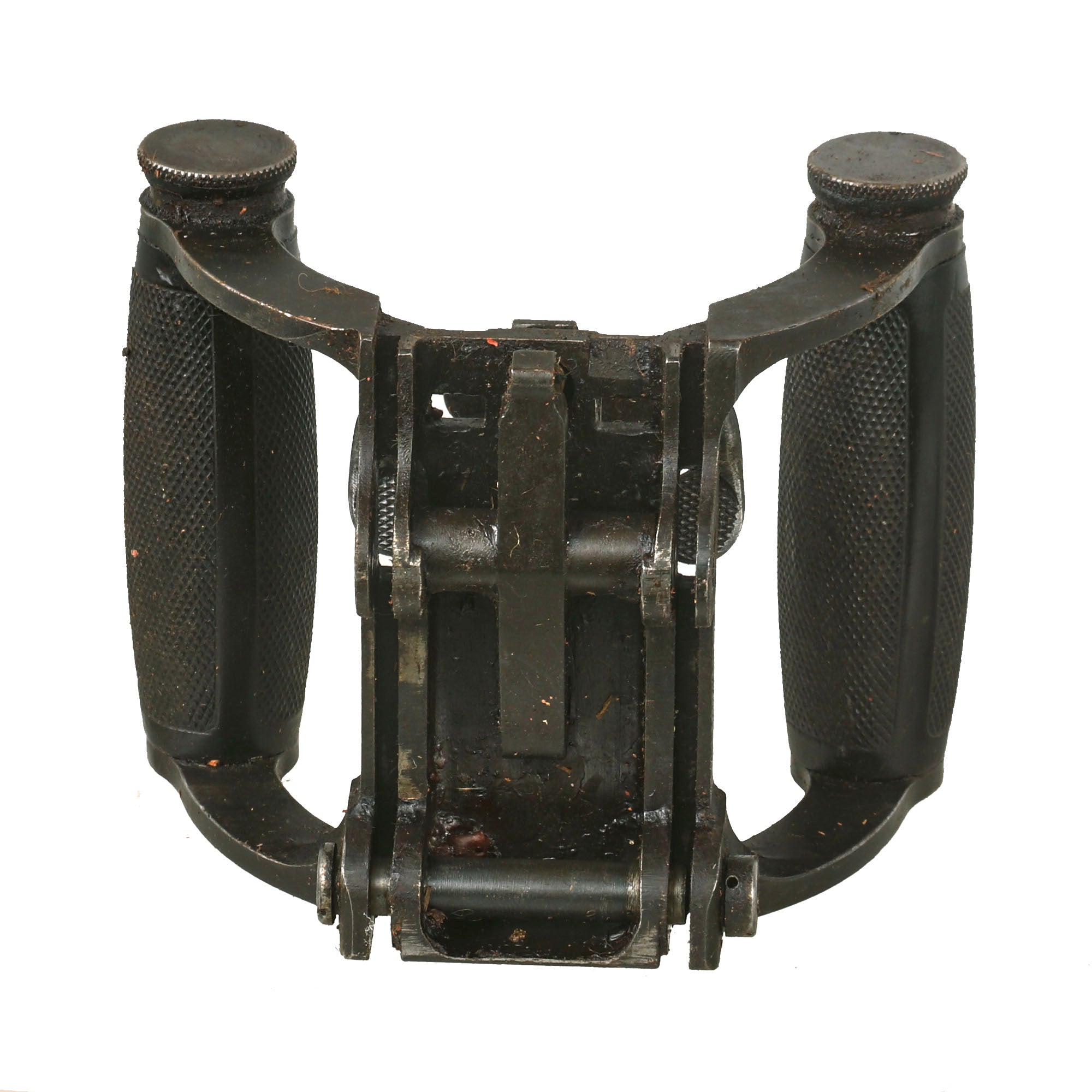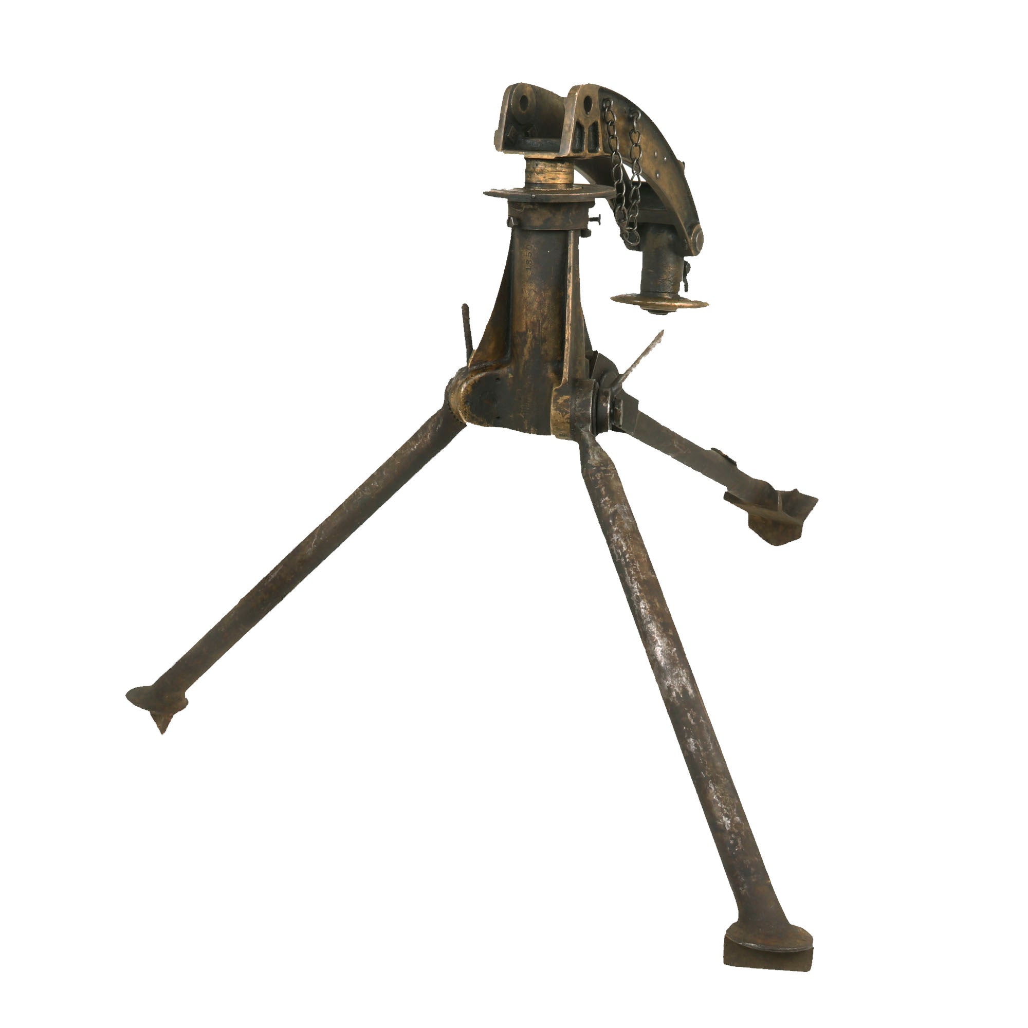 Extraordinarily each gun was fitted with an optical sight mount very similar in style and location to the MG 08 optical system (sight regrettably absent). Additionally each gun was accompanied by a matching numbered tripod (number location is on original tripod data plate). Each of these original tripods was made by COLT and are the U.S. Pattern but the data plates were customized. Still showing VICKERS MACH. GUN / TRIPOD / MARK IV on the upper half the Colt inscription below was removed and SOLEY - GRIMARD stamped in its place. This was done presumably in the hope of future reorders.