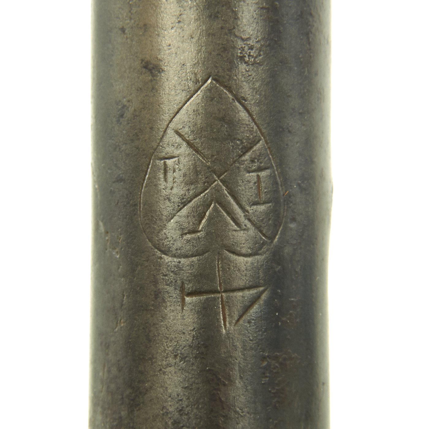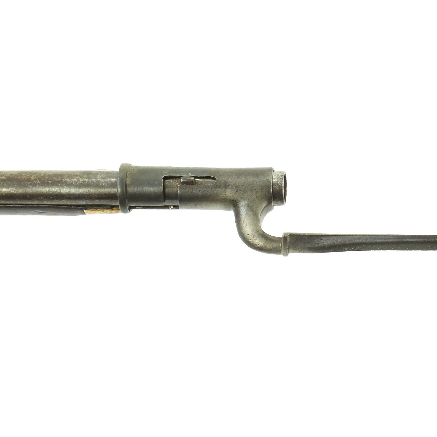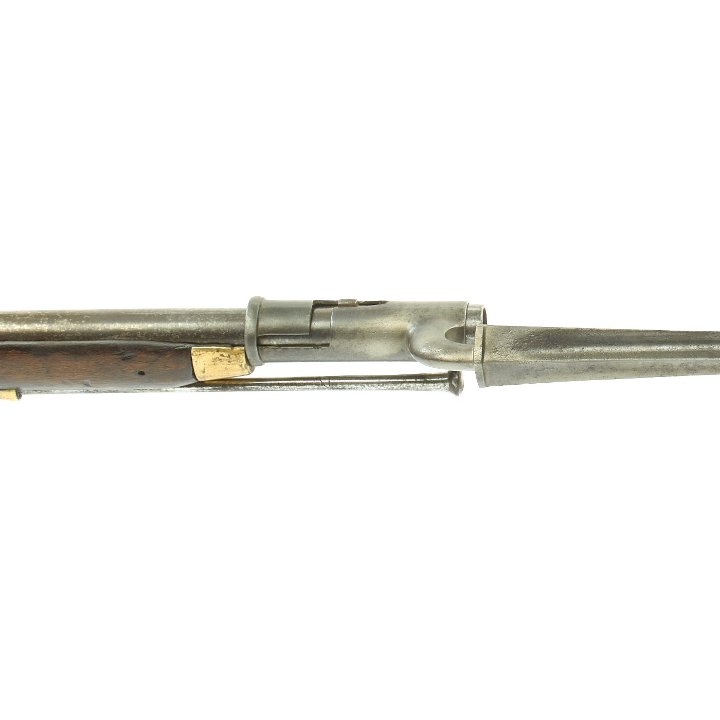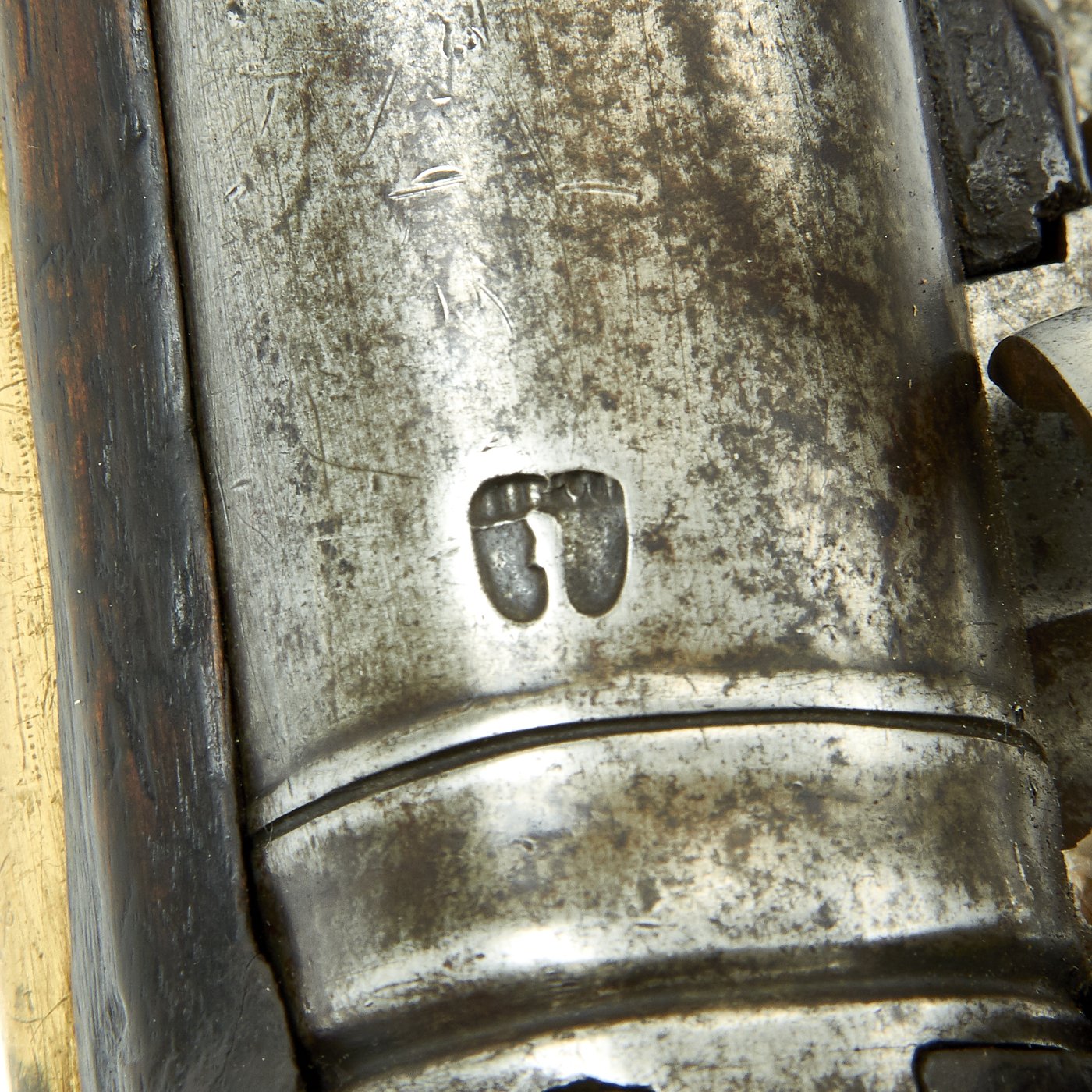 This magnificent example, easily the best we ever had, and we did get over 1800 units in all sorts of conditions, was itself removed from the Officer's Mess display. The barrel has the pair of bare foot prints proof mark for NAKKU, and the socket bayonet, itself bears a single foot print proof mark. The socket bayonet also bears faux E.I.C. markings to give the impression that this was imported but that is not the case.