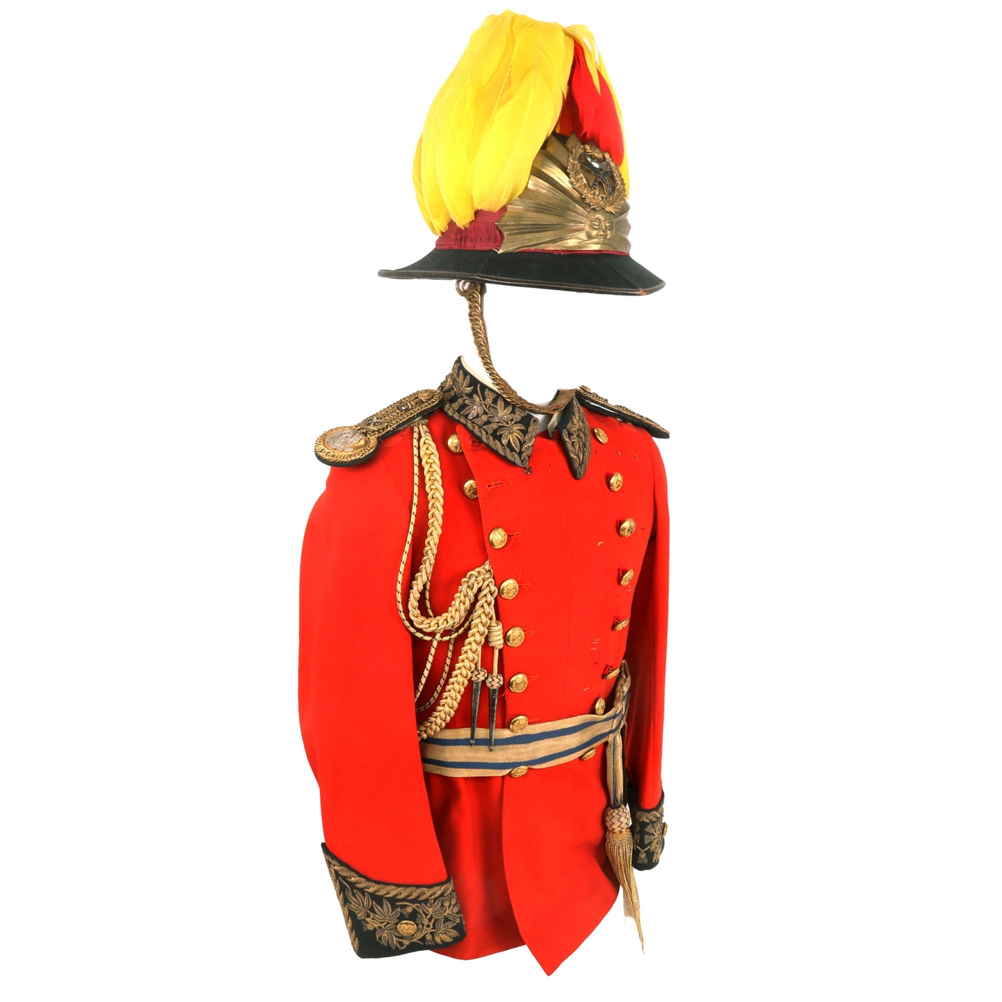 Officers gilt linked and silver (not hallmarked) undress shoulder scales and twist cord dress aiguillettes still accompany the tunic. Fine quality gilt metal officers tunic buttons to the uniform back marked Ranken. The breast has a variety of medal / award loops for breast orders awarded. Fine quality quilted padded lining to the interior of the tunic. Tailors label was removed. Accompanied by the matching full dress trousers in green cloth with thick red stripe to the leg. Superb pair of officers full dress epaulettes also accompany the uniform set, with silver and gilt insignias applied (not hallmarked). Waist sash with brass clip mount and knot tassels.