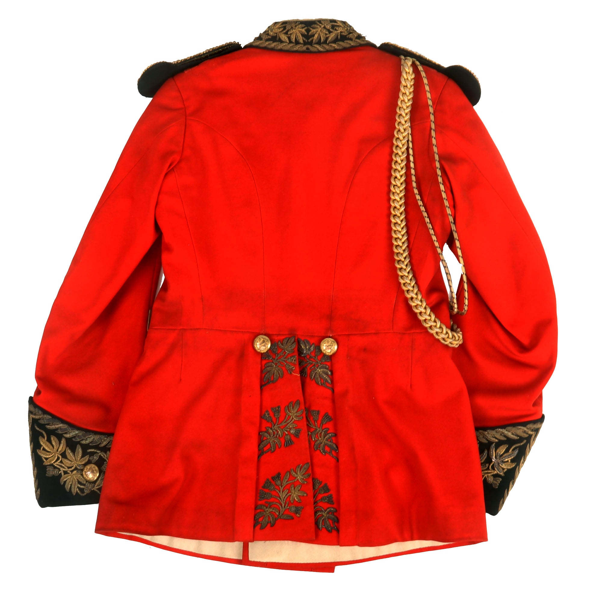 Superb quality double breasted scarlet full dress uniform with dark green facings. The collar and cuffs are heavily embroidered with gold wire decoration. Uniform and accessories retailed by bespoke tailors Ranken & Co, Calcutta.