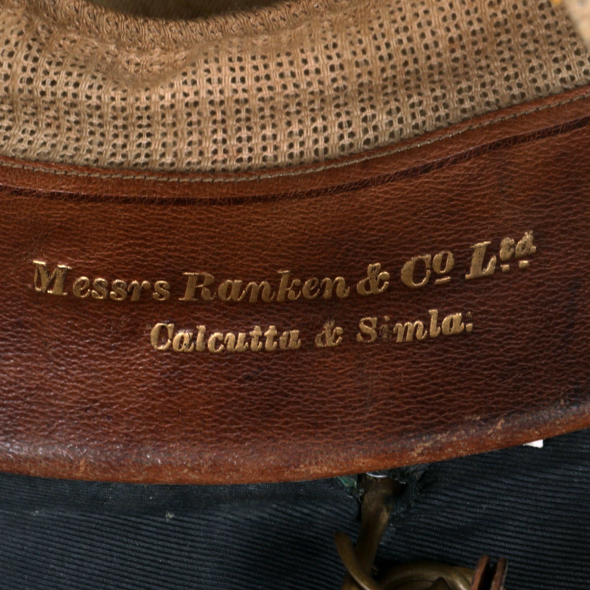Rare solar topee helmet of cork construction with green cloth covering. Impressive large central rayed helmet plate with central face and applied wreath enclosing crossed silver Kukris with crescent moon and sun above. Crimson silk pagri to the helmet. Interior retains the original leather sweatband with gilt tooled tailors / retailers details of "Messrs Ranken & Co Ltd Calcutta & Simla". Marker marked on the lining to HAWKES & CO. London. Leather backed linked brass chin chain. With the helmet is the original full dress plume of yellow feathers over red and come complete with a Jappaned tin holder.