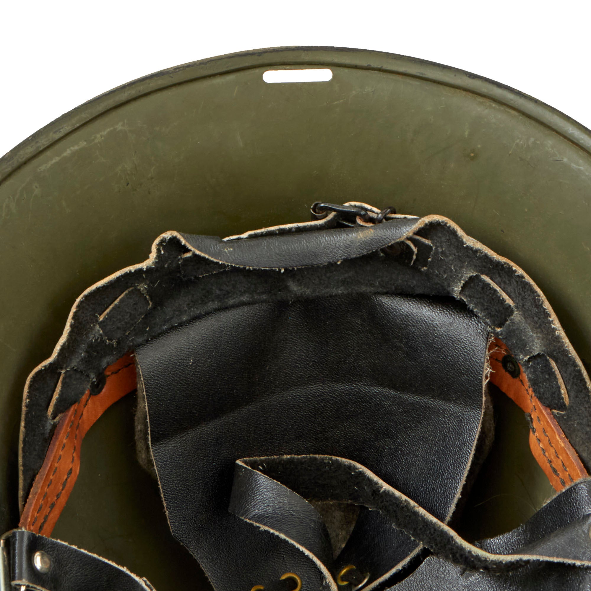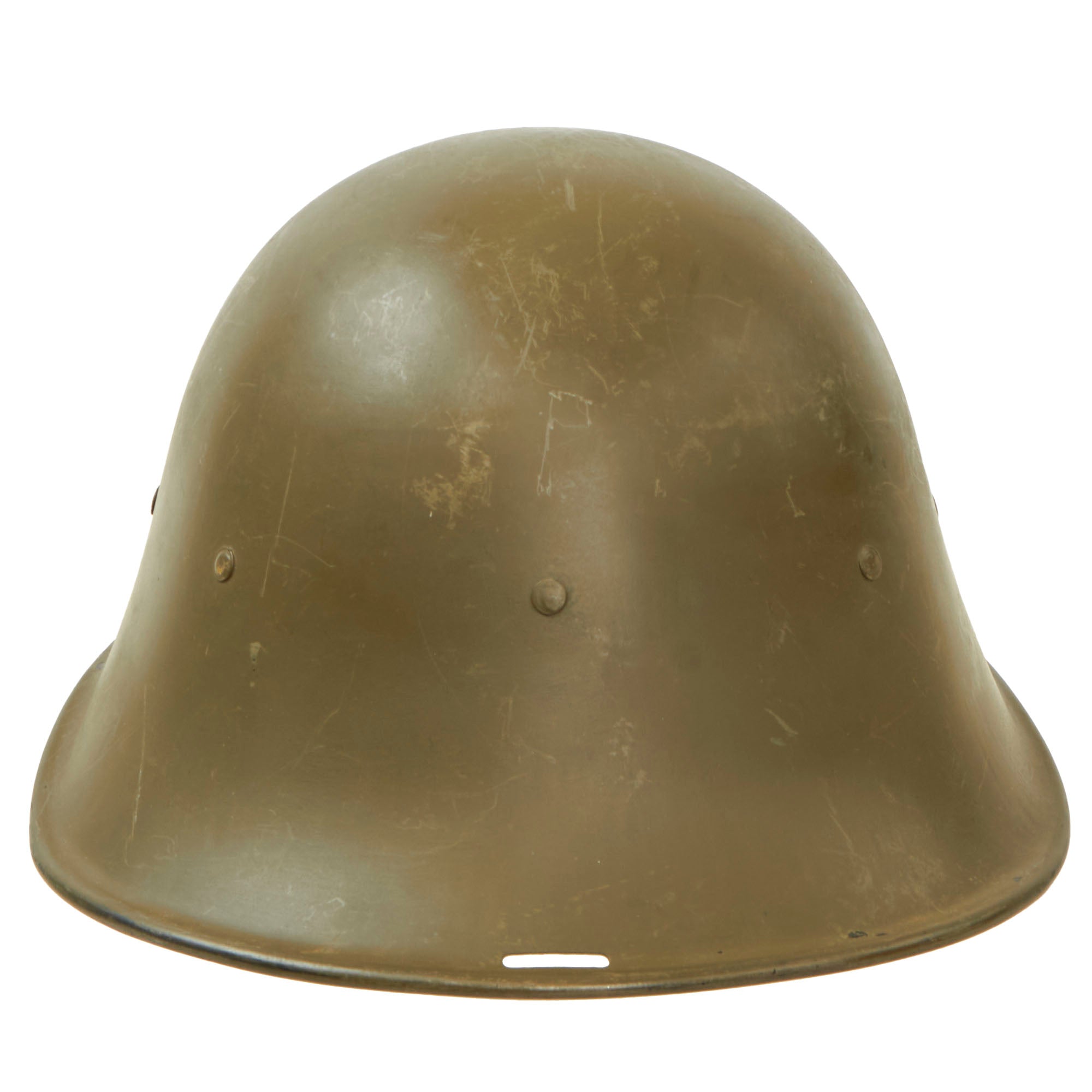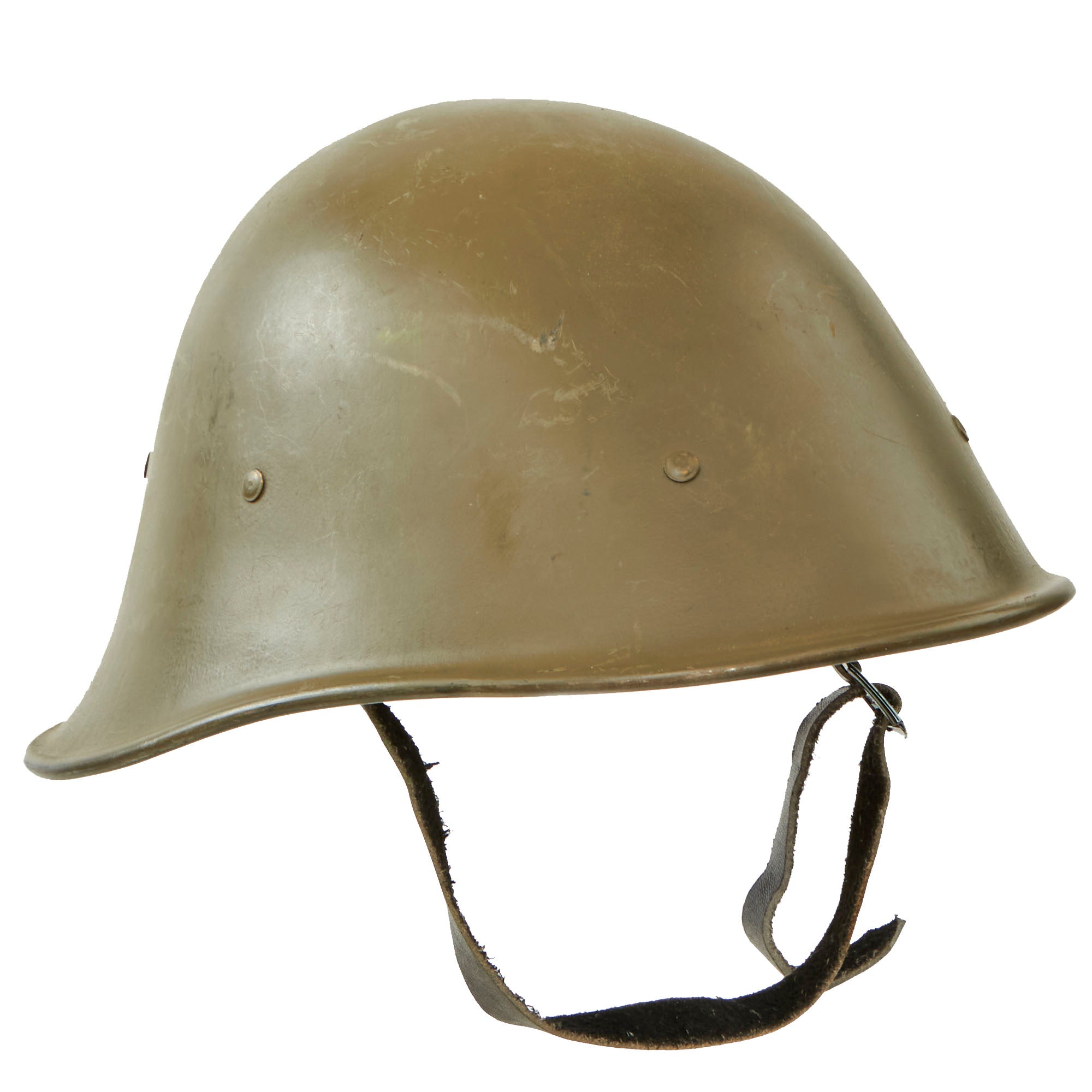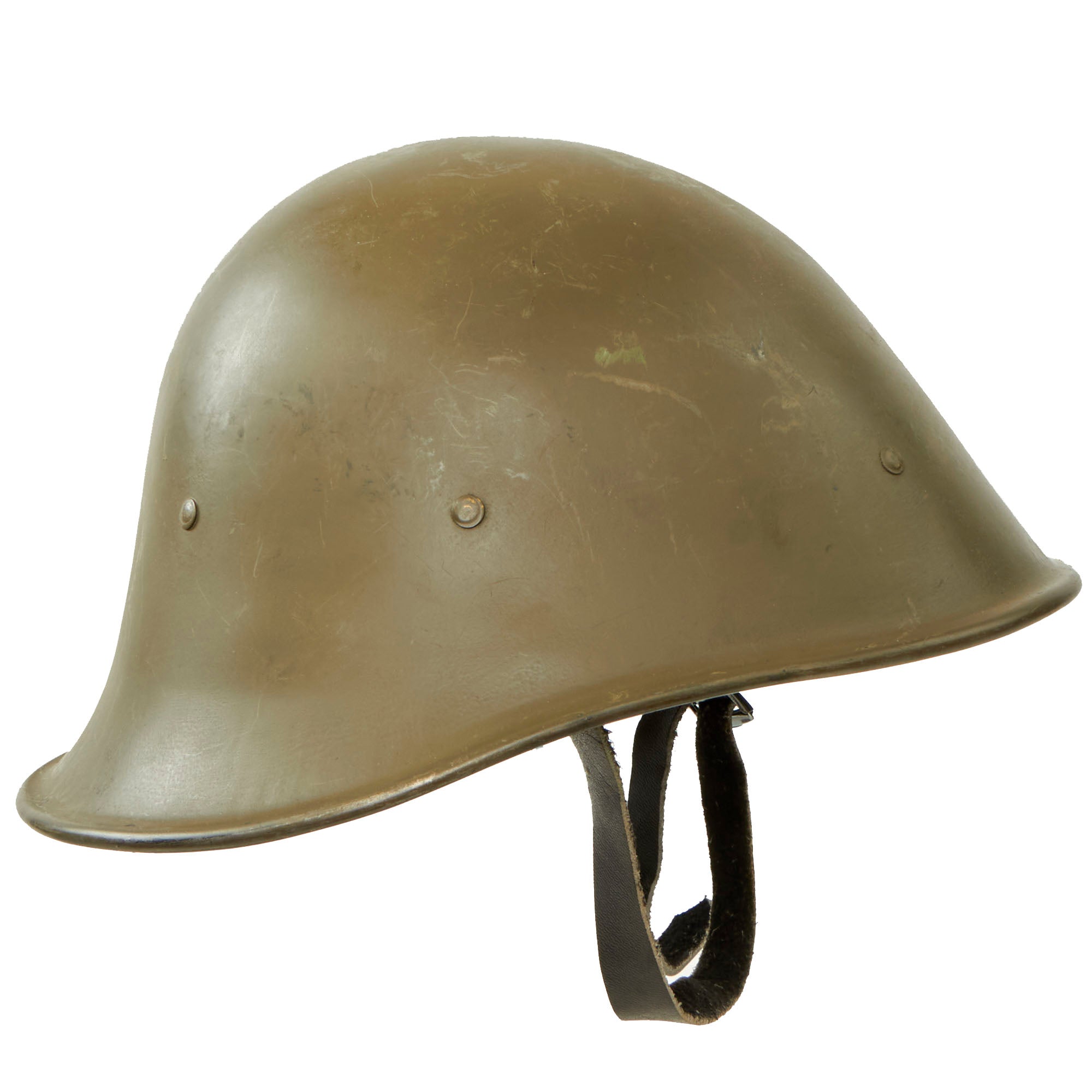 Original Item: Only One Available. This is a genuine original M34 Dutch WW2 helmet. Steel construction with original paint, correct three section leather liner, with central draw string. The inlaid copper shield is not present on this helmet, as this is for exportation purposes. Overall condition is very good, size is approximately 7 1/4 (58cm). Chinstrap is present.