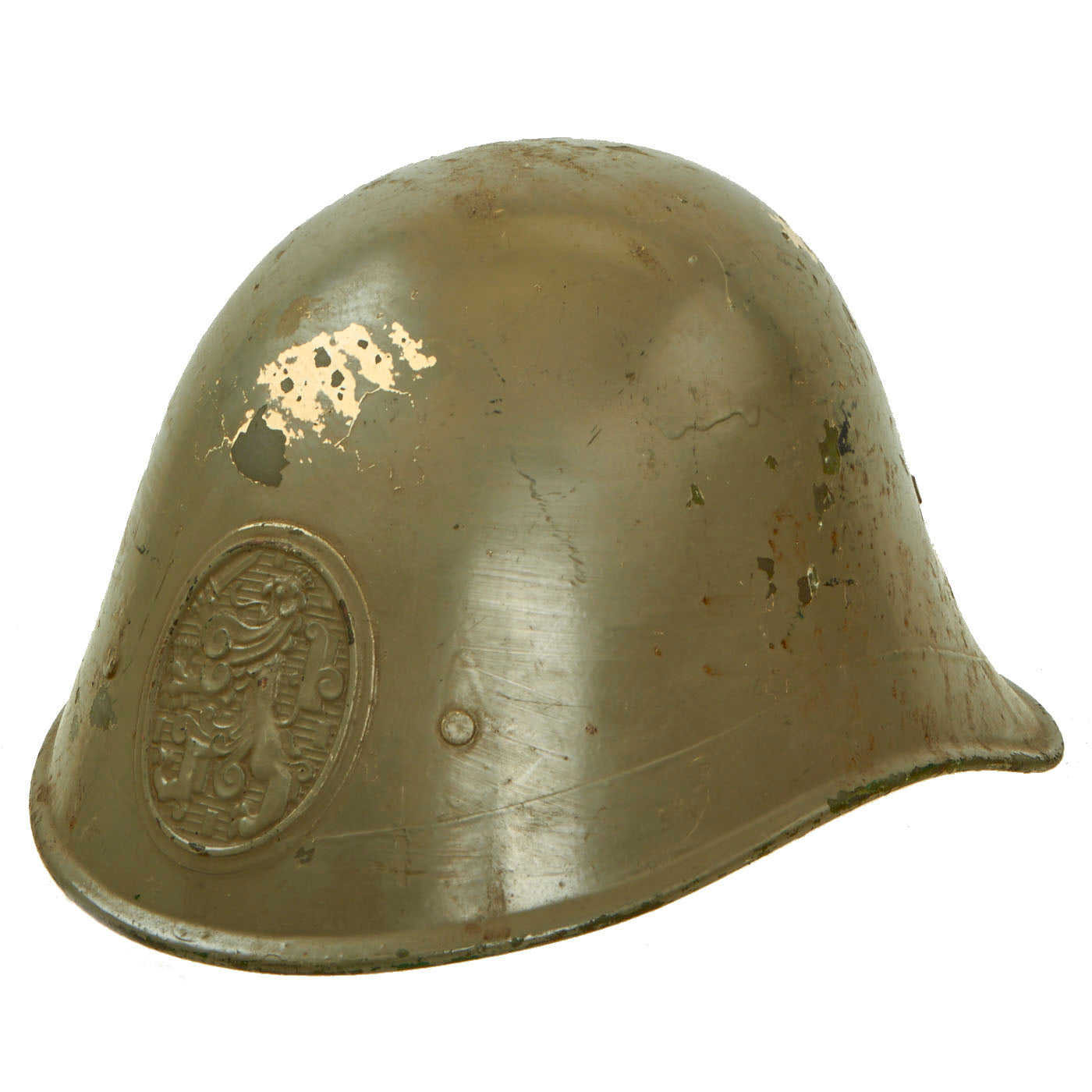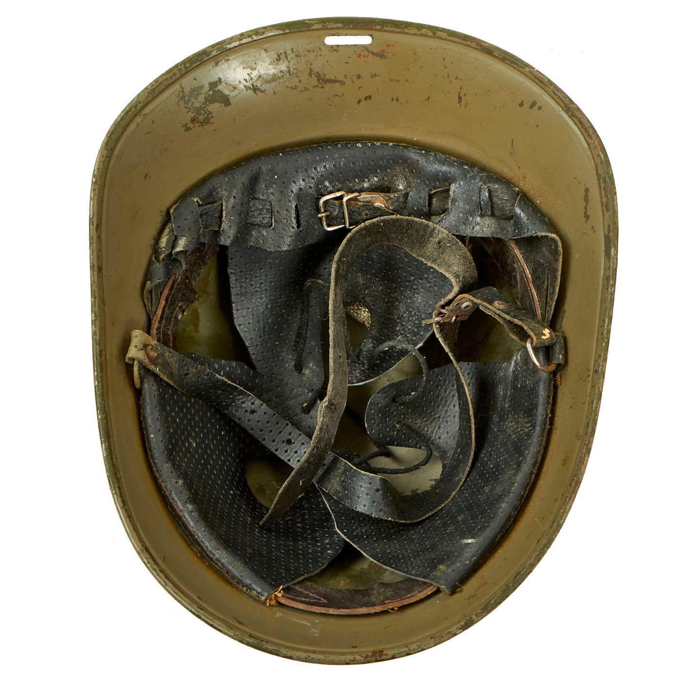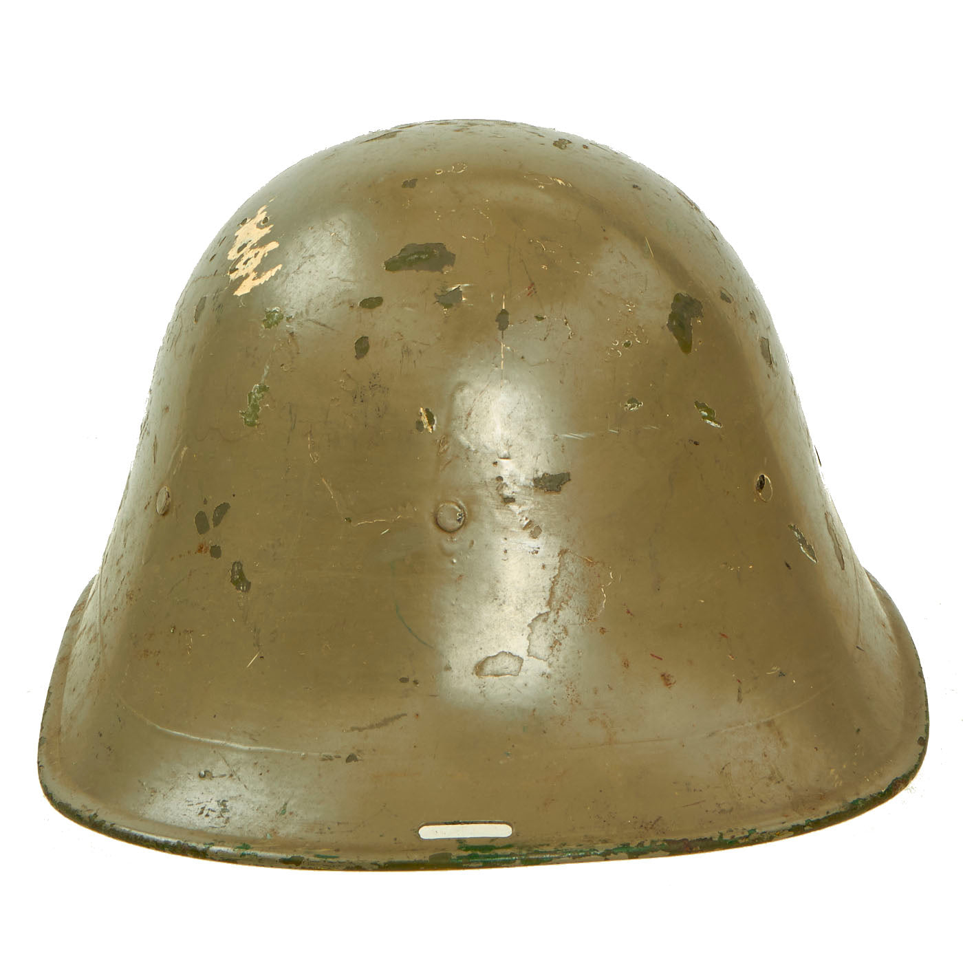 Original Item: Only One Available. This is a genuine original M34 Dutch WW2 helmet. Steel construction with original paint, correct three section leather liner, with central draw string. The inlaid copper shield depicting the Dutch Republic Lion or the Coat of Arms of the Netherlands was removed indicating this was used by resistance fighters after occupation by the German forces, however this one is still present and in lovely condition. Overall condition is very good, size is approximately 7 1/4 (58cm). Chinstrap is partially present.