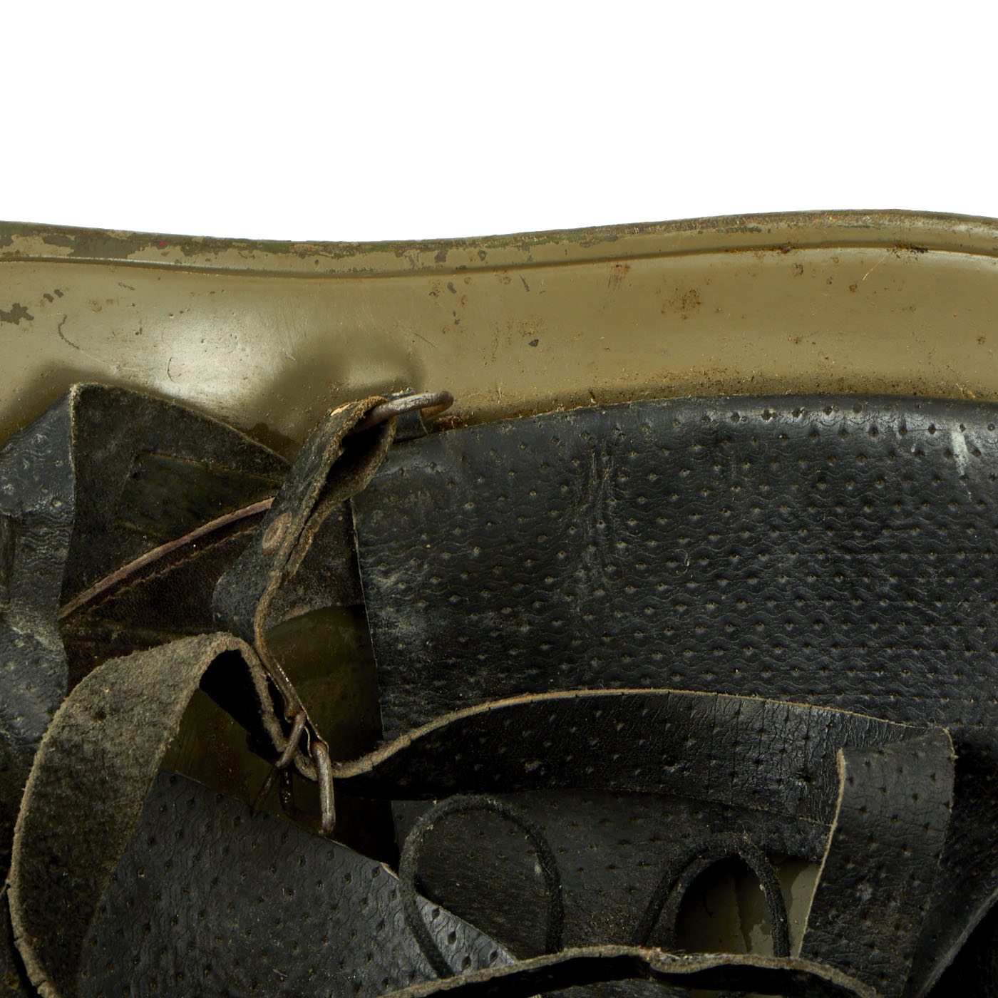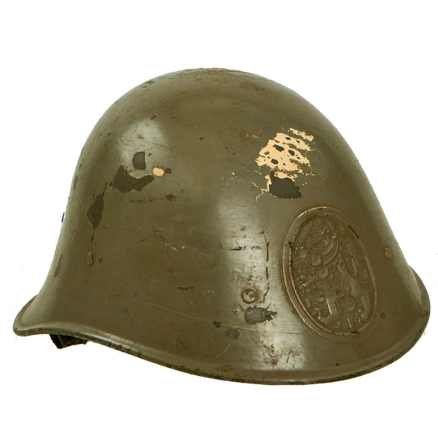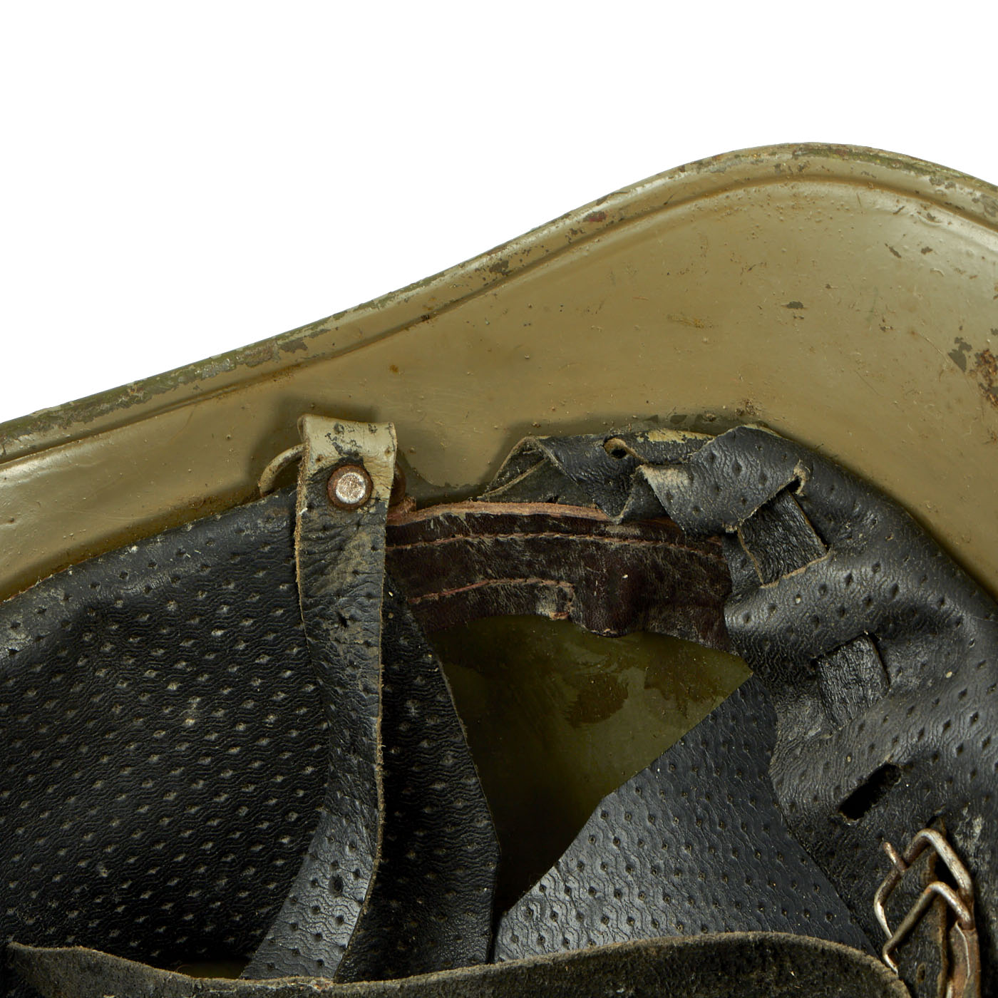 Original Item: Only One Available. This is a genuine original M34 Dutch WW2 helmet. Steel construction with original paint, correct three section leather liner, with central draw string. The inlaid copper shield depicting the Dutch Republic Lion or the Coat of Arms of the Netherlands was removed indicating this was used by resistance fighters after occupation by the German forces, however this one is still present and in lovely condition. Overall condition is very good, size is approximately 7 1/4 (58cm). Chinstrap is partially present.