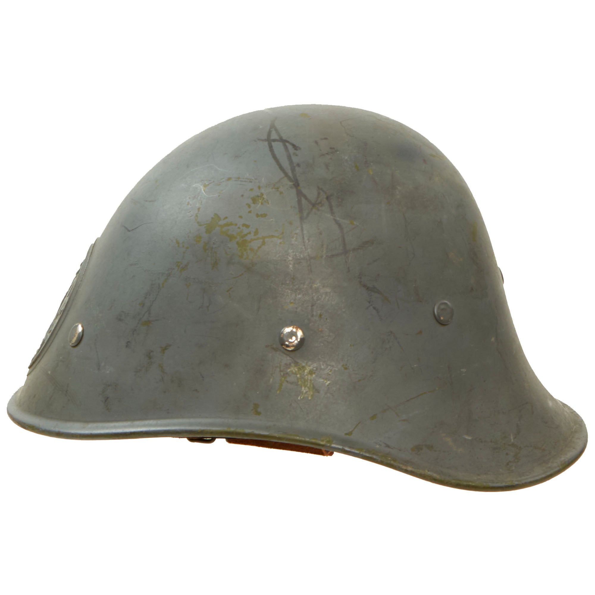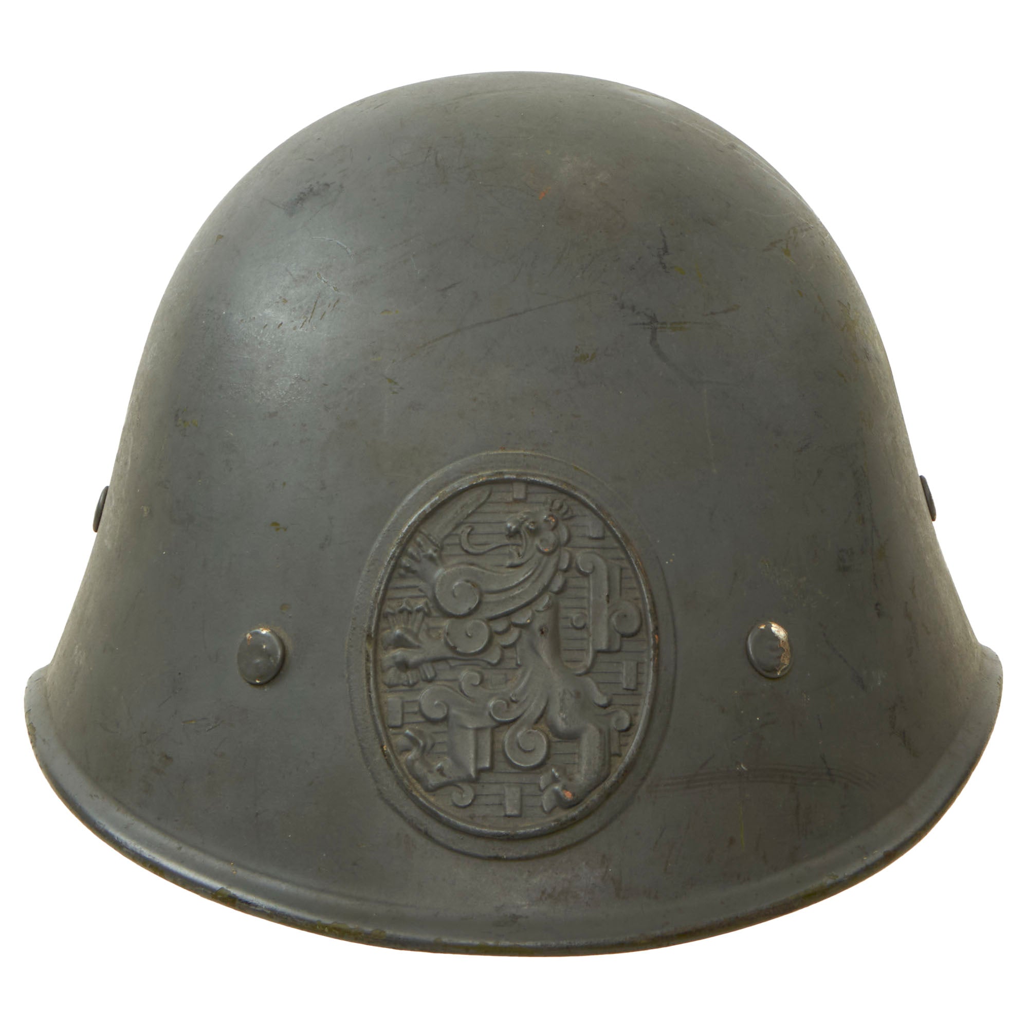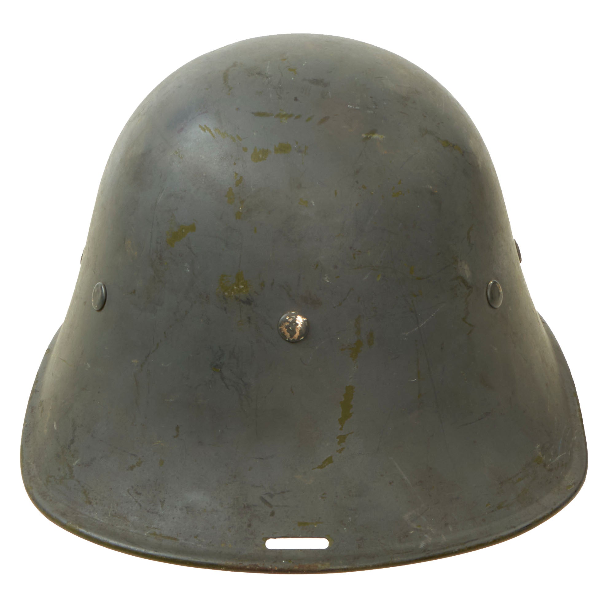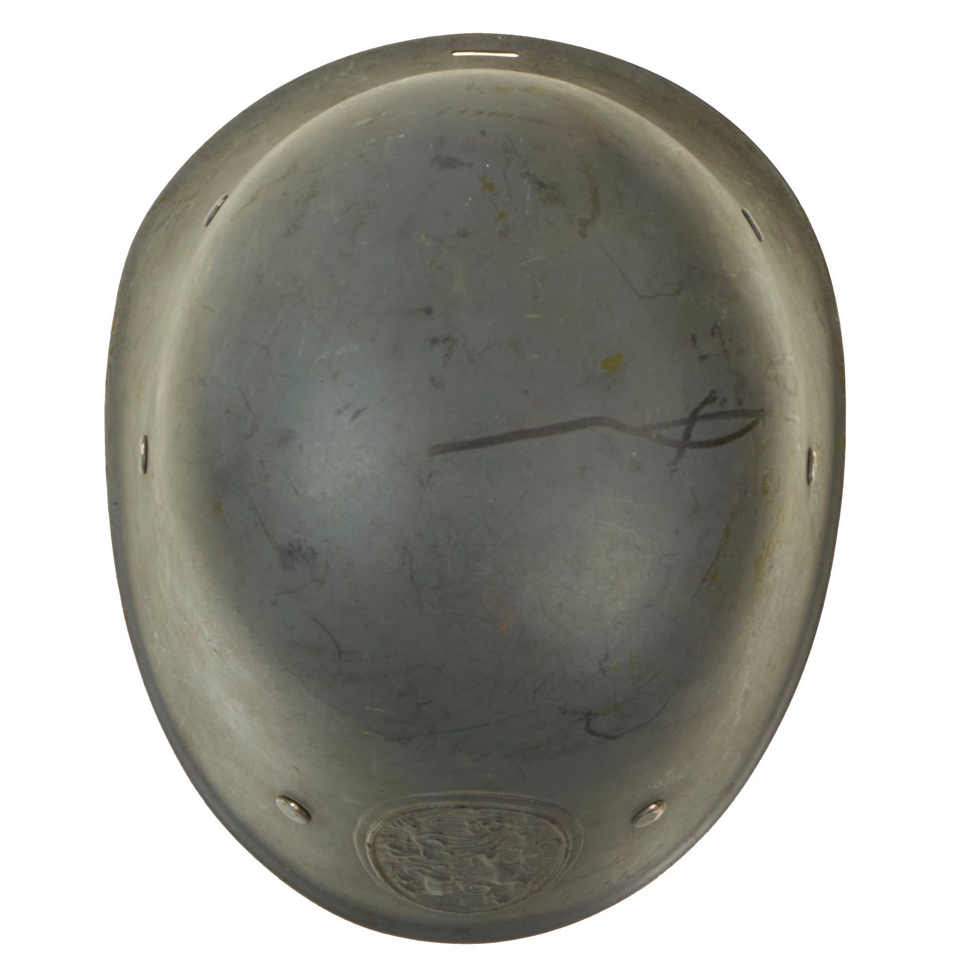 Original Item: Only One Available. This is a genuine original M34 Dutch WW2 helmet. Steel construction with original paint (we have been informed that the paint and liner may be post war 1950s period but this has not been verified, as research sources for this information are contradictory), correct three section leather liner, with central drawstring. The inlaid copper shield depicting the Dutch Republic Lion or the Coat of Arms of the Netherlands is present. Overall condition is very good, size is approximately 7 1/4 (58cm). Chinstrap is present.