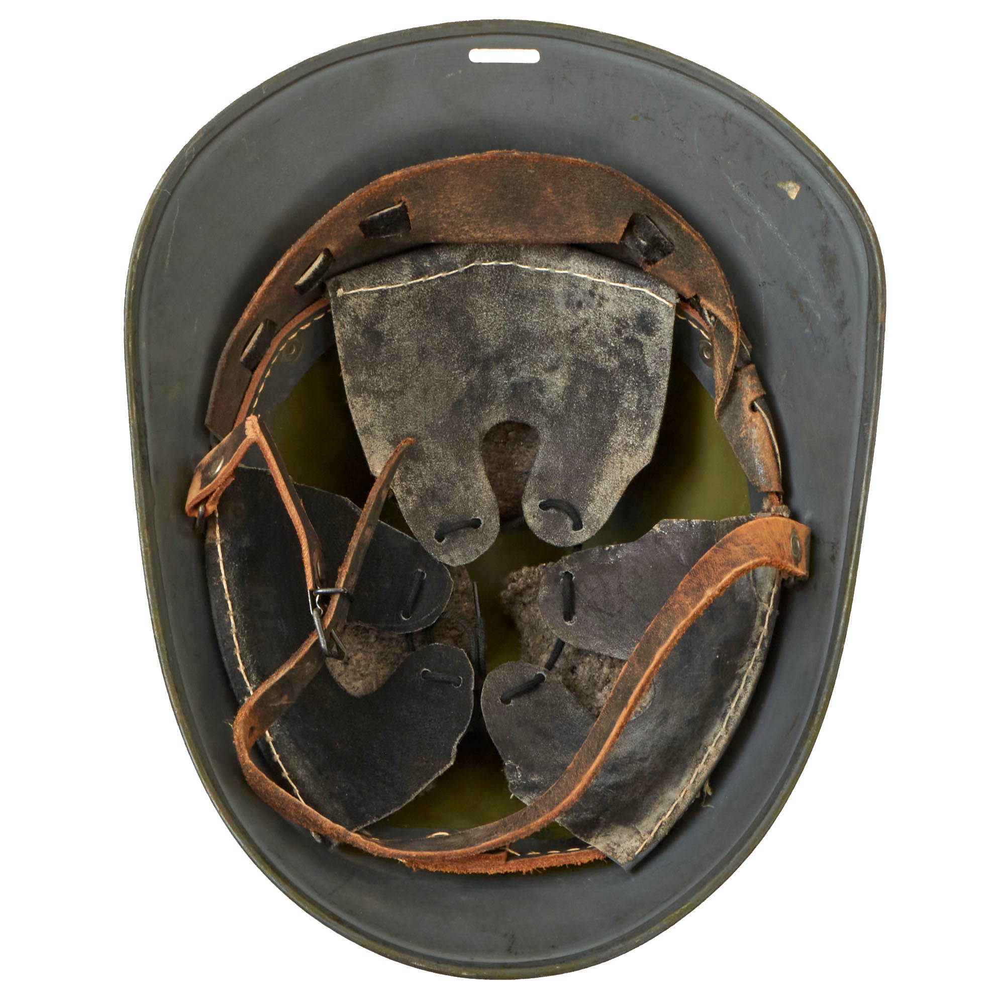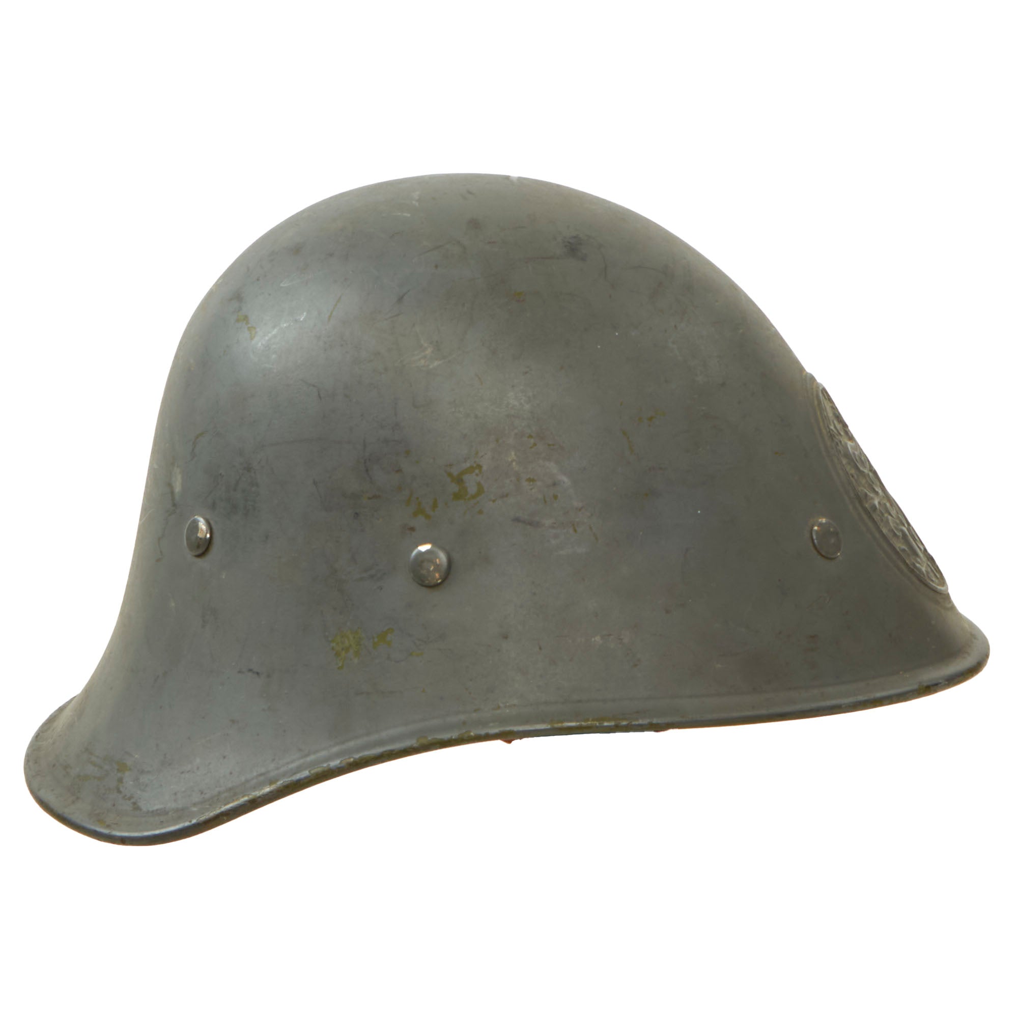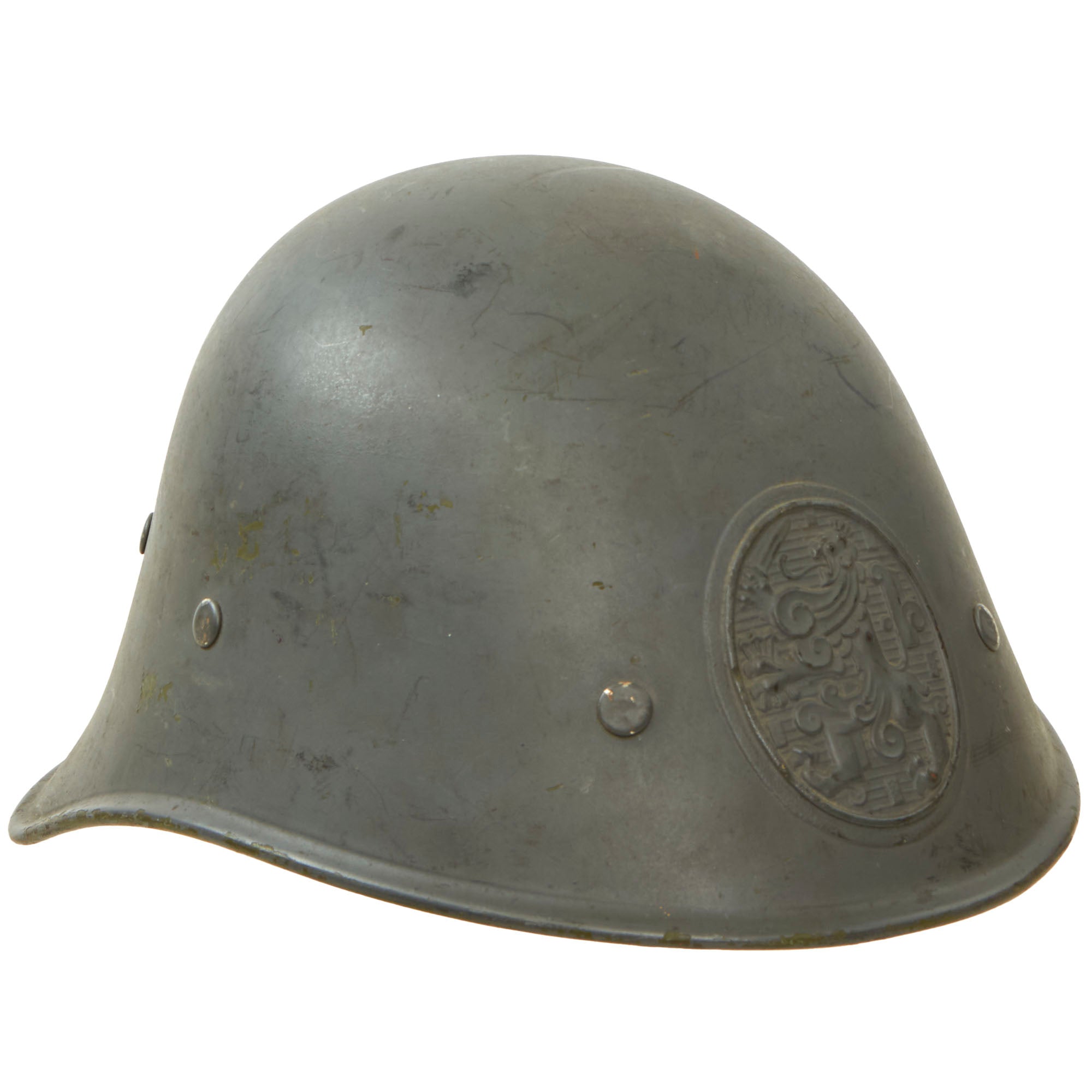 Original Item: Only One Available. This is a genuine original M34 Dutch WW2 helmet. Steel construction with original paint (we have been informed that the paint and liner may be post war 1950s period but this has not been verified, as research sources for this information are contradictory), correct three section leather liner, with central drawstring. The inlaid copper shield depicting the Dutch Republic Lion or the Coat of Arms of the Netherlands is present. Overall condition is very good, size is approximately 7 1/4 (58cm). Chinstrap is present.