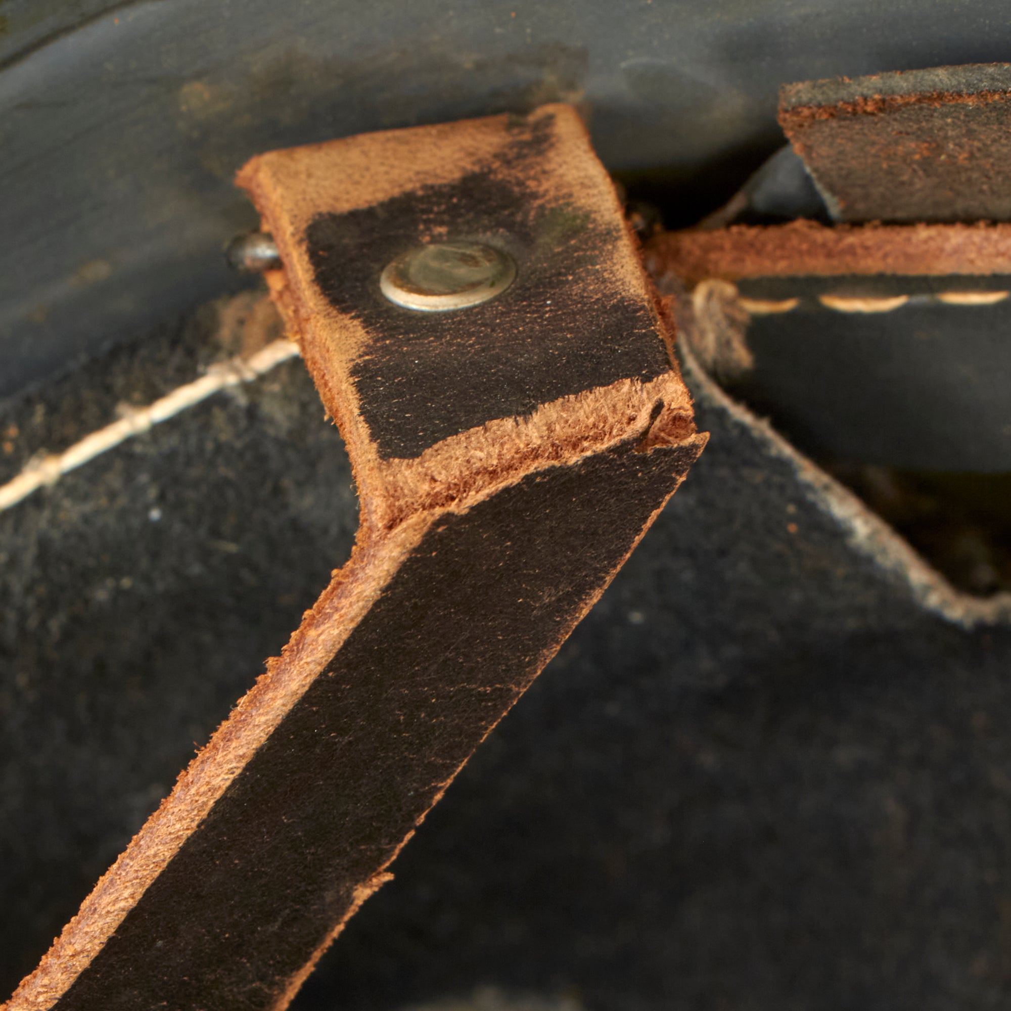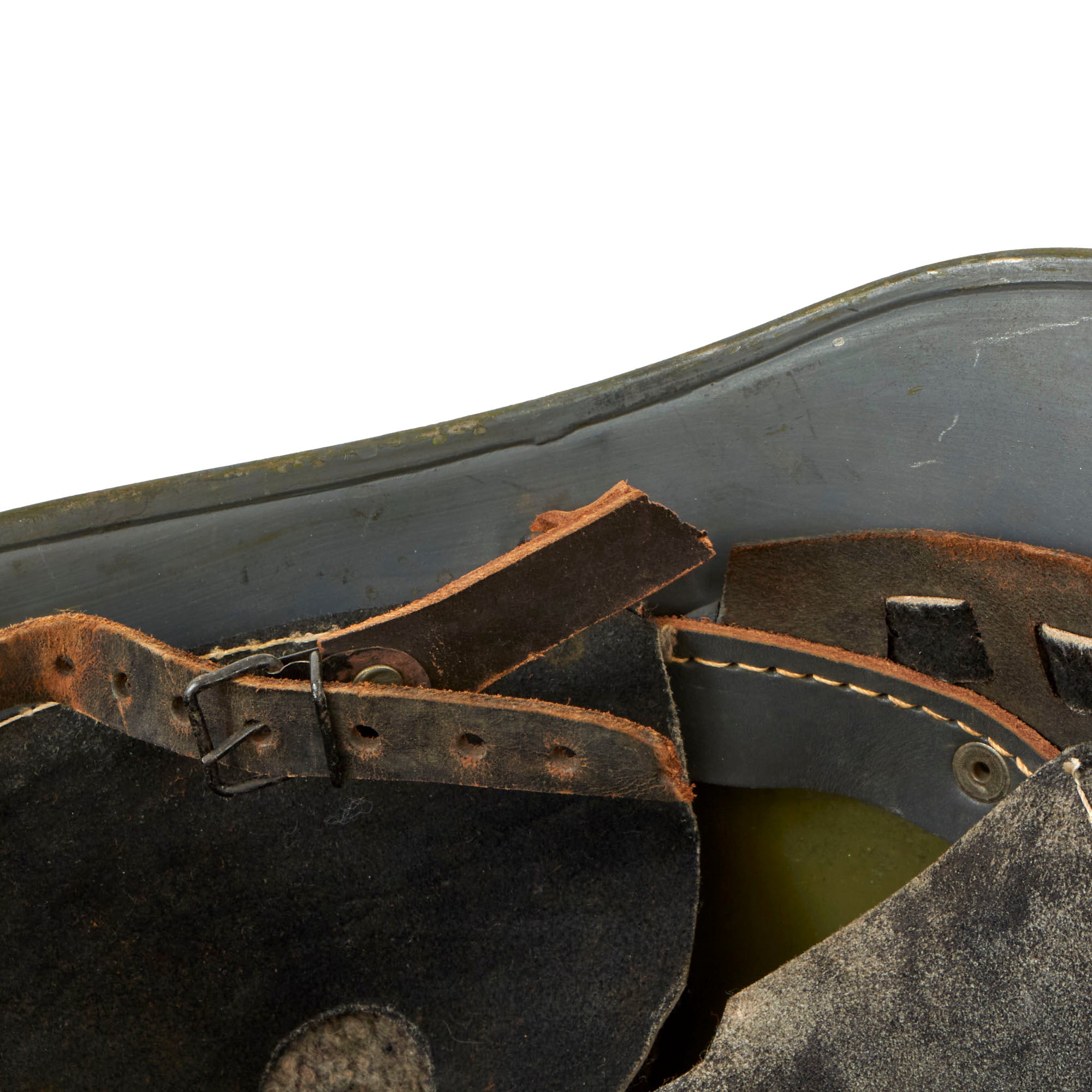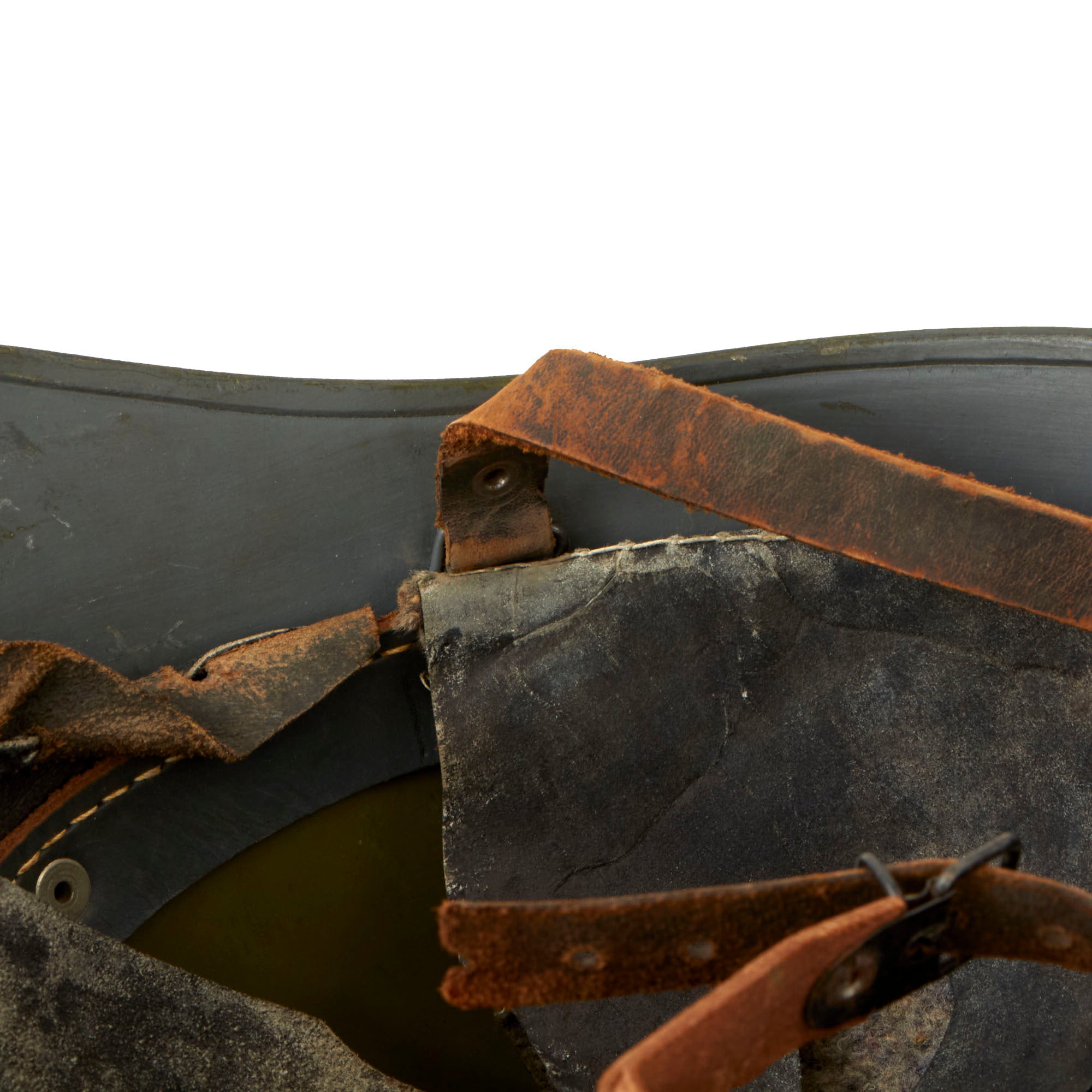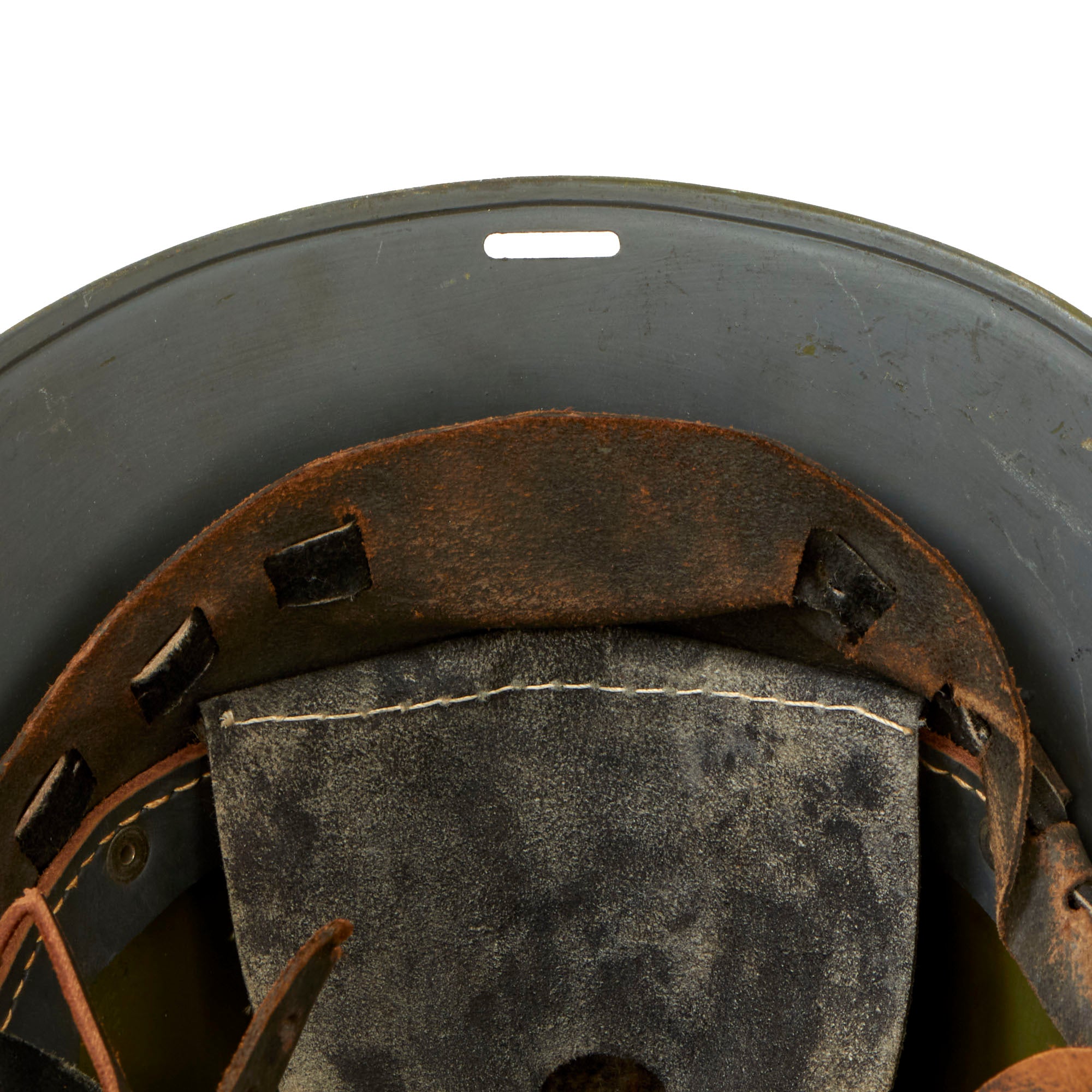 Original Item: Only One Available. This is a genuine original M34 Dutch WW2 helmet. Steel construction with original paint (we have been informed that the paint and liner may be post war 1950s period but this has not been verified, as research sources for this information are contradictory), correct three section leather liner, with central drawstring. The inlaid copper shield depicting the Dutch Republic Lion or the Coat of Arms of the Netherlands is present. Overall condition is very good, size is approximately 7 1/4 (58cm). Chinstrap is present.