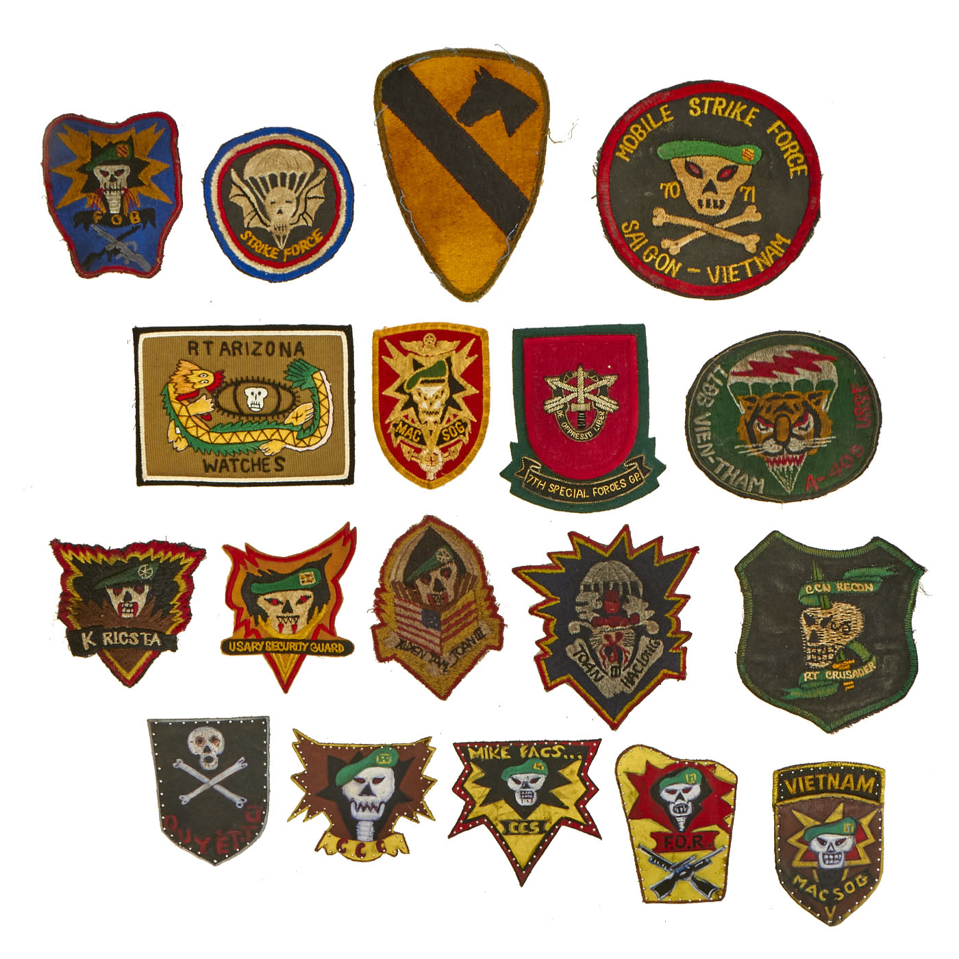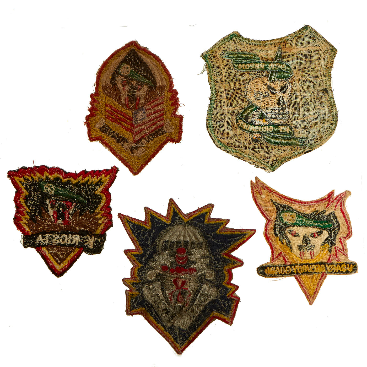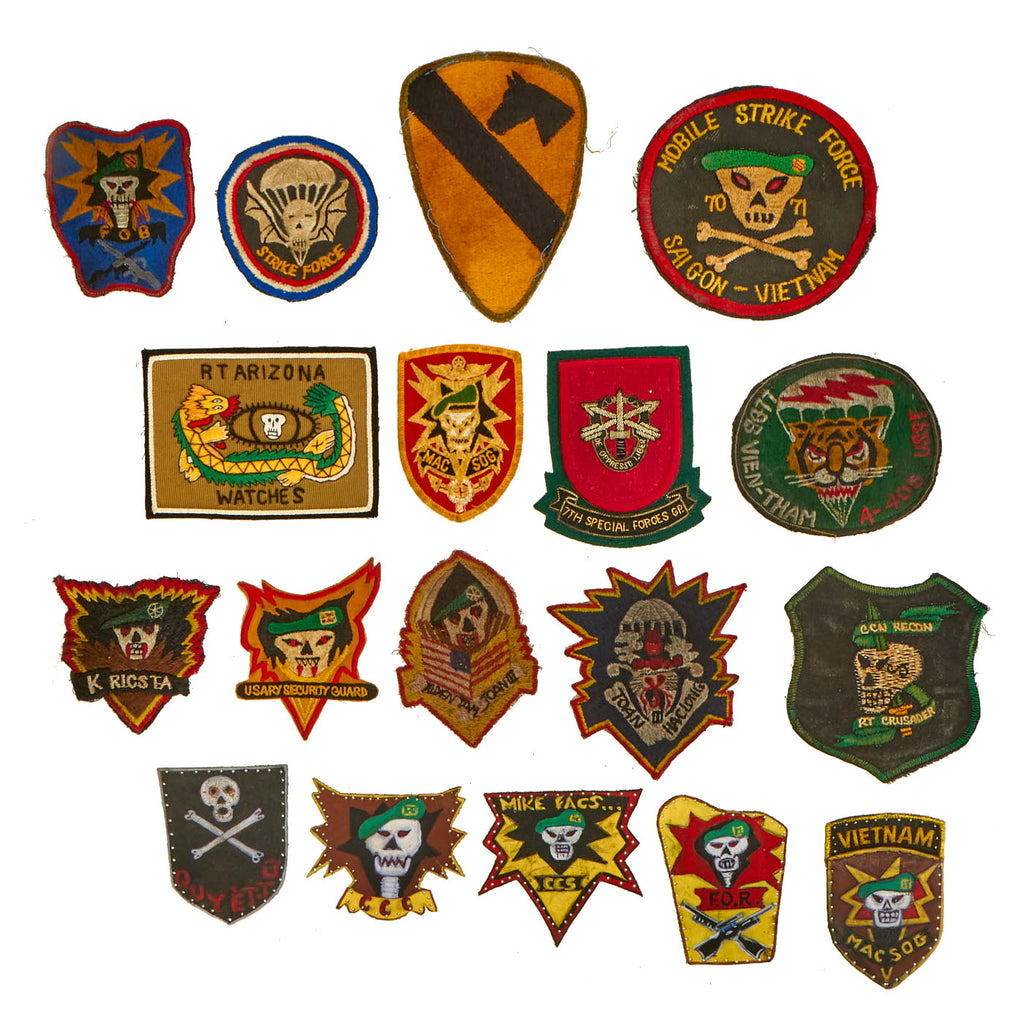 Original and New Items: Only One Lot of 18 Available. This is a lovely assortment of Special FOrces related shoulder sleeve insignias. The 5 Painted Leather patches are more modern replications of original insignia, but it is our belief that the other 13 patches are original manufacture.