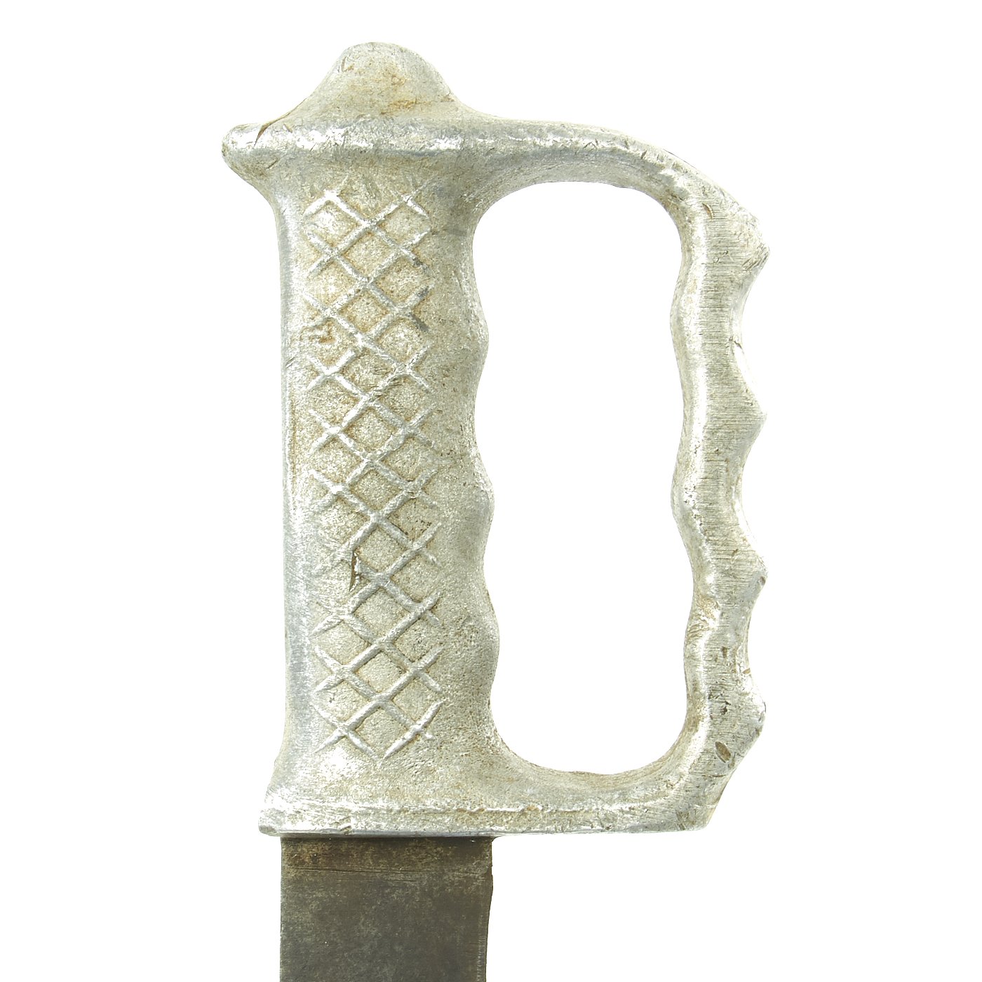 Original Item: A fantastic genuine WWII example of a New Zealand made commando aluminum handle fighting knuckle knife with original leather scabbard. This style knife is a hard to find very rare version. A nearly identical knife is featured in the book FIGHTING KNIVES by Frederick Stephens on page 53 as well as on the front and back cover.