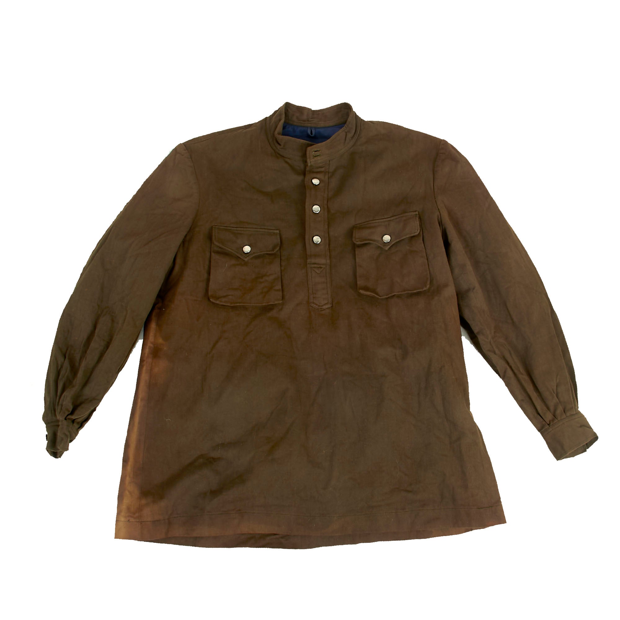 The Gymnastroika is a pullover, in the same style worn by Russians during both World Wars. The buttons appear to be nickel-plated steel, but they could be chrome-plated. All buttons are retained, as are the pocket buttons. The interior has a blue lining which is marked below the neck with Korean characters and 28, which could be the size. The material of the shirt has held up very well.