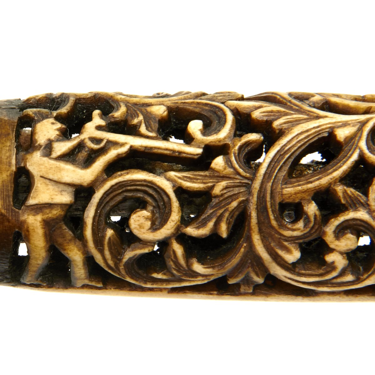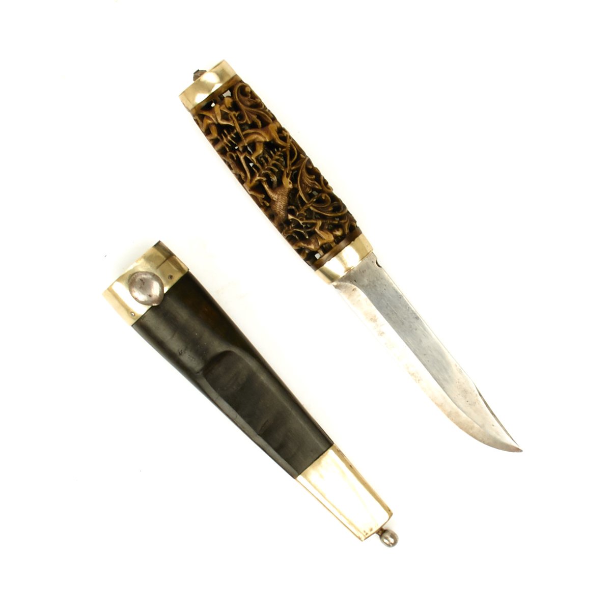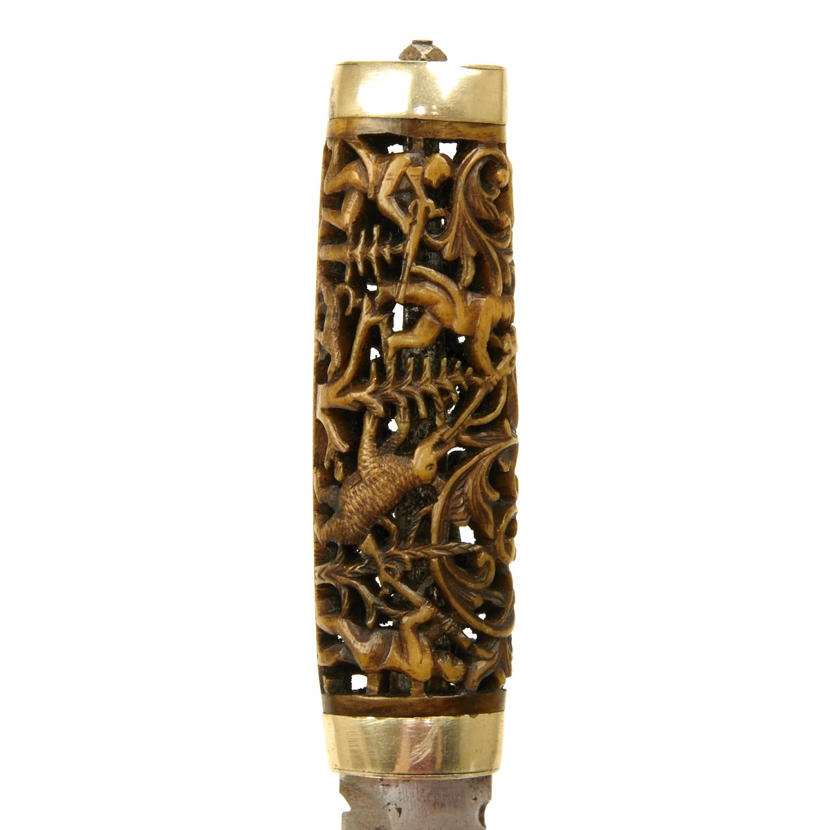 Single edge 4.5 blade with slight bowie point mounted into a spectacular intricately hand carved stag horn grip with negative space. The scene portrays huntsmen with antique rifles hunting both deer and bear amid scroll foliage. Mounted in silver on both grip ends.
