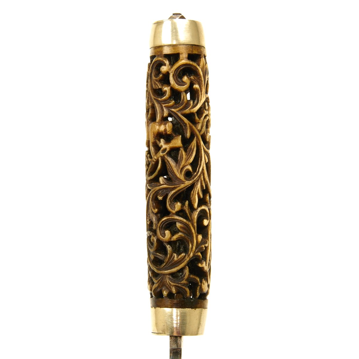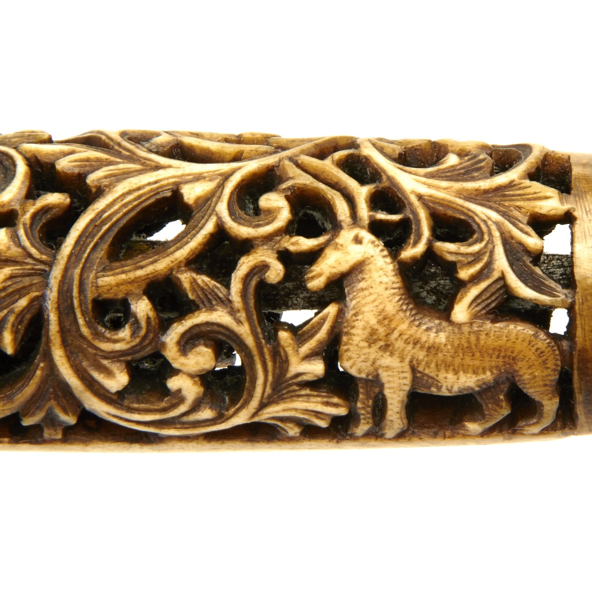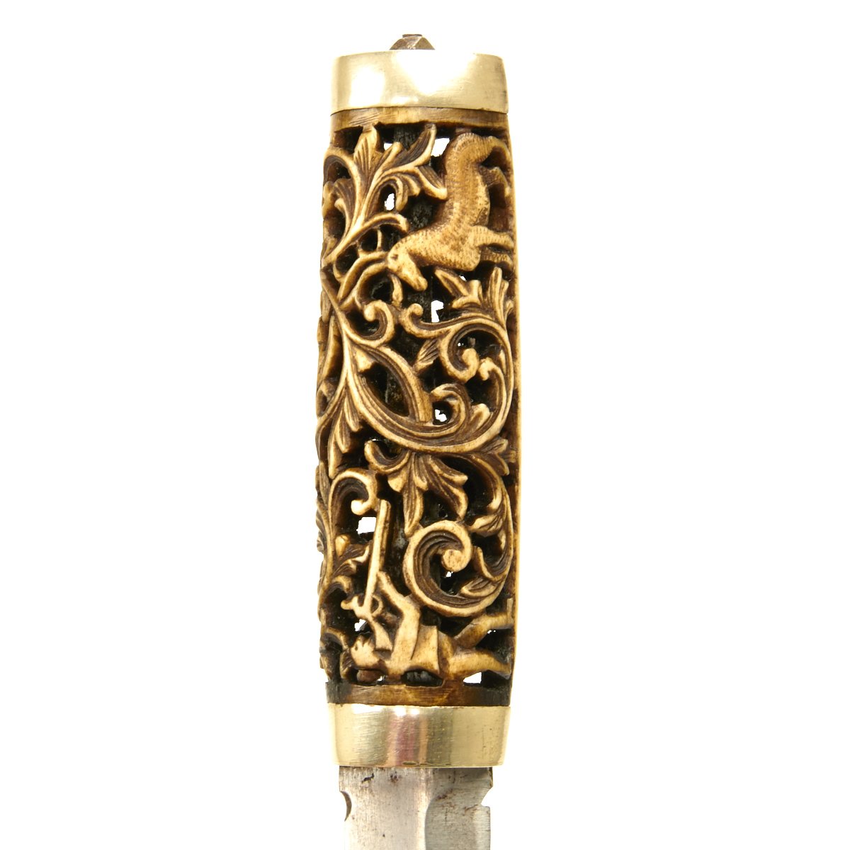 Single edge 4.5 blade with slight bowie point mounted into a spectacular intricately hand carved stag horn grip with negative space. The scene portrays huntsmen with antique rifles hunting both deer and bear amid scroll foliage. Mounted in silver on both grip ends.