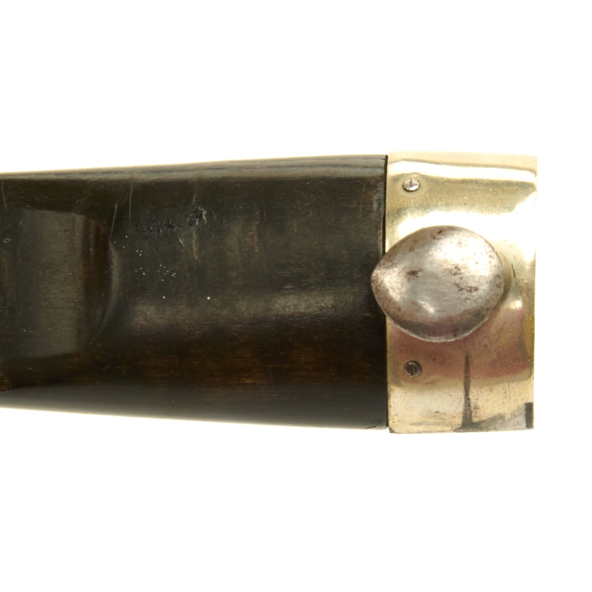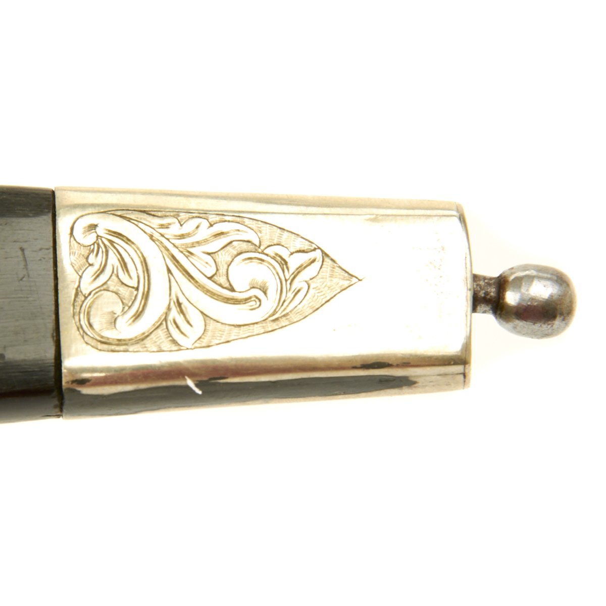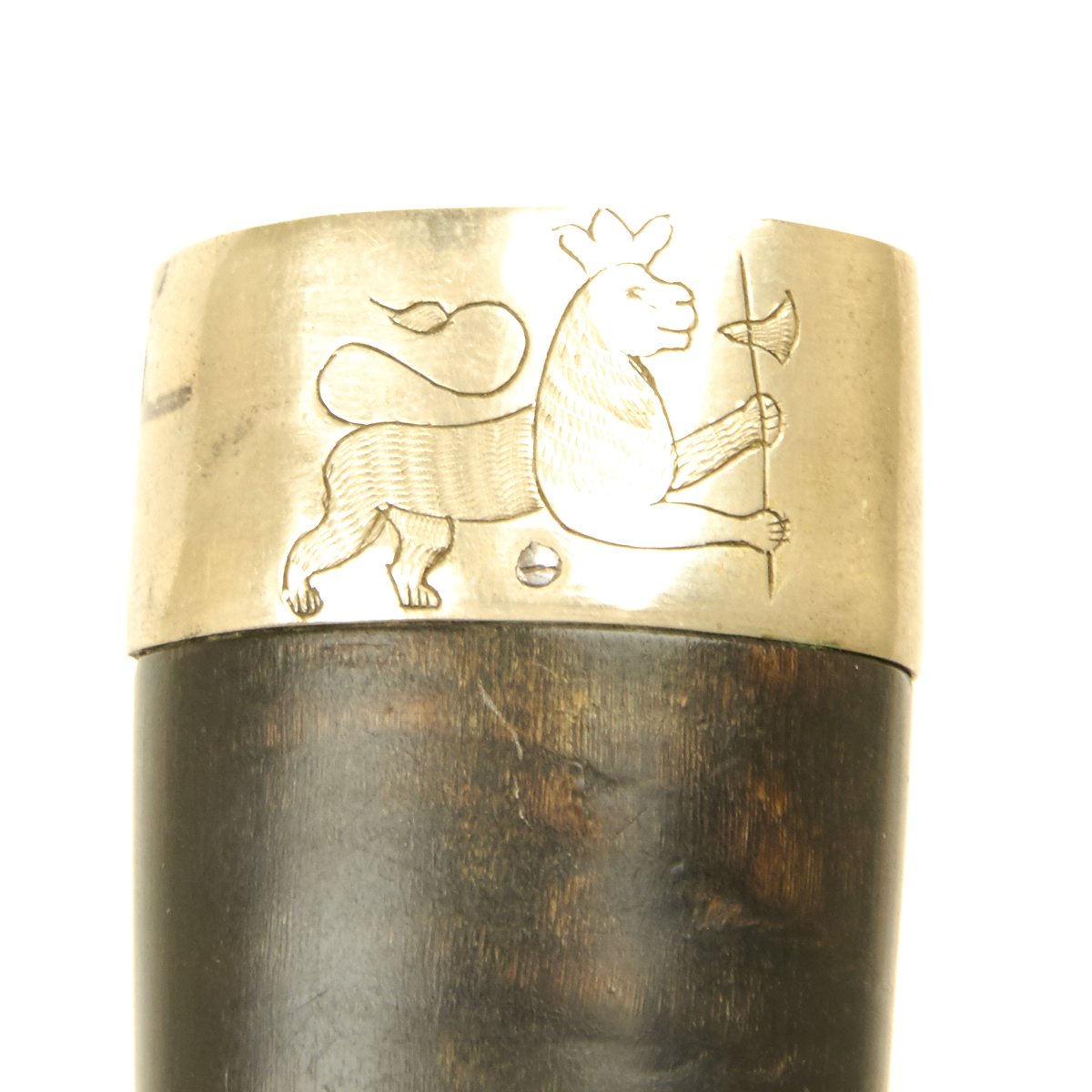 The blade is enclosed in a carved birchwood scabbard cut so very thin that it seems almost impossible to achieve by hand. The scabbard is also mounted in silver with engravings. The bottom with a floral motif and the top with Crowned Royal Norwegian Lion holding a war axe in both front paws.