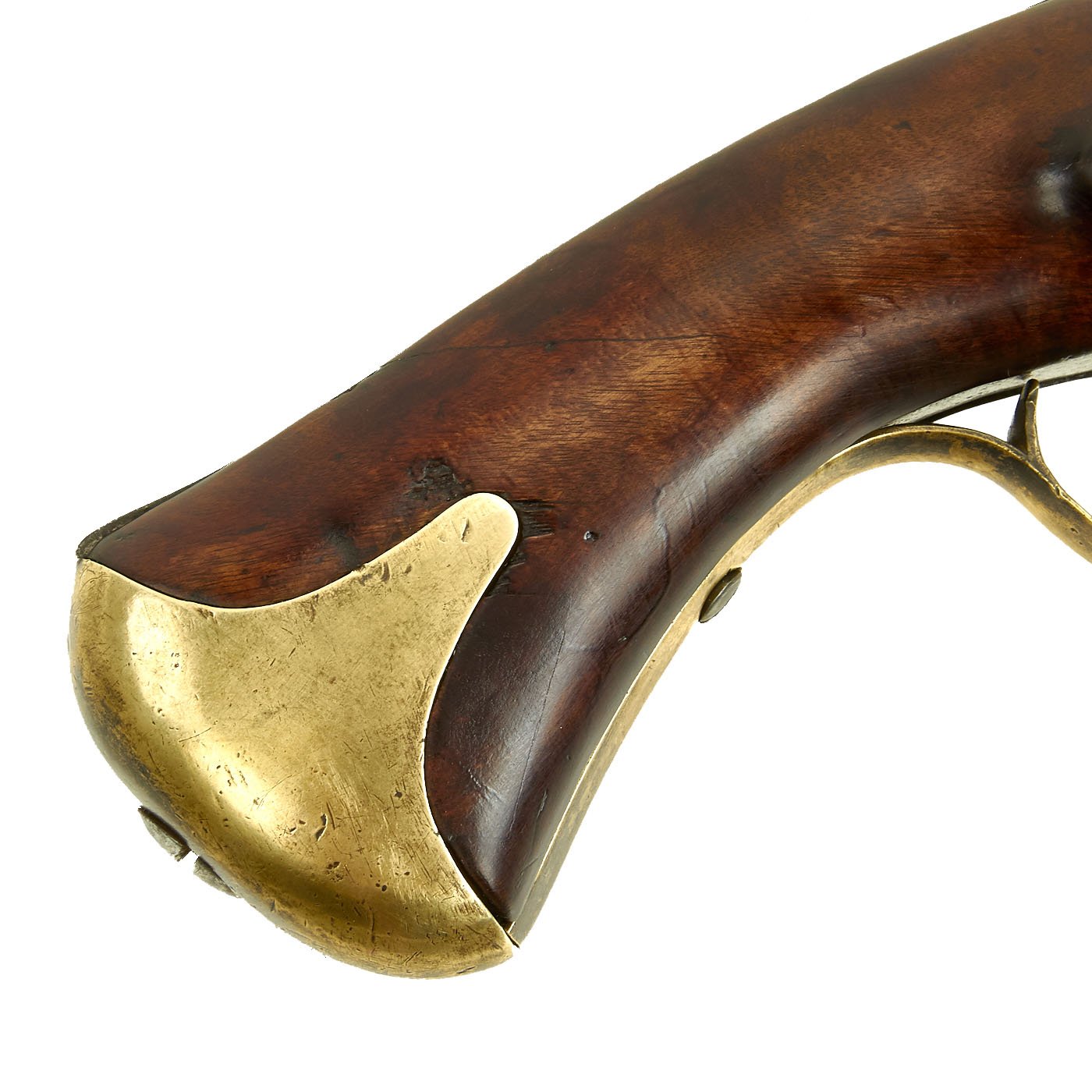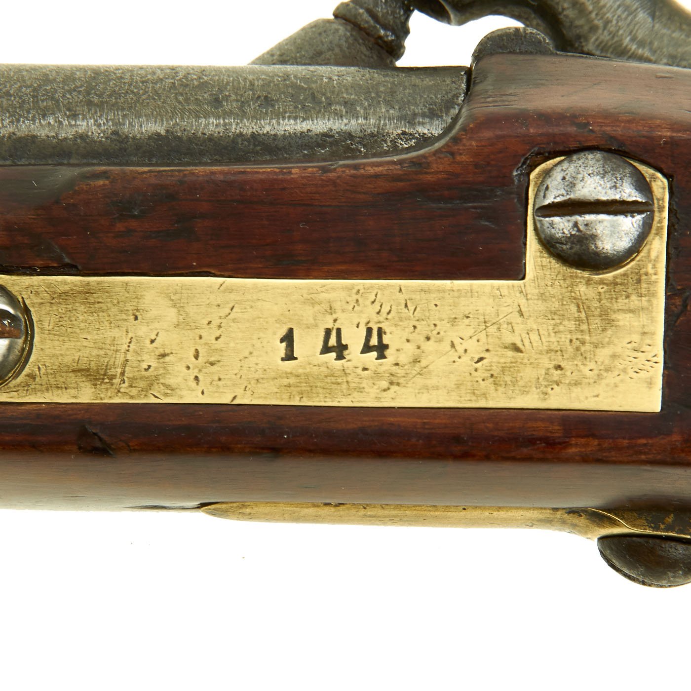 The pistol features all brass mounts of butt cap, trigger guard, side plate and nose cap. Not cut for any type of ram rod, the lock plate and side plate are both marked with serial number 144. A nearly identical pistol is pictured in Antique Arms by Wilkensen on page 78.