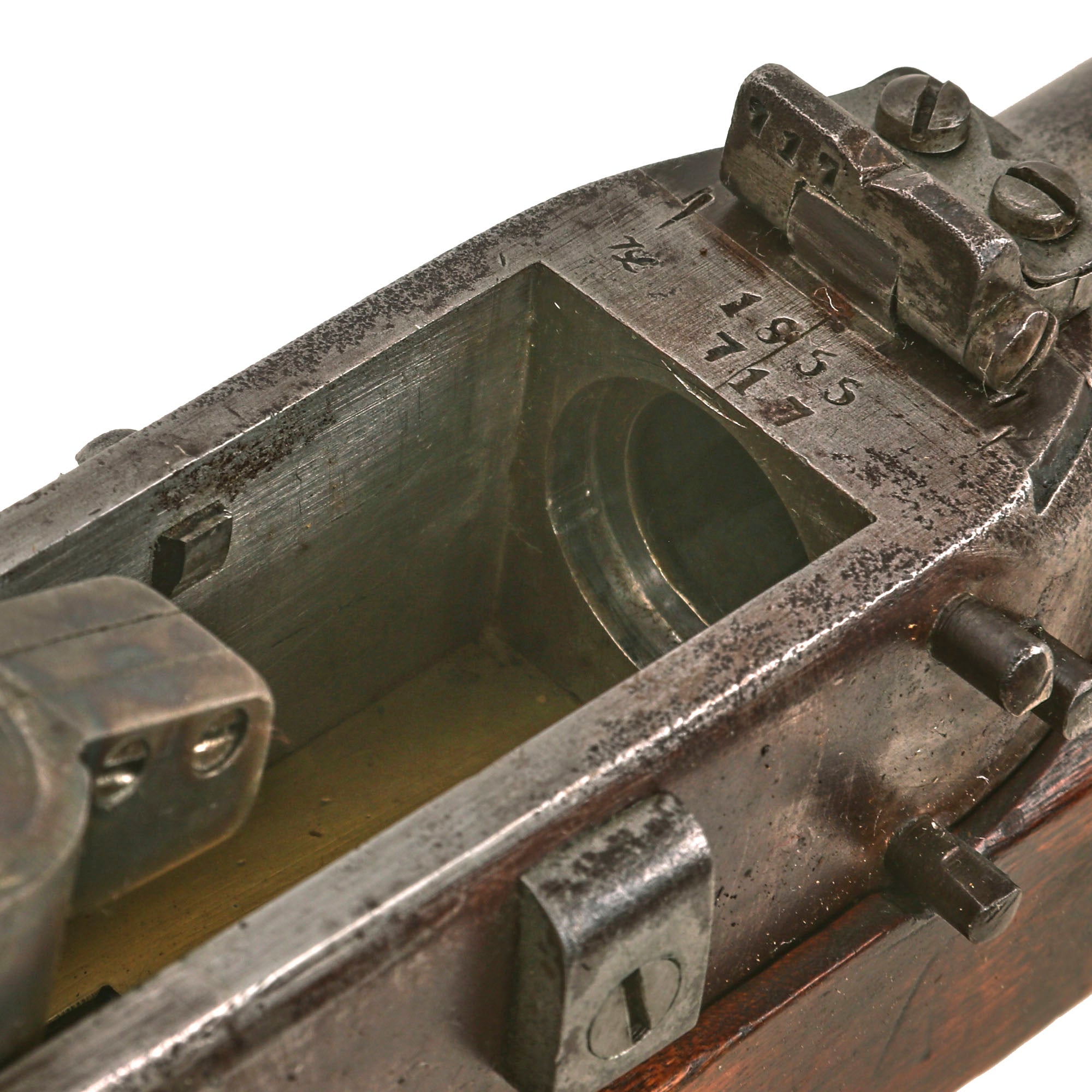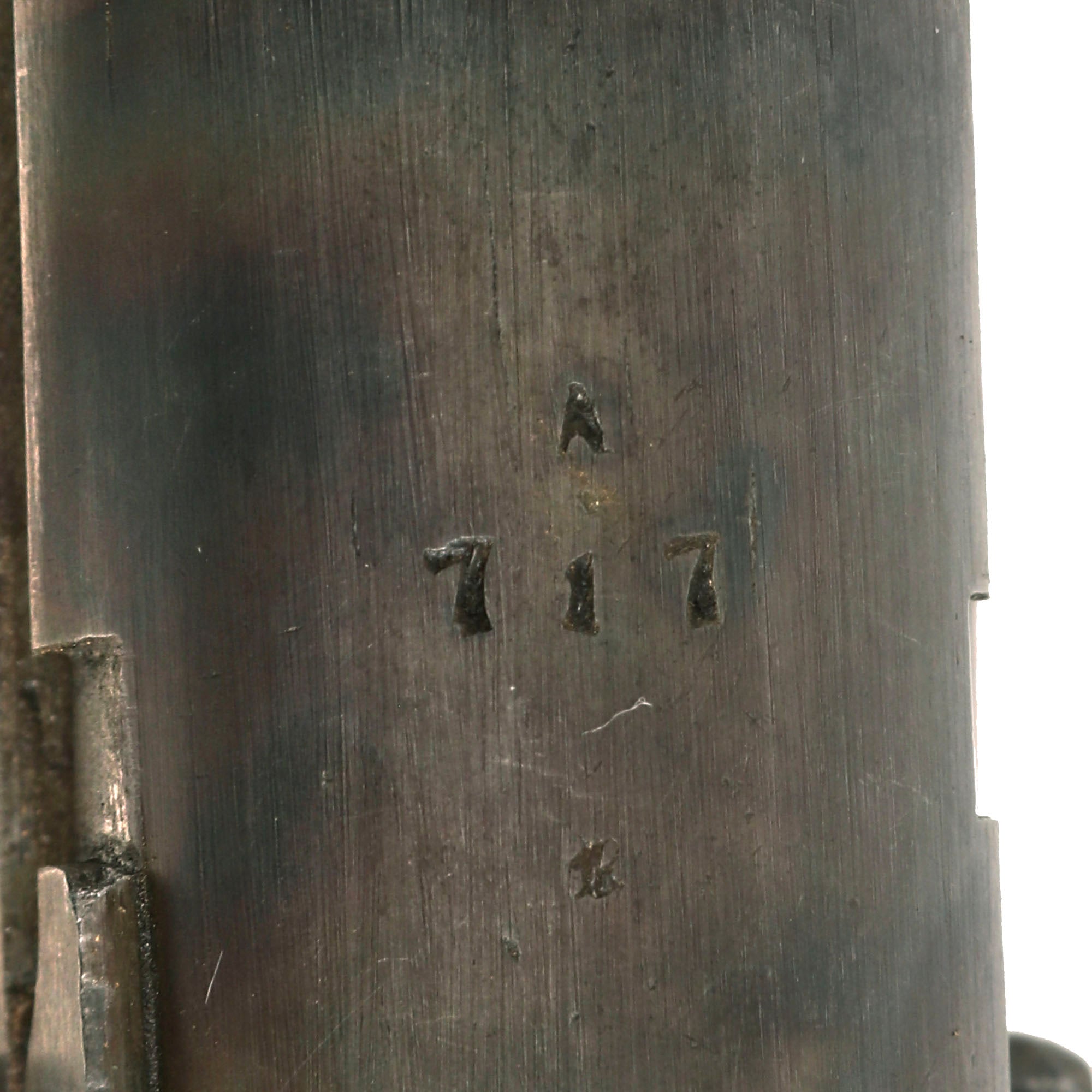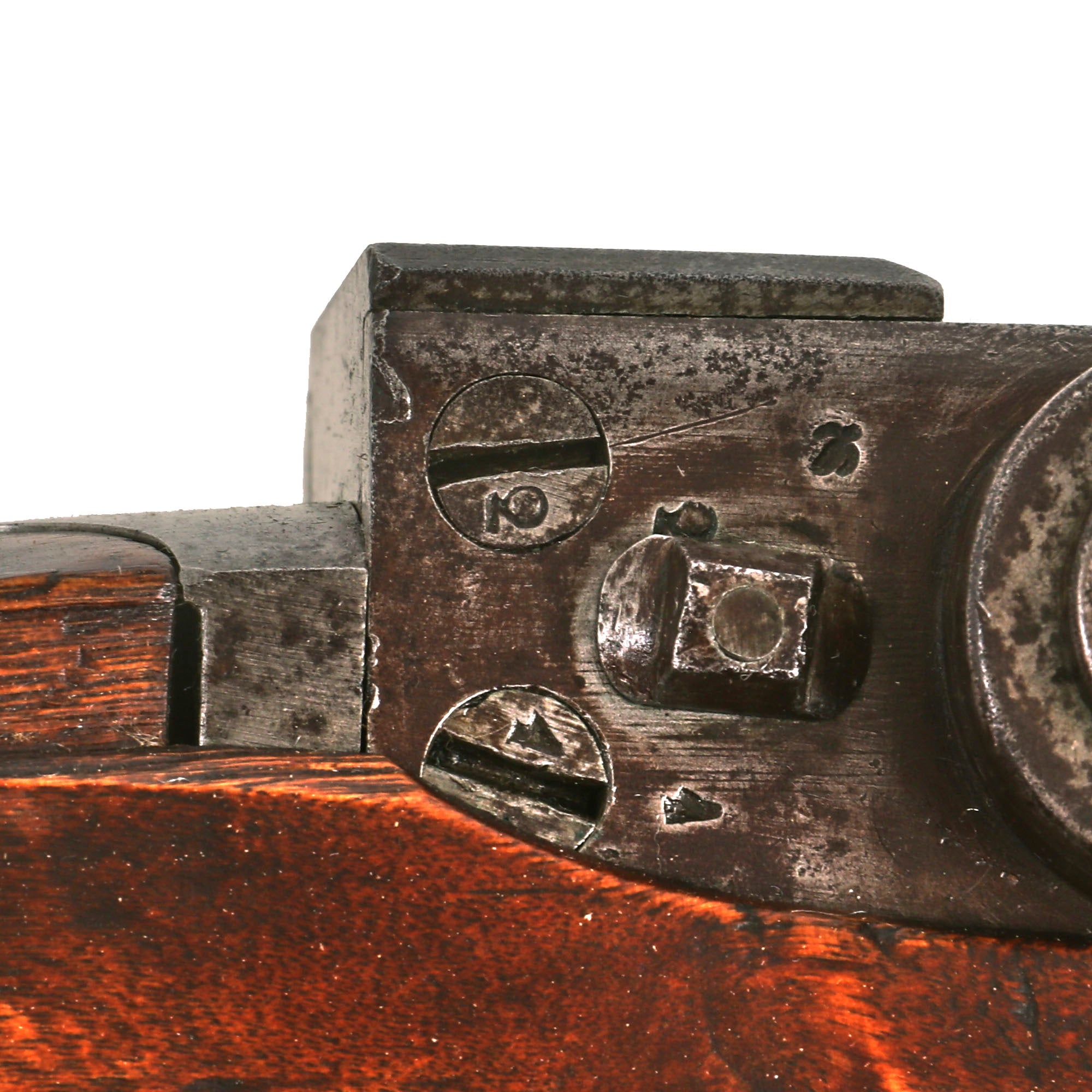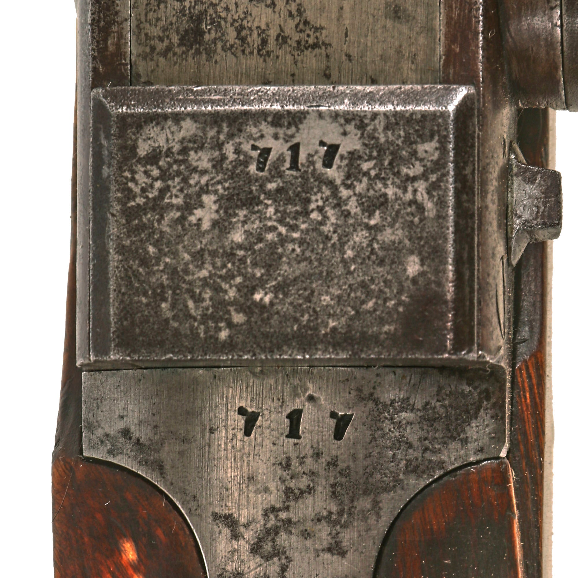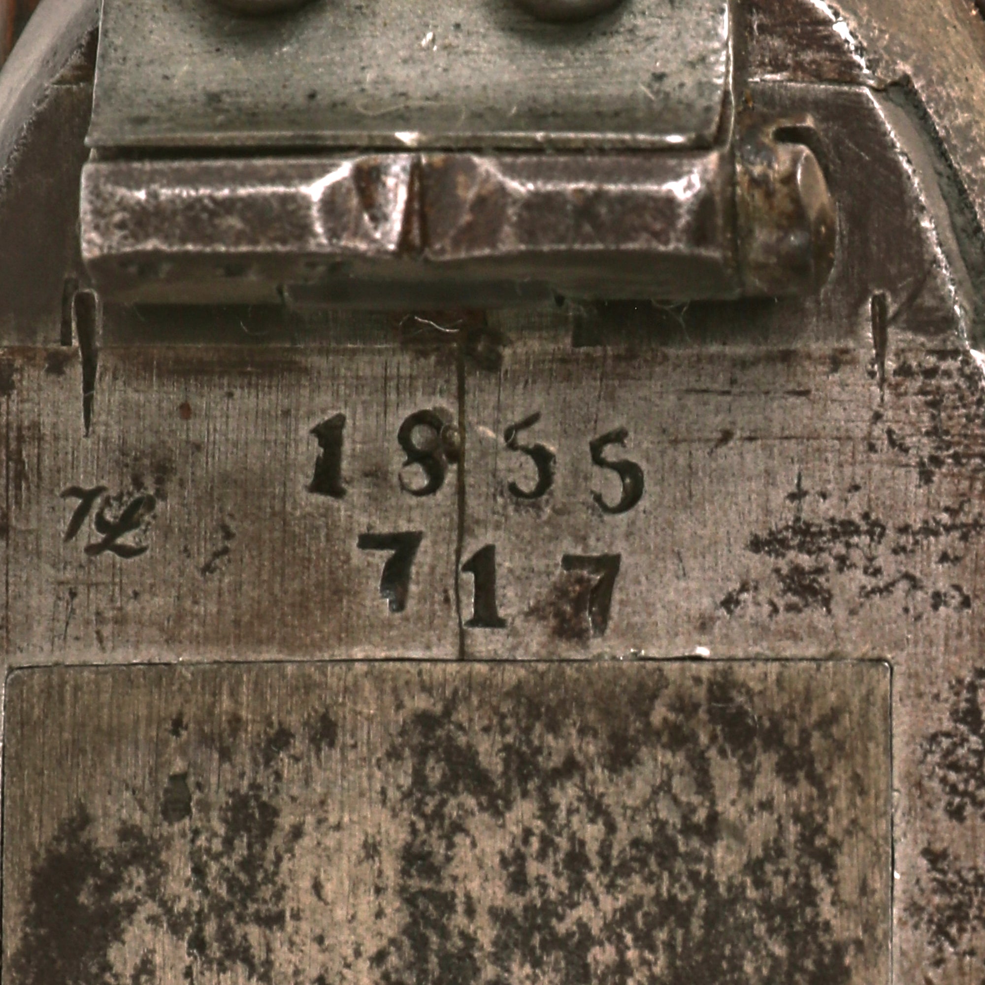 This lovely example of a M1855/67 Navy Kammerlader Landmark Conversion Short Rifle is correctly marked with the date of 1855 in front of the chamber, over serial number 717, which is also marked on just about every part of the rifle. This includes the brass fittings, components of the breech lever, the breech block, and more. Research indicates that the M1855 Kammerlader Navy Rifles were made with serial numbers starting in the low 500s, continuing the serialization from the earlier M1852 Kammerlader. About 500 would be made before the M1855 was itself superseded by the M1857, which took over at about serial number 1000. The front of the receiver under the "rocking" rear sight is marked with the CROWN over K marking of Kongsberg Våpenfabrikk, which is also marked on other parts of the rifle. There are no other markings on the rifle aside from various assembly numbers and proofs.