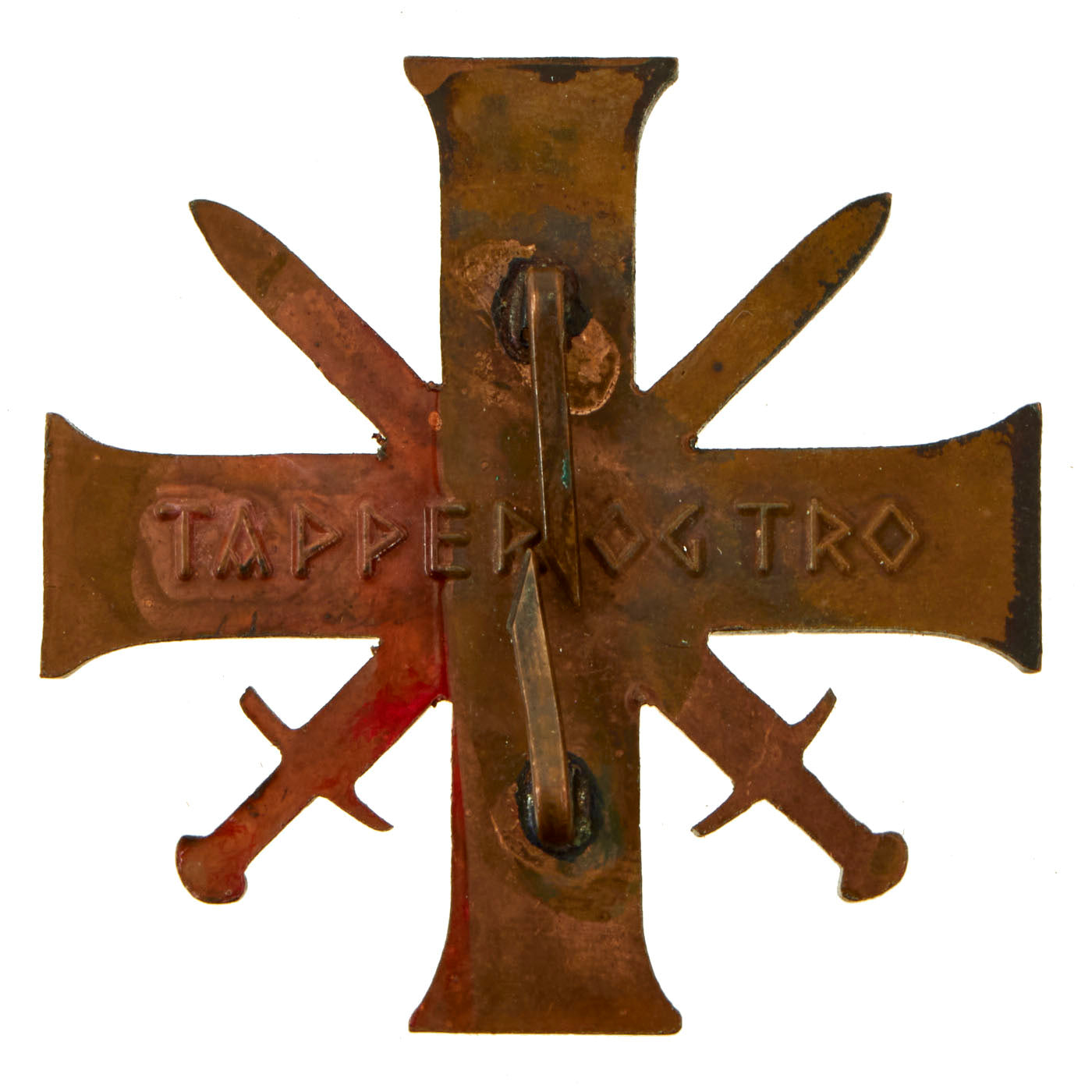 This example is one of those originally issued in 1942-43, and was never re-issued as a political award, so the 1941 on the front is still visible. The reverse is marked with the inscription TAPPER OG TRO (Brave and Loyal). The brass of the award has a lovely patina, with no signs of polishing.