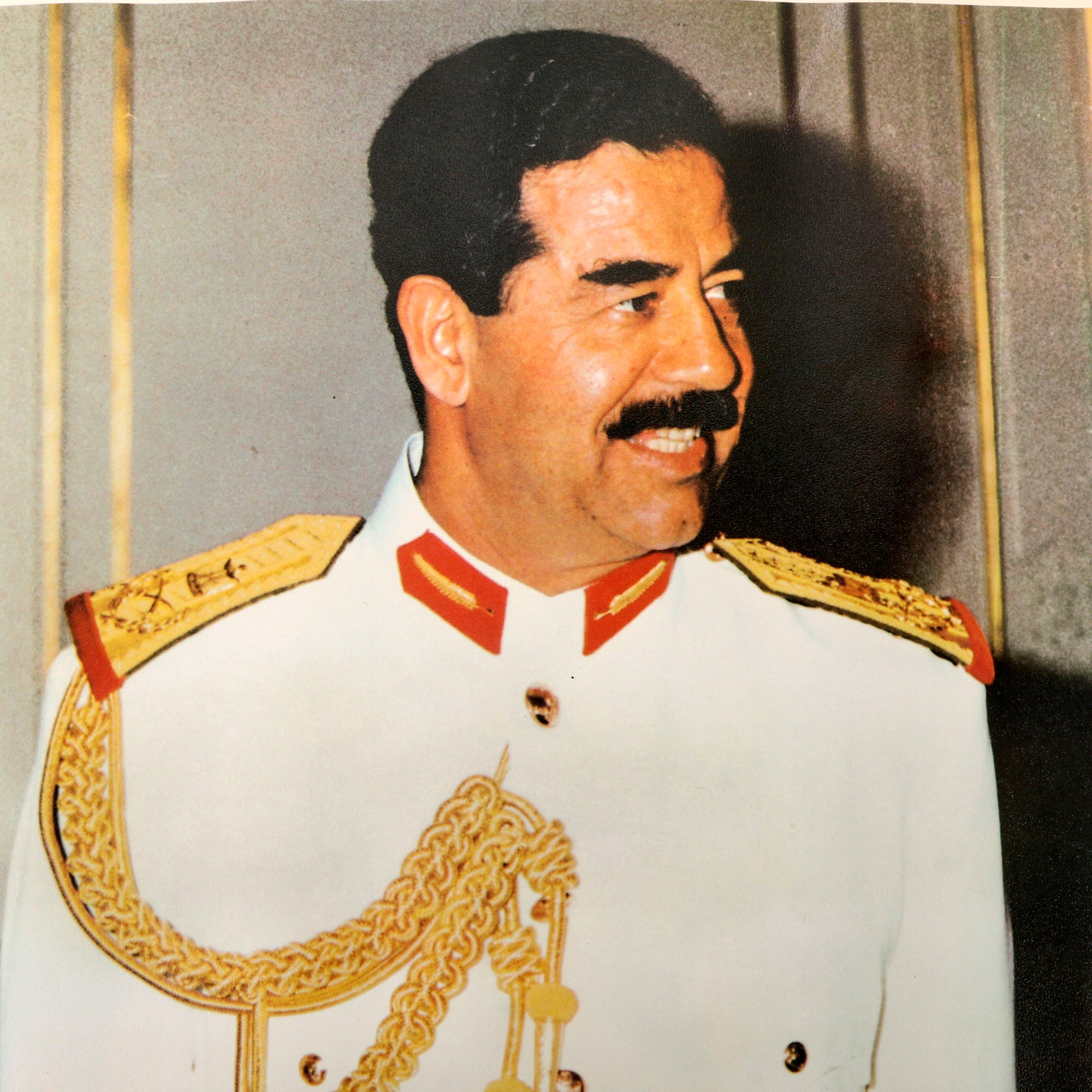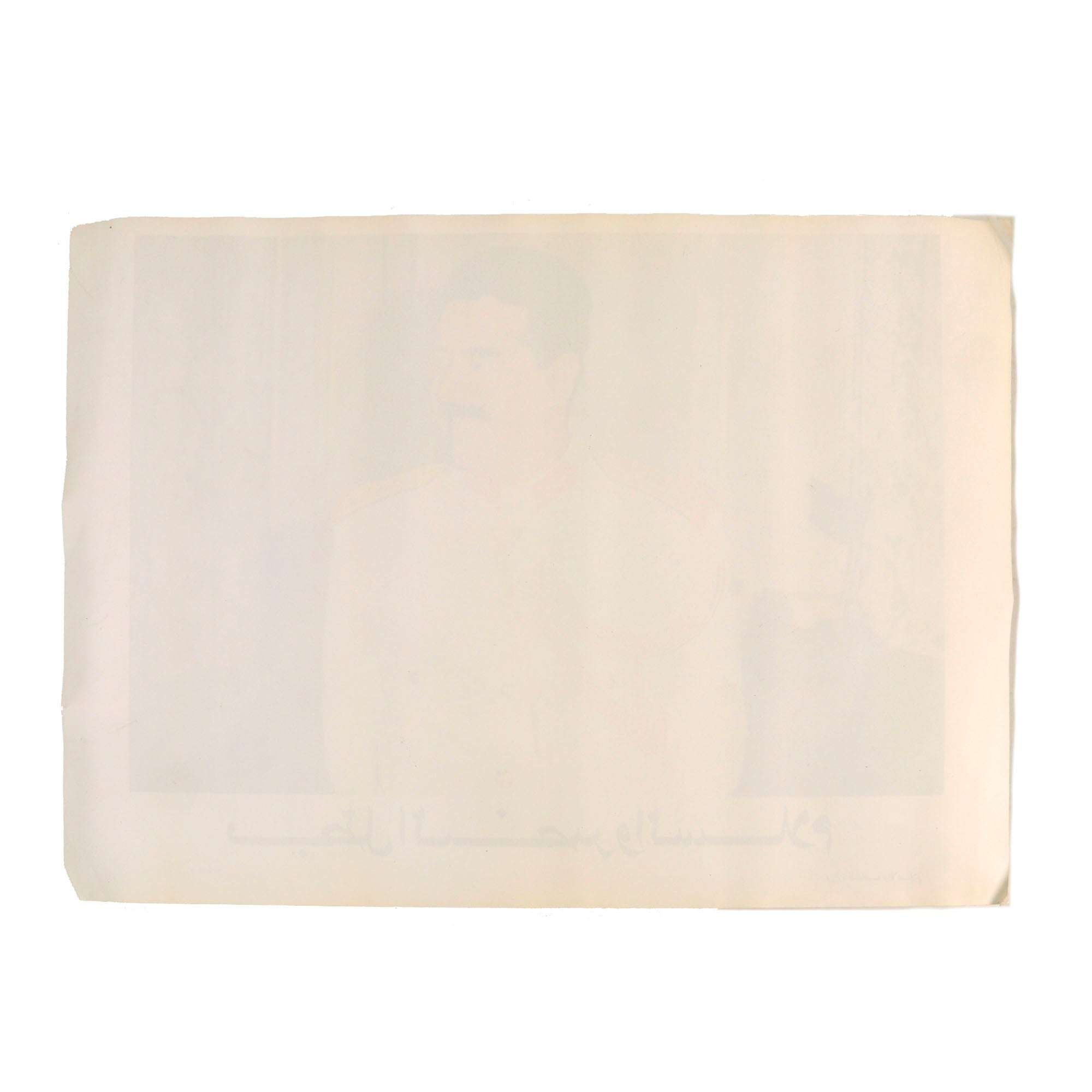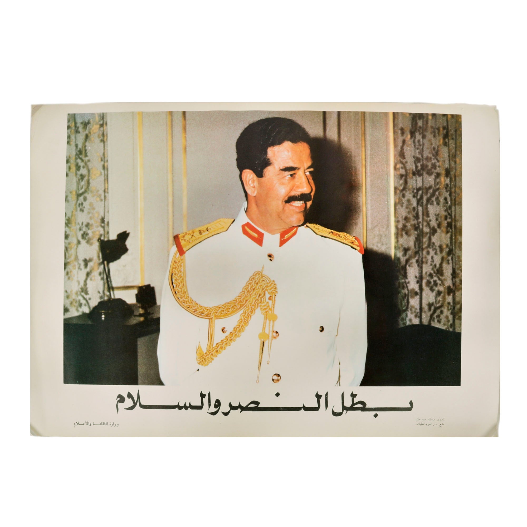 Original Item: Only one available. Iraqi Propaganda Poster featuring younger Saddam Hussein posed in a white military dress uniform. Certainly captured during Operation Desert Storm. Condition is excellent. Measures approximately 19 ⅝" x 27 ½".