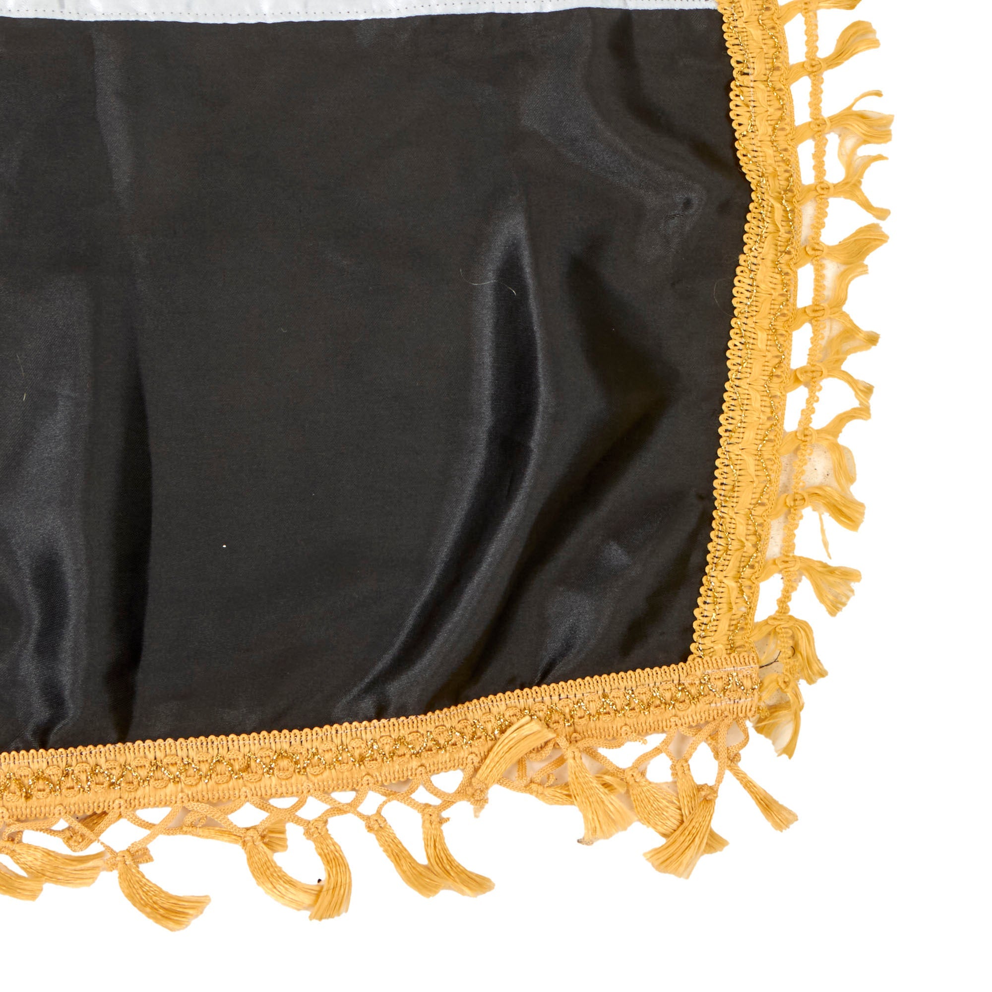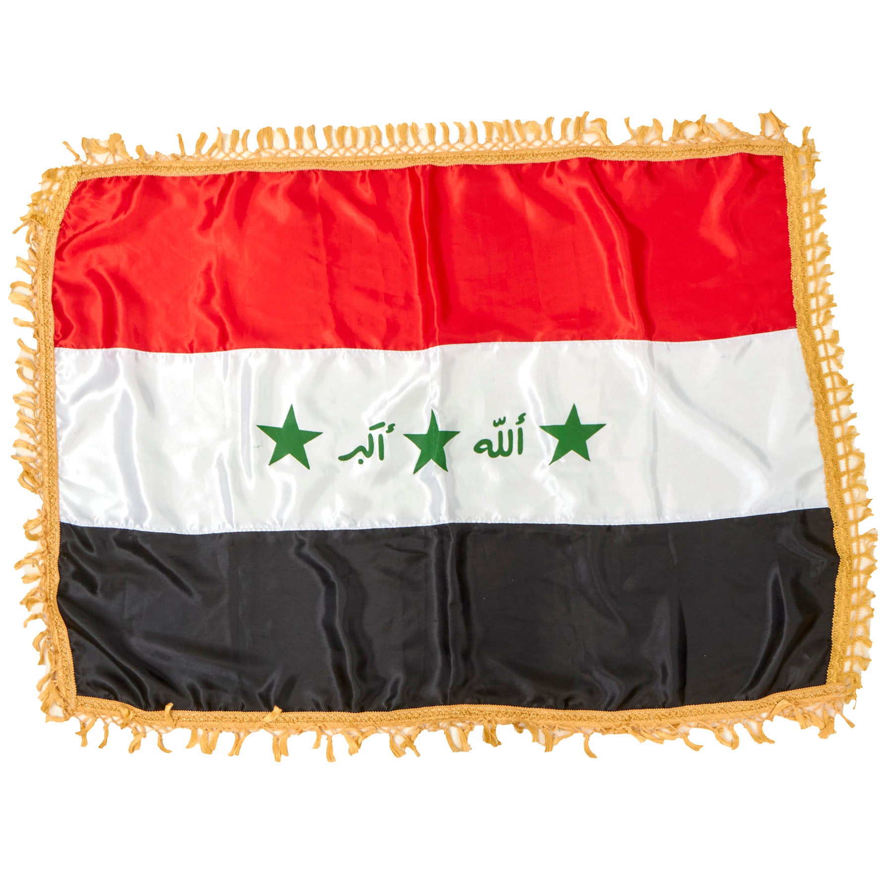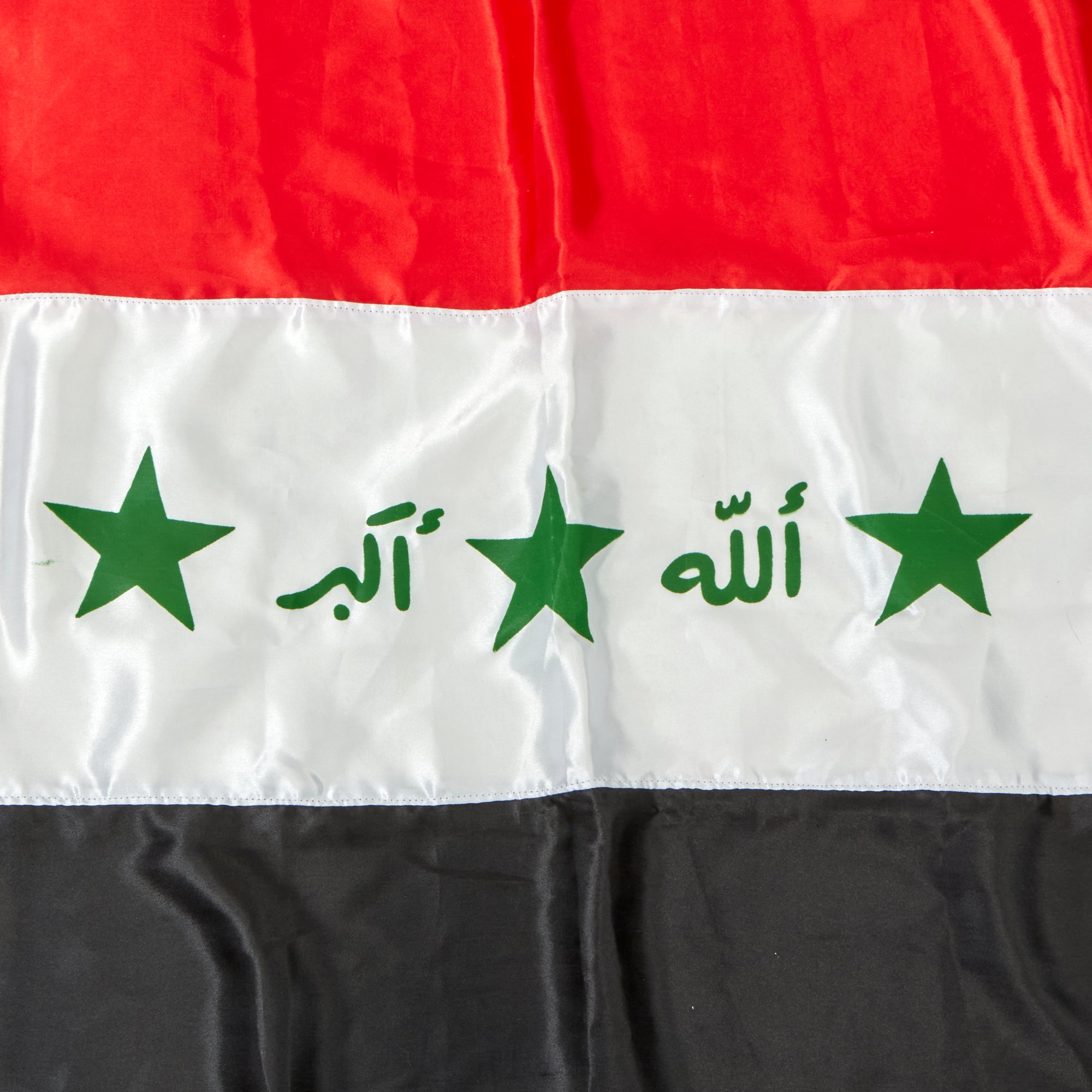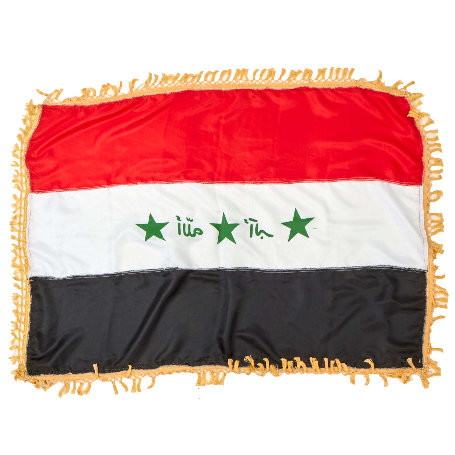 Original Item: Only One Available. The flag of Iraq includes the three equal horizontal red, white, and black stripes of the Arab Liberation flag, with the phrase "God is the greatest" in Arabic written in Kufic script in the center.This basic tricolor has been in use since its adoption on 31 July 1963, with several changes to the green symbols in the central white stripes; the most recent version adopted on 22 January 2008 bears the takbīr rendered in dark green and removes the three green stars present since 1963.The autonomous Region of Kurdistan emerged as an autonomous area within Iraq with its own government and parliament, President and Army. The Kurdistan Regional Government uses a separate flag known as the flag of Kurdistan which was adopted in 1992.This lovely example is the type that was flown and used from 1991-2004. It is in wonderful condition and shows no signs of any real use or wear. This was more than likely recovered from an abandoned post before it had time to be used, or it could very well have been purchased from a Bazaar and then brought back to the United States by a service member.On 13 January 1991, the flag was modified by Flag Law No. 6 of 1991. At the instigation of President Saddam Hussein, the takbīr (the phrase Allahu akbar, meaning "God is the greatest" in Arabic) was added in green between the stars. The form of the takbīr was said to be Saddam's own handwriting. Many interpreted the addition of the sacred Islamic text as an attempt to garner wartime support from previously outlawed religious Iraqi leaders, to stop the disrespect of the Iraqi flag in Iraqi-occupied Kuwait, and to bolster the Iraqi government's Islamist credentials in the period immediately preceding the Persian Gulf War.As with other flags inscribed with Arabic script, the hoist is to the right of the obverse (front) of the flag.A lovely example that comes more than ready for further research and display.