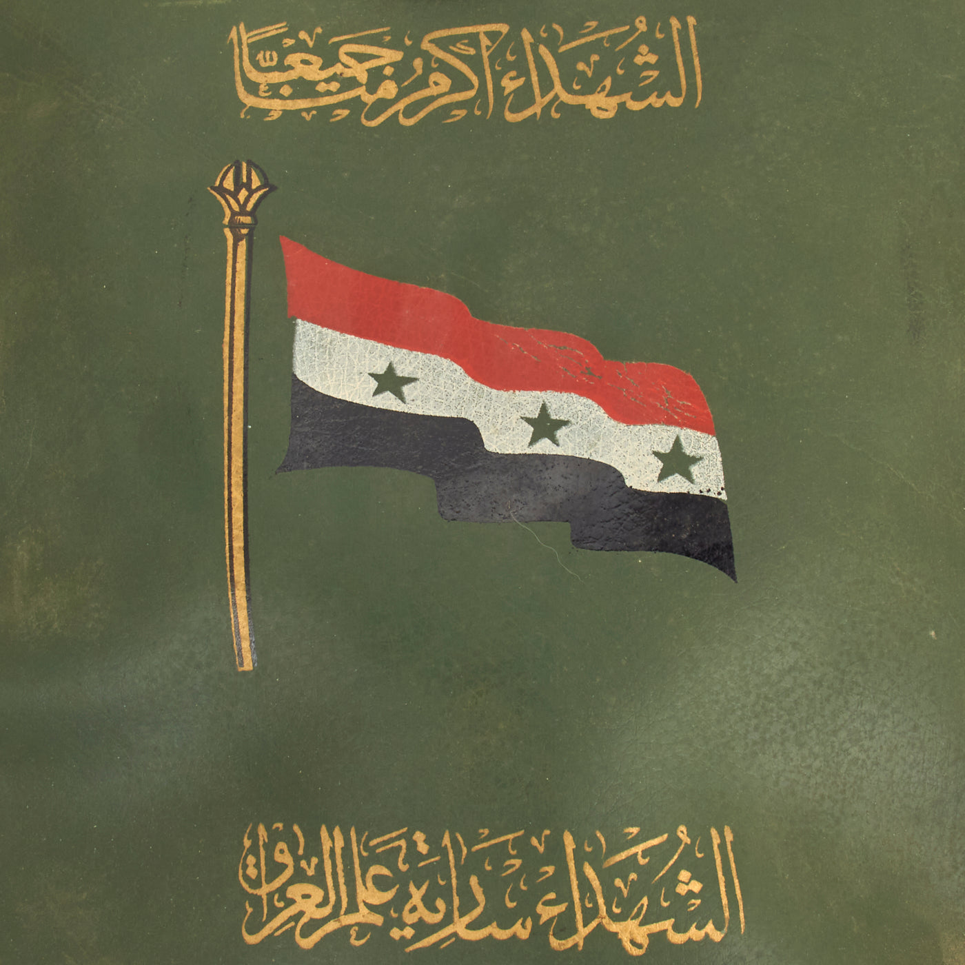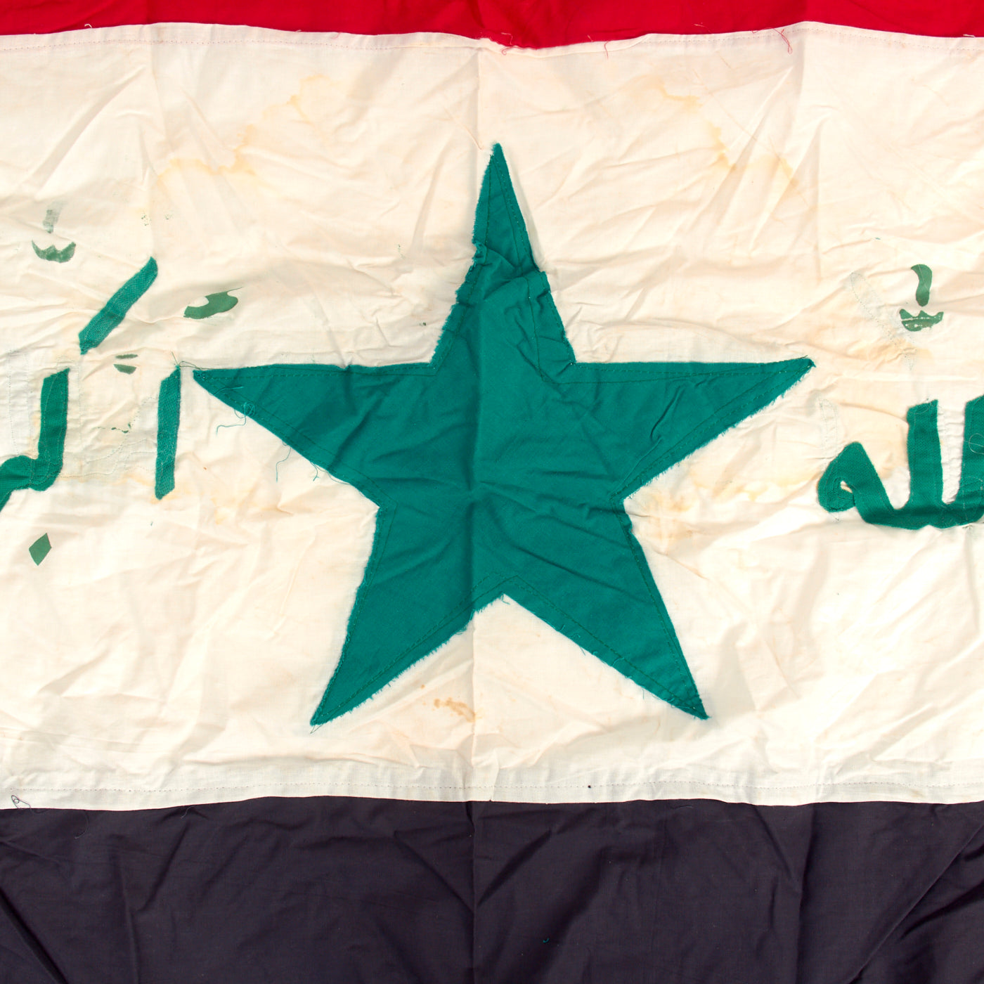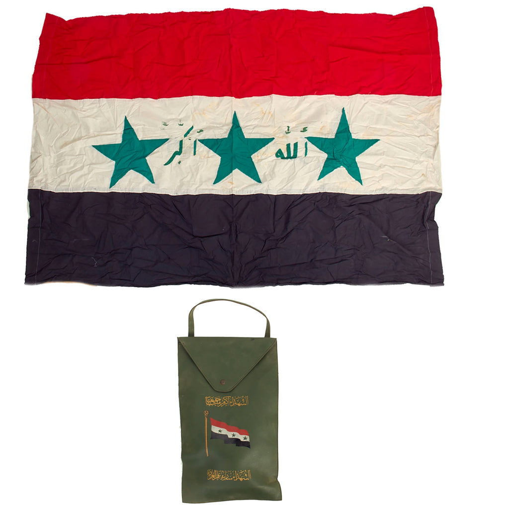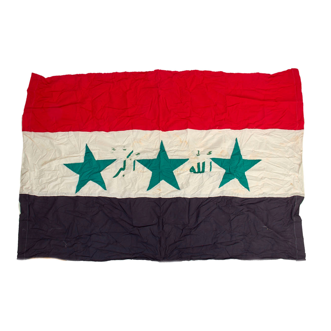 Original Items: Only One Set Available. The flag of Iraq includes the three equal horizontal red, white, and black stripes of the Arab Liberation flag, with the phrase “God is the greatest” written in Kufic script in the center.