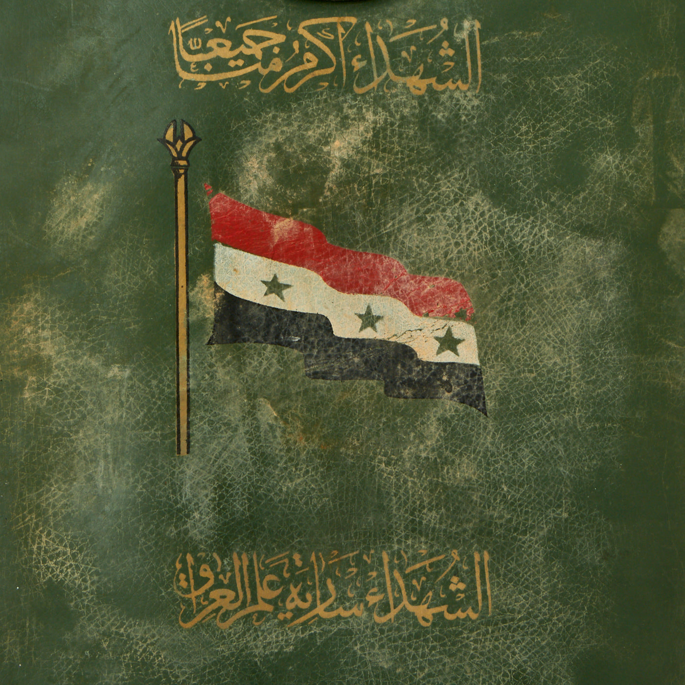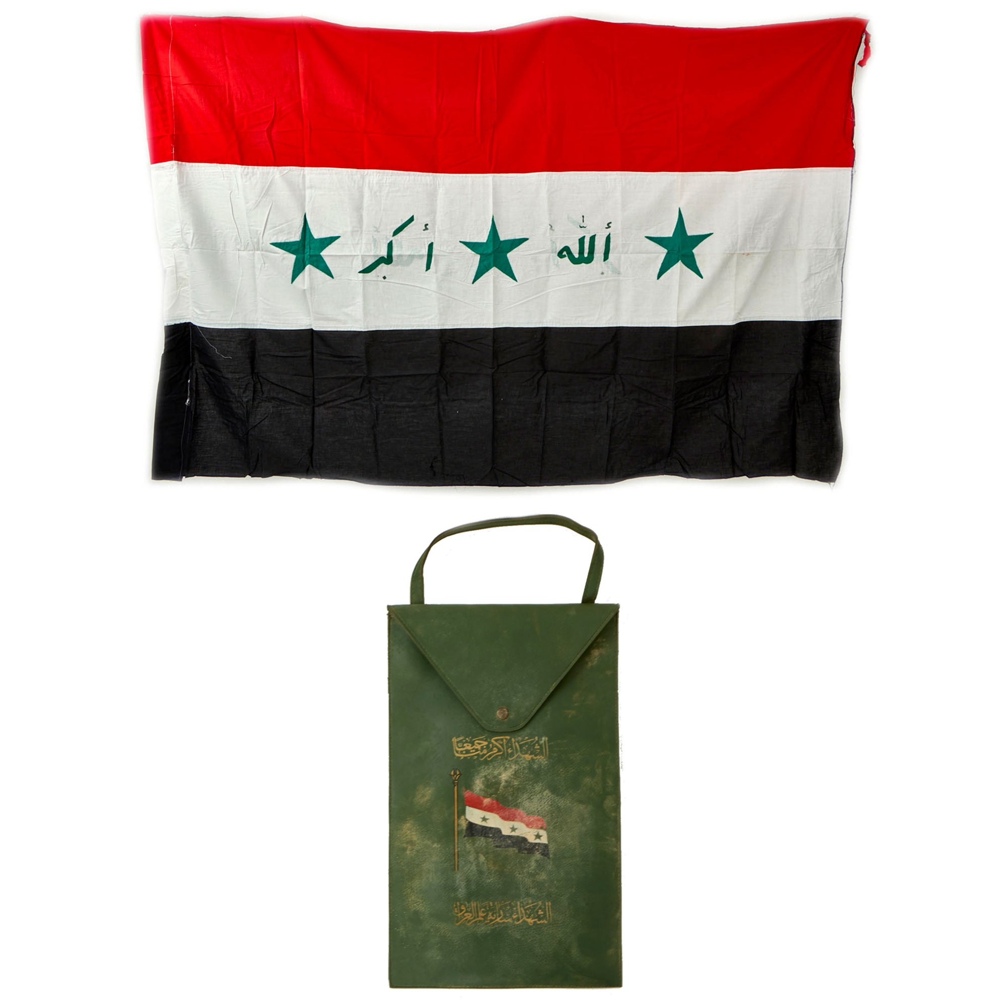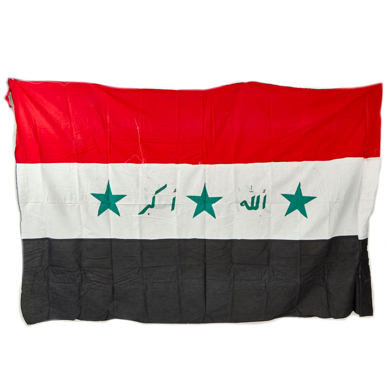 • Original Items: Only One Set Available. The flag of Iraq includes the three equal horizontal red, white, and black stripes of the Arab Liberation flag, with the phrase “God is the greatest” written in Kufic script in the center.