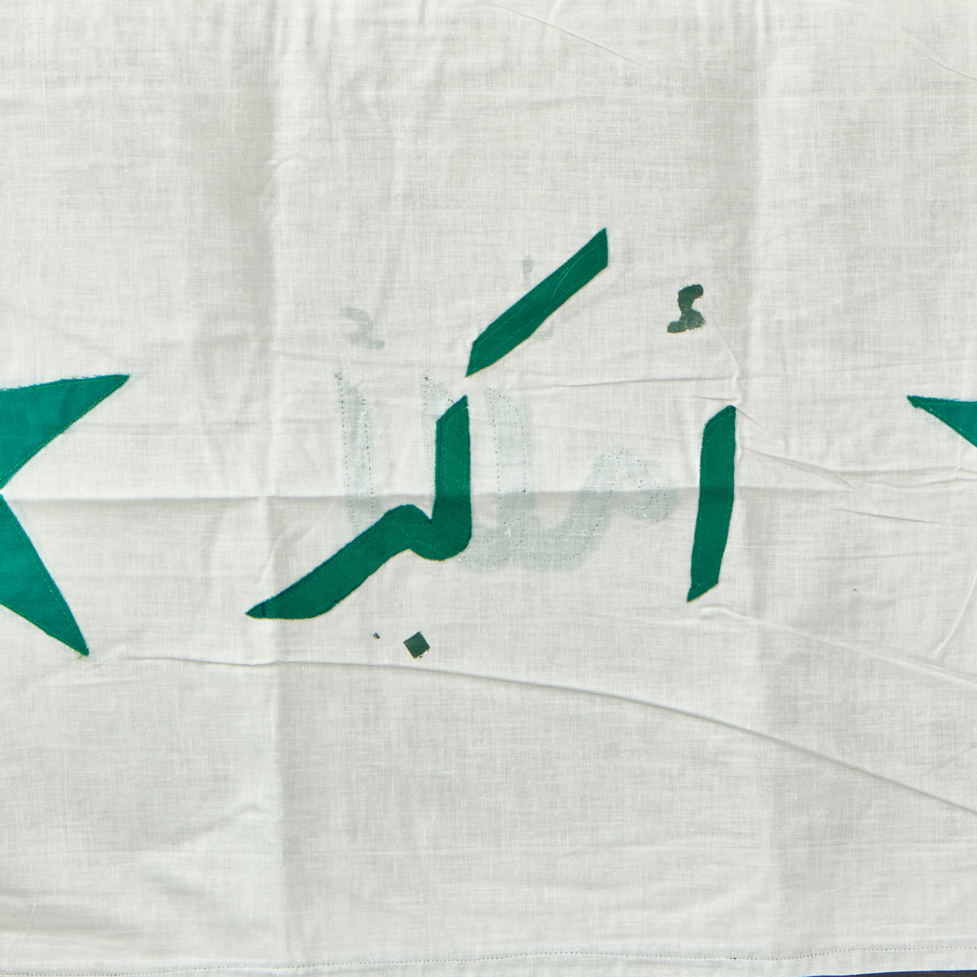 The flag and case are both in great condition with minor wear and staining. The flag appears to have been a pre 1991 example and had the takbīr added after the flag was changed. The case is in great condition with only storage wear present with sand and dirt staining the front.