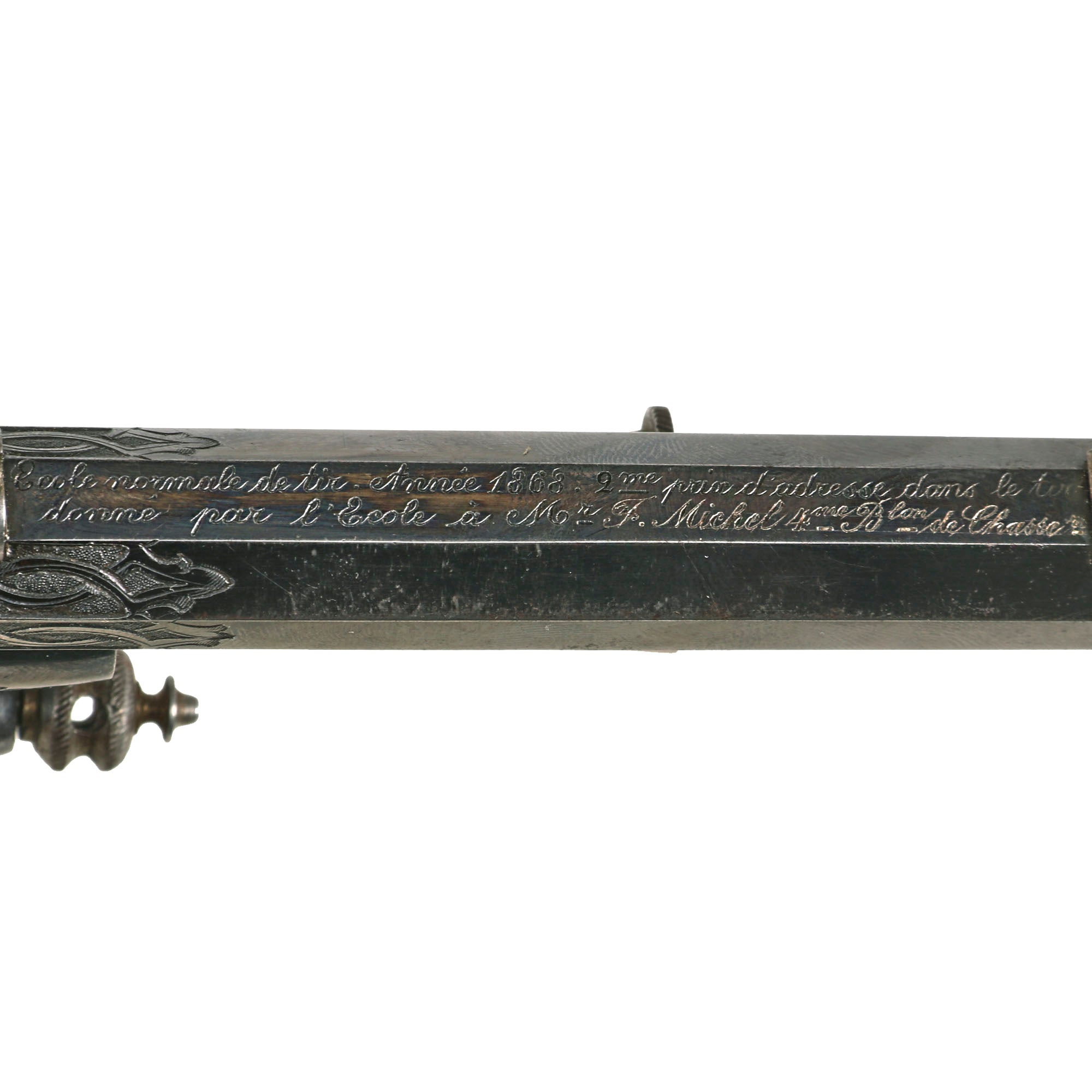 This essentially translates to: "Normal shooting school. Year 1868. 2nd prize for shooting skill given by the School to Mr. F. Michel Quatrième bataillon de Chasseurs" (4th Battalion of Chasseurs). If this was the second prize, we'd love to know what the first prize was! We did some cursory research, but were unable to find any further information, however with this inscription the revolver is ripe for further research!