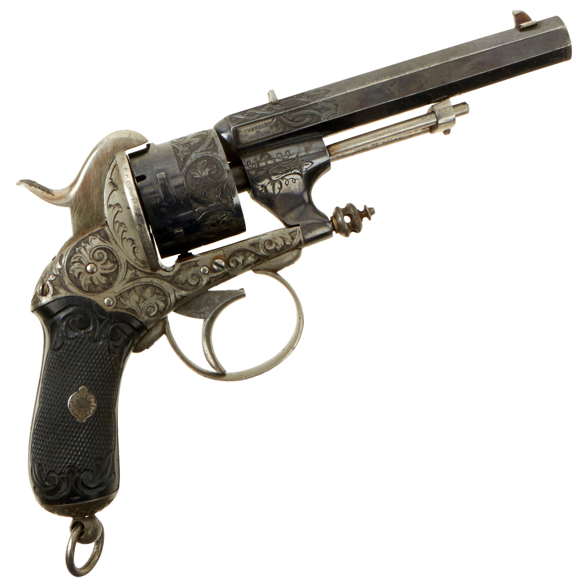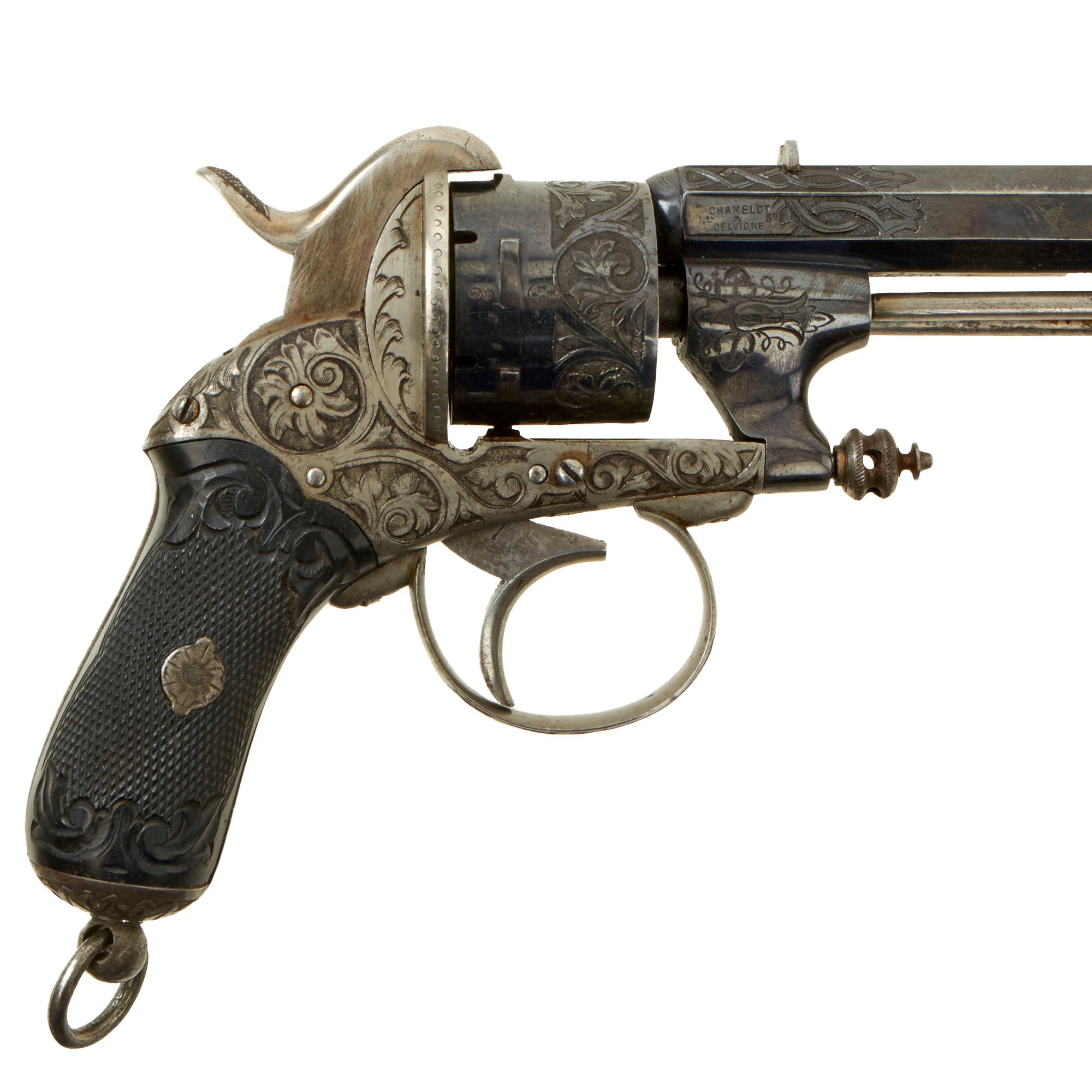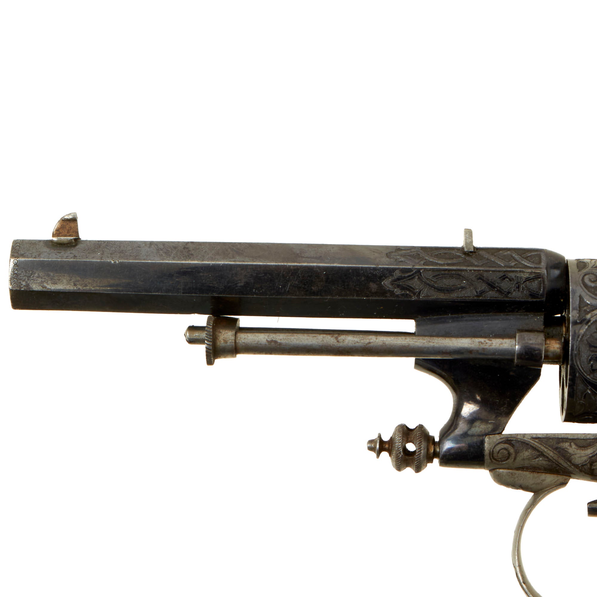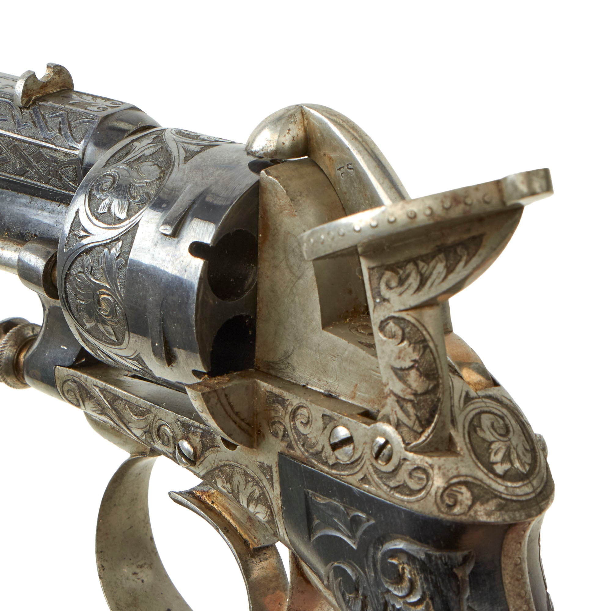 Original item. One of a Kind. This is a magnificent ornate Belgian Pinfire revolver, made very much in the French style, unlike any other we have seen before. It looks to be in 9mm Lefaucheux pinfire chambering, double / single action with a 6 round cylinder, and the entire gun shows an extremely high level of craftsmanship. The grip and frame have a lovely smooth tapered shape that is very comfortable to hold, representing a massive amount of time to make when compared with more simple designs. It also has superb floral engraving over much of the revolver frame, with deeper engraving on the cylinder and the breech end of the barrel. Even the ebony grip scales show some fantastic floral engraving! This is a real peach!