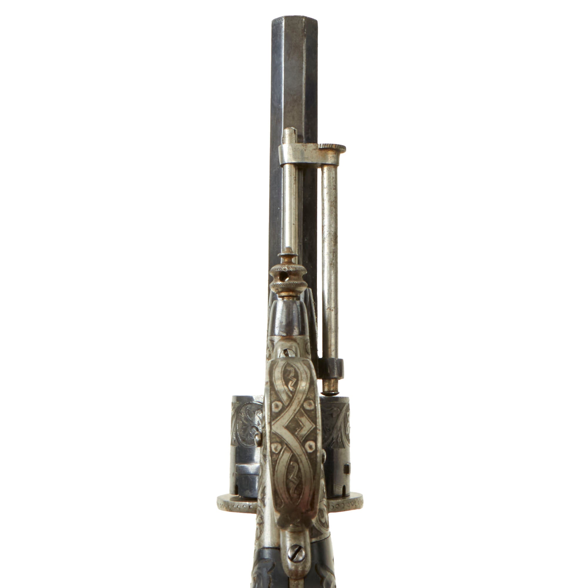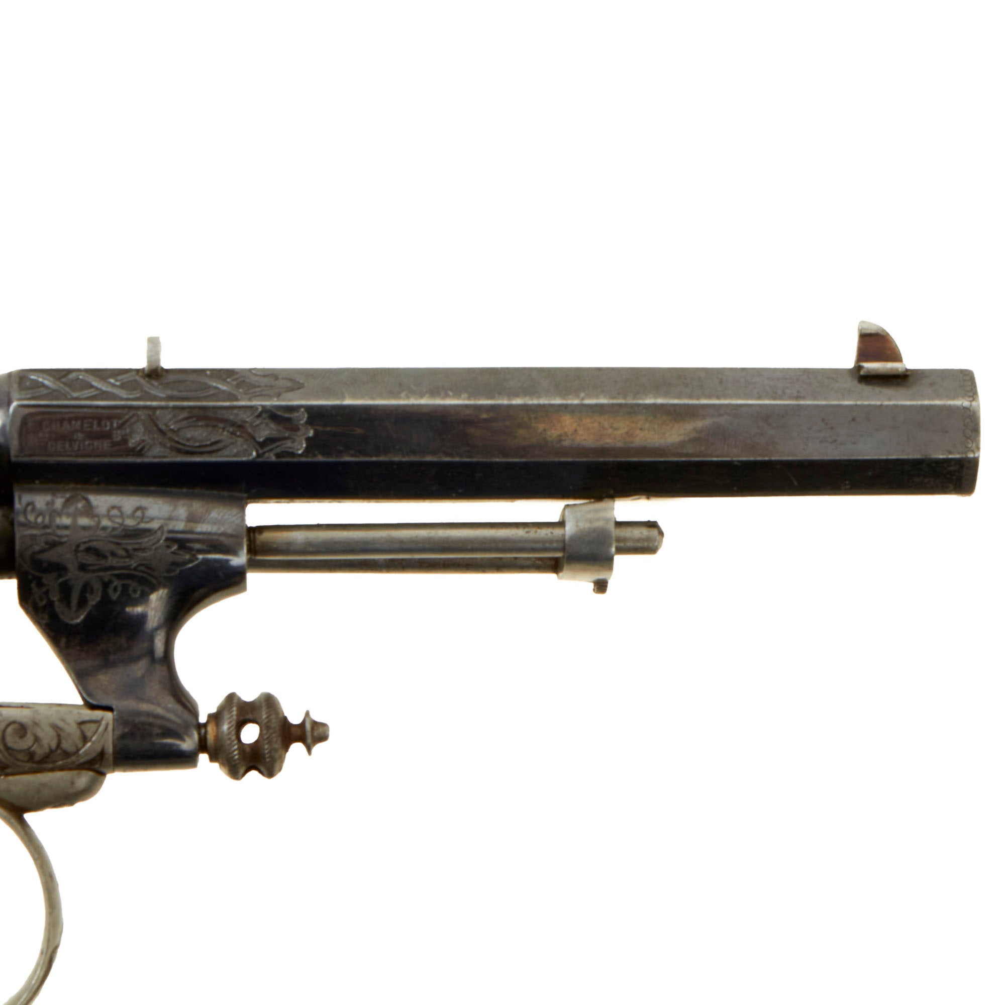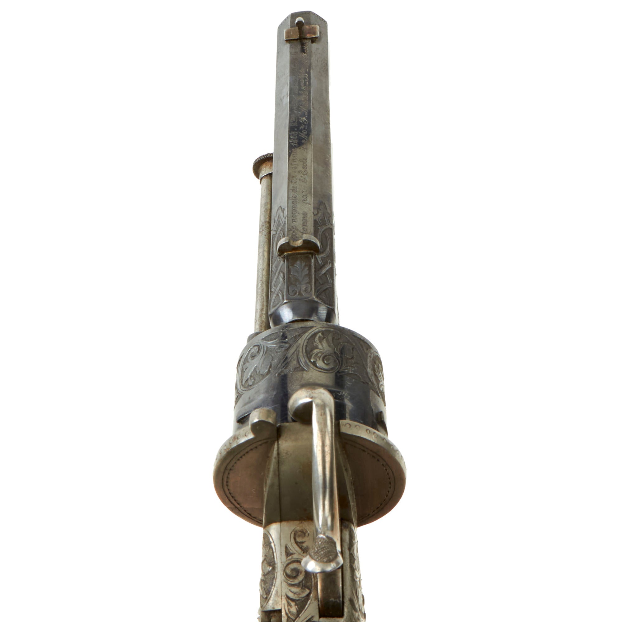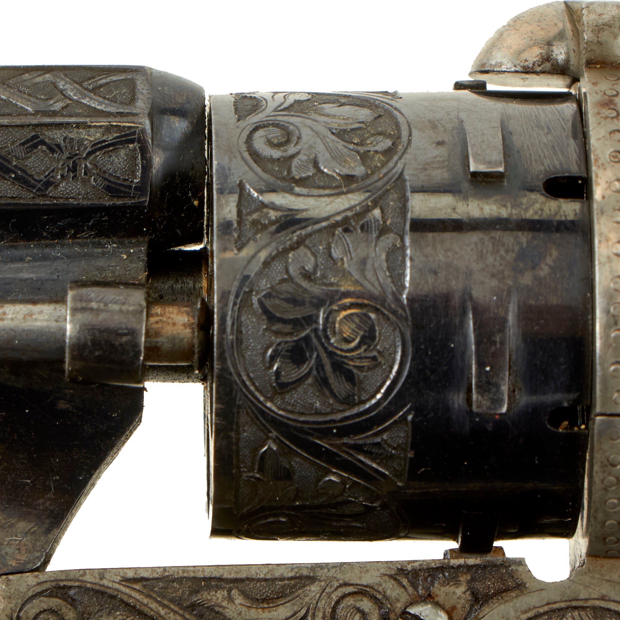 Original item. One of a Kind. This is a magnificent ornate Belgian Pinfire revolver, made very much in the French style, unlike any other we have seen before. It looks to be in 9mm Lefaucheux pinfire chambering, double / single action with a 6 round cylinder, and the entire gun shows an extremely high level of craftsmanship. The grip and frame have a lovely smooth tapered shape that is very comfortable to hold, representing a massive amount of time to make when compared with more simple designs. It also has superb floral engraving over much of the revolver frame, with deeper engraving on the cylinder and the breech end of the barrel. Even the ebony grip scales show some fantastic floral engraving! This is a real peach!
