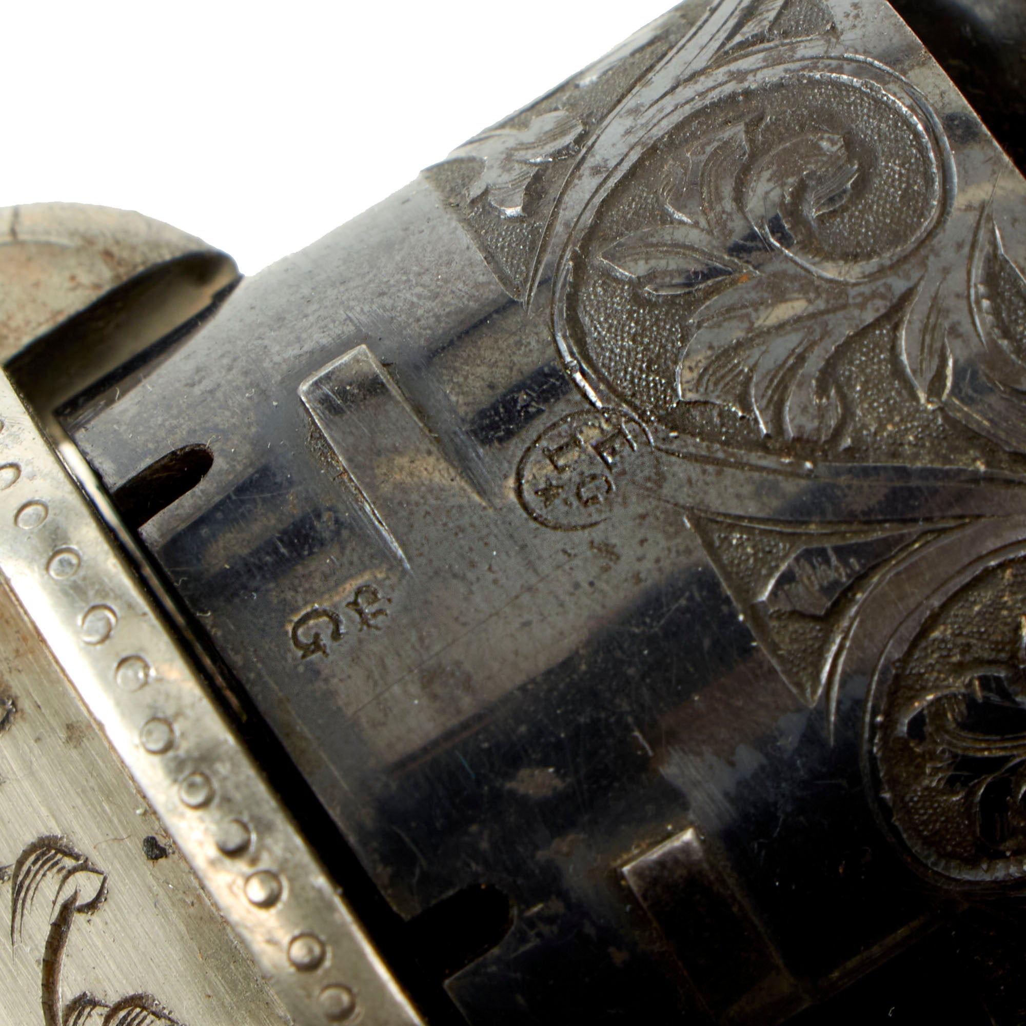 The cylinder bears a clear E / L G / * in an Oval marking, indicating manufacture in Liège, Belgium. There are also CROWN / G proof mark next to this, for the inspector who viewed it. There are several other small markings on the revolver, and what we assume is the serial number 6701 on the bottom of the barrel.