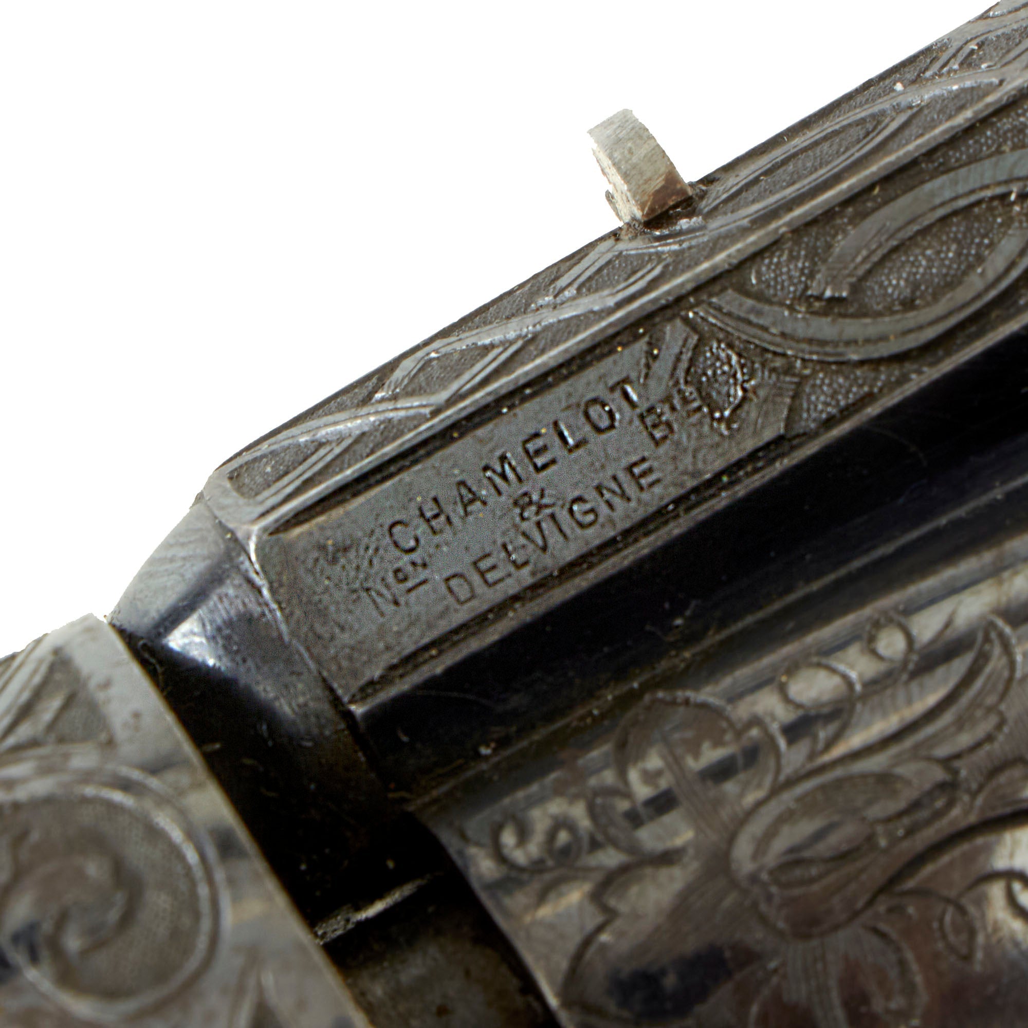 The right side of the barrel on this magnificent piece has the original patent markings, indicating it is made under the Chamelot-Delvigne design: