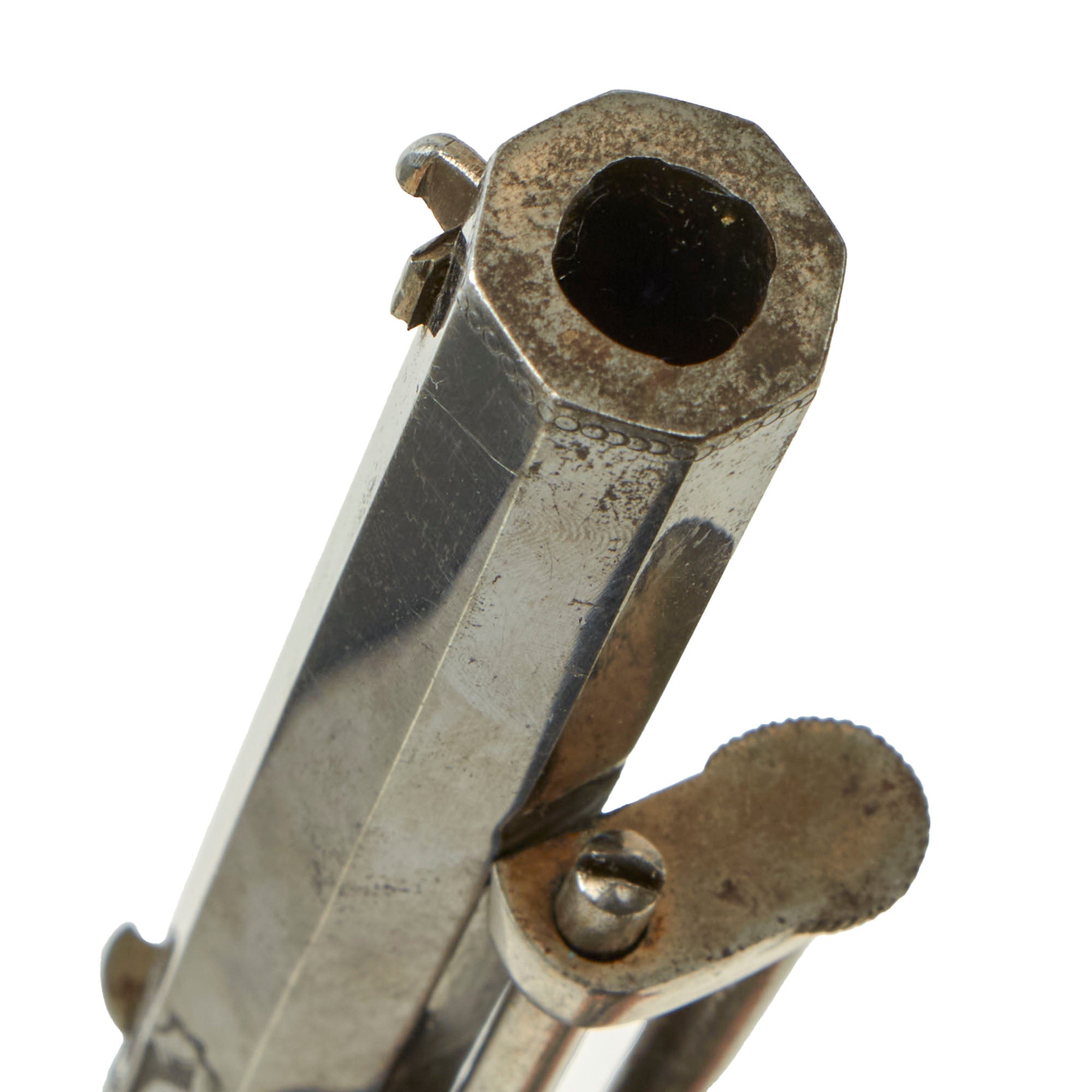 Functionally, the revolver cycles well, in both single and double action, with the only issue being that the trigger spring is missing or broken, so the trigger must be returned to the forward position by hand. The bore is in excellent condition, showing a bright finish with crisp lands and grooves. As a presentation revolver, we would assume that it was never really used, just dry fired and handled for years. The ejector rod on the left side of the barrel still works well, however the spring that was on the center pin to keep it in the forward position is missing. The loading gate works great as well.