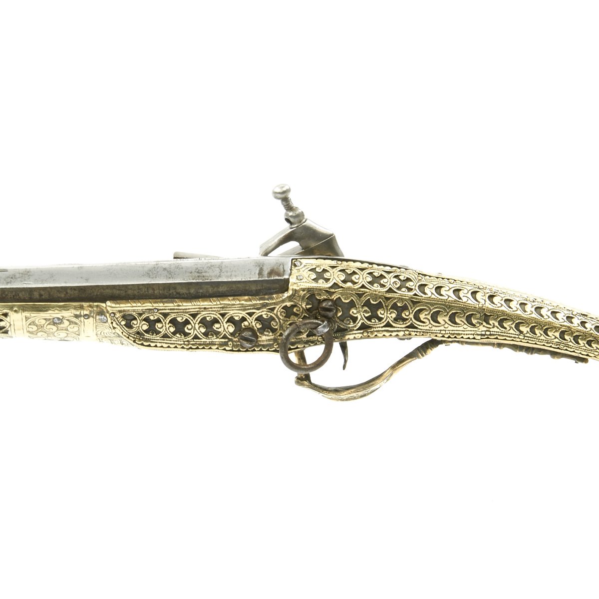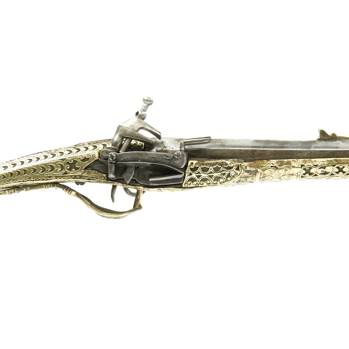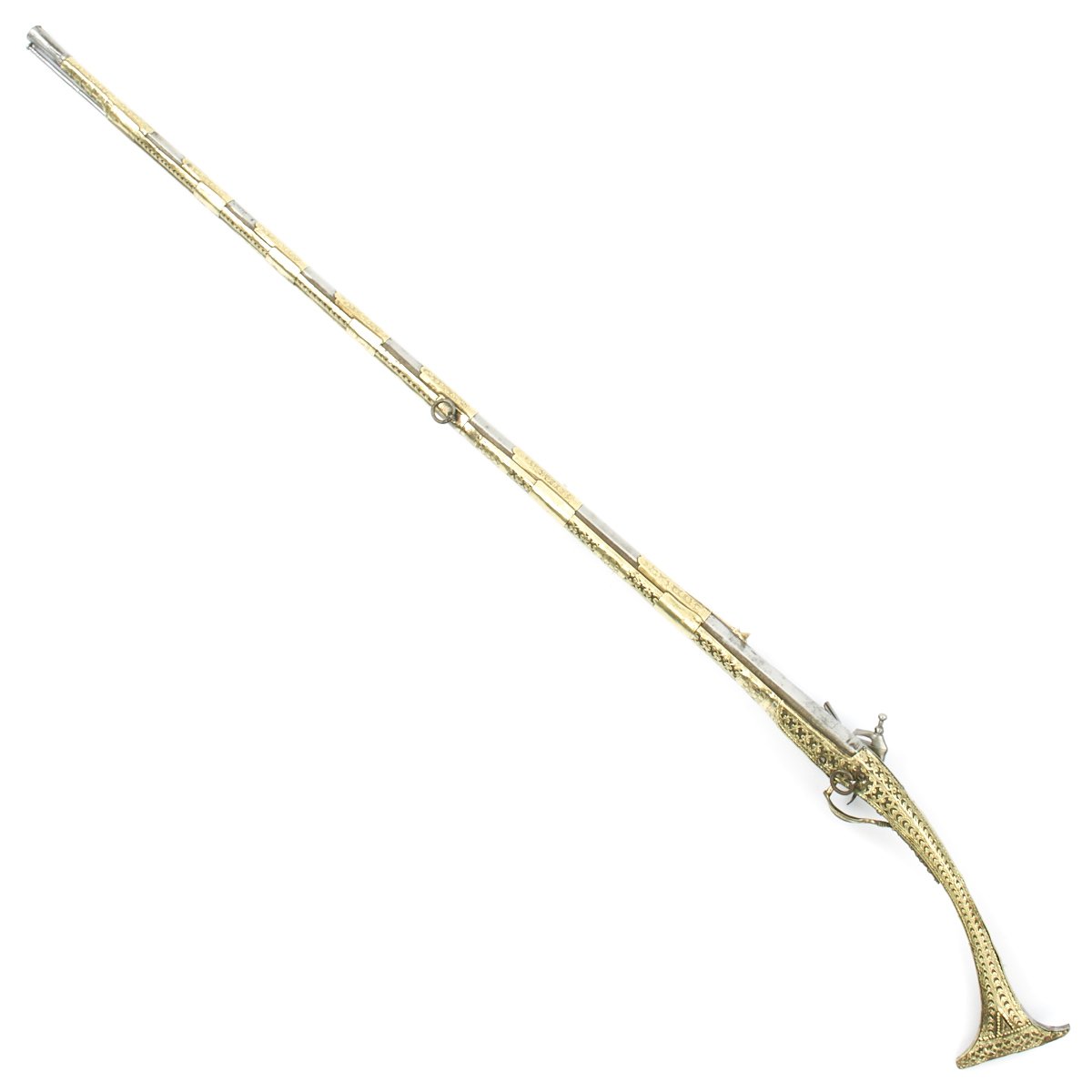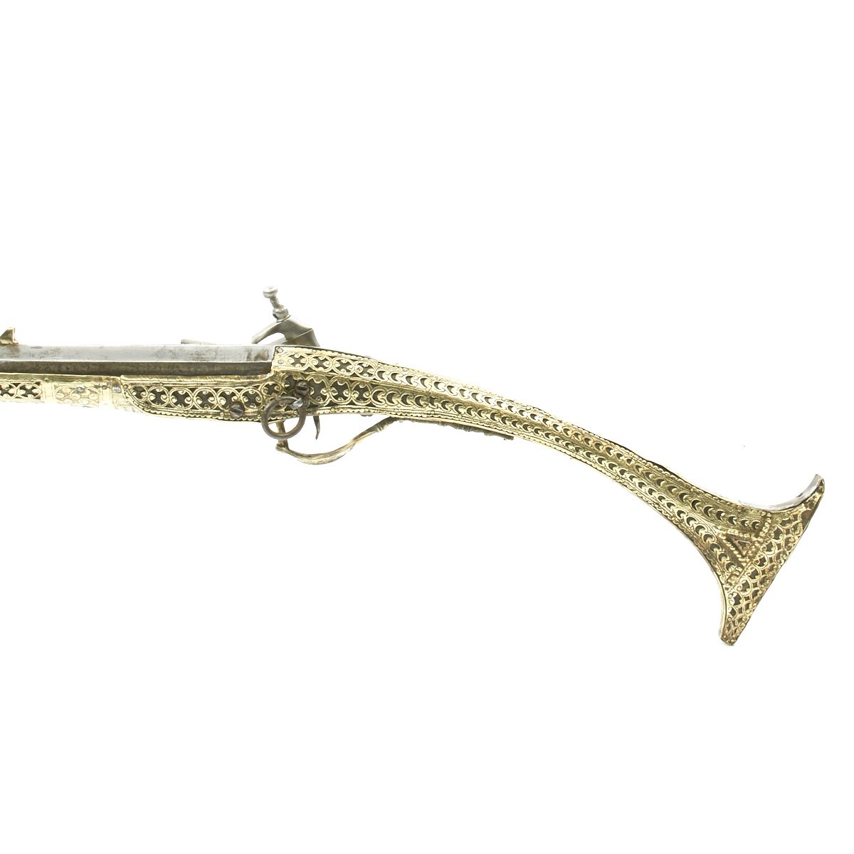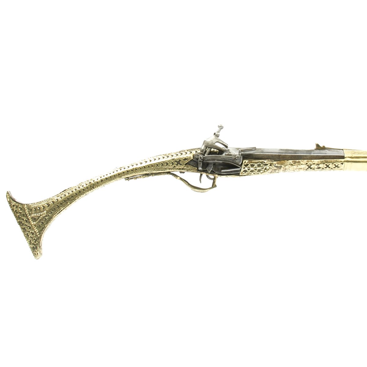 This particular weapon came from the Northern part of the Empire which could reach from Greece to southern Ukraine to the Caspian sea in the East. The lock is a MIQUELET developed in Spain and Italy in the 17th. century. The iron barrel is 46" in length and overall the weapon measure 60". The stock of wood is hardly visible at all, as it is covered in fretted out brass embossed and engraved sheeting, with a workmanship of truly great quality.