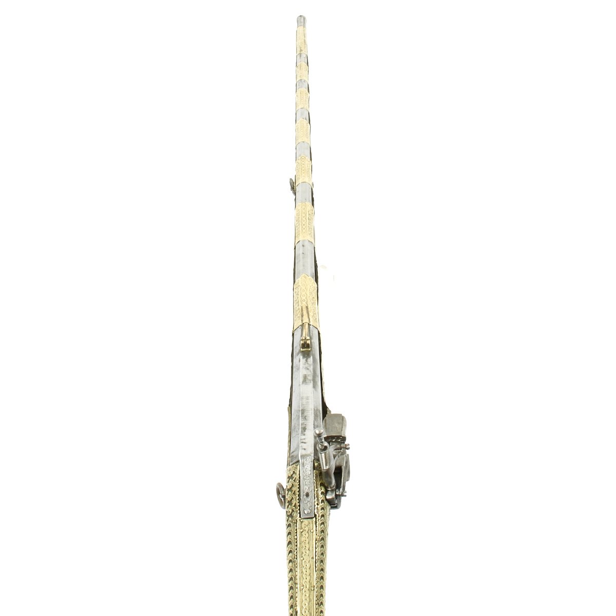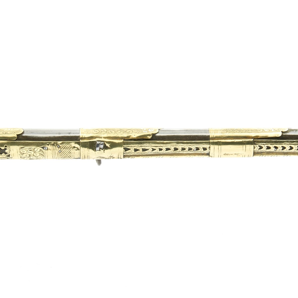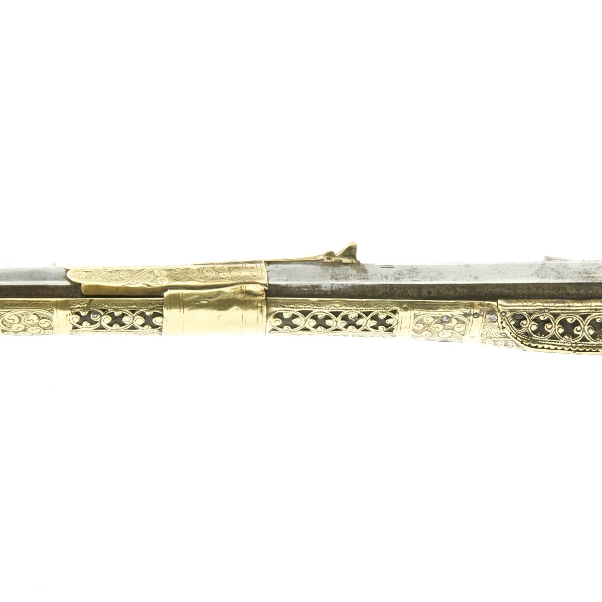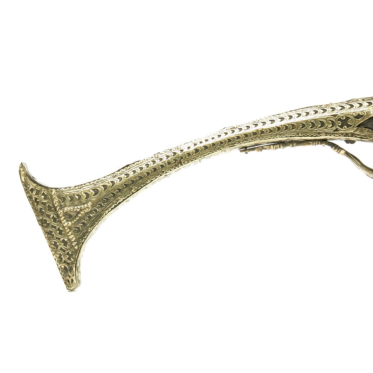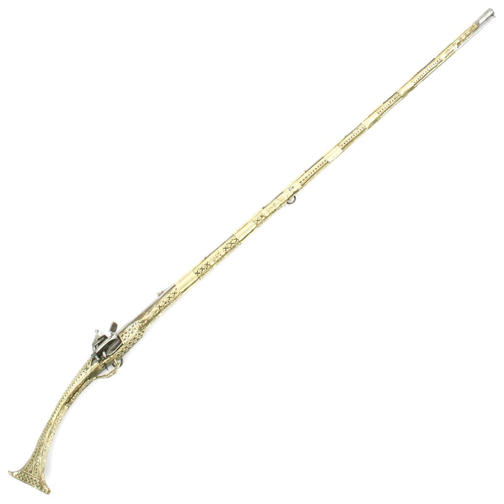 This particular weapon came from the Northern part of the Empire which could reach from Greece to southern Ukraine to the Caspian sea in the East. The lock is a MIQUELET developed in Spain and Italy in the 17th. century. The iron barrel is 46" in length and overall the weapon measure 60". The stock of wood is hardly visible at all, as it is covered in fretted out brass embossed and engraved sheeting, with a workmanship of truly great quality.