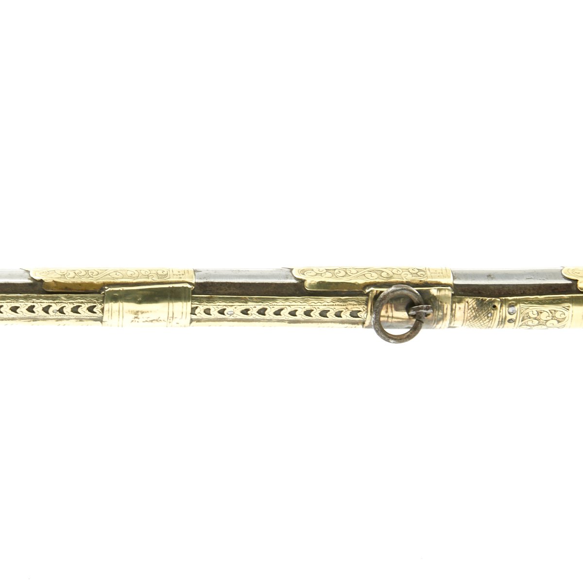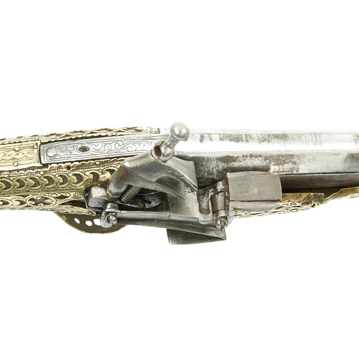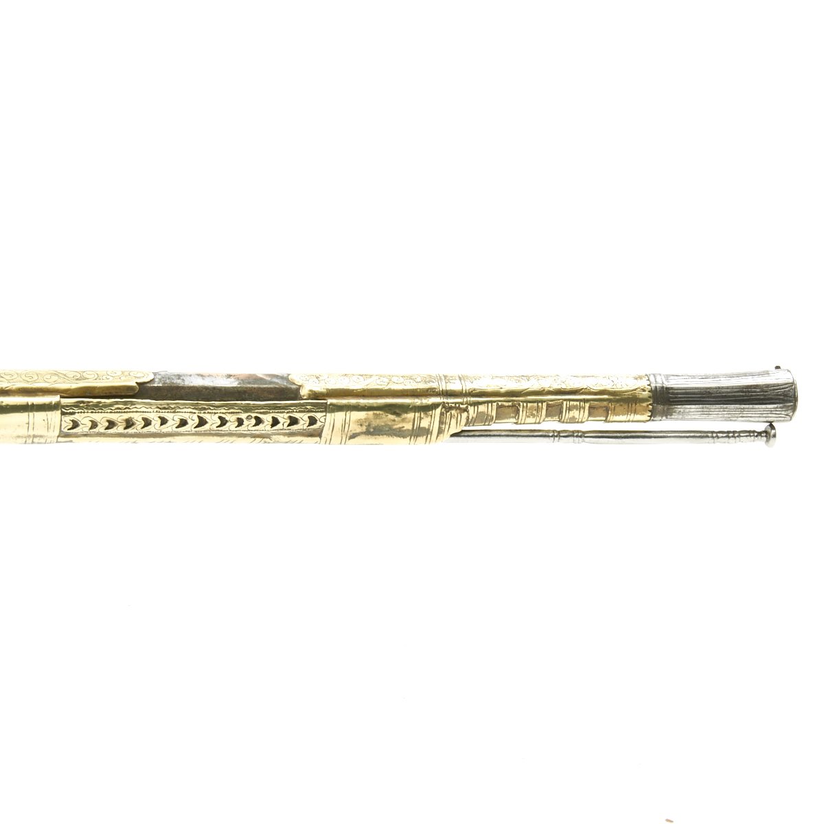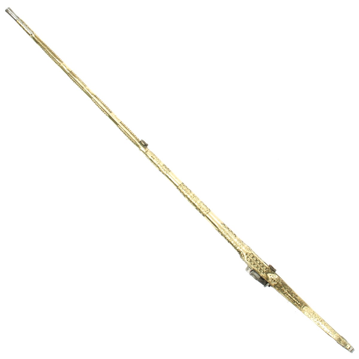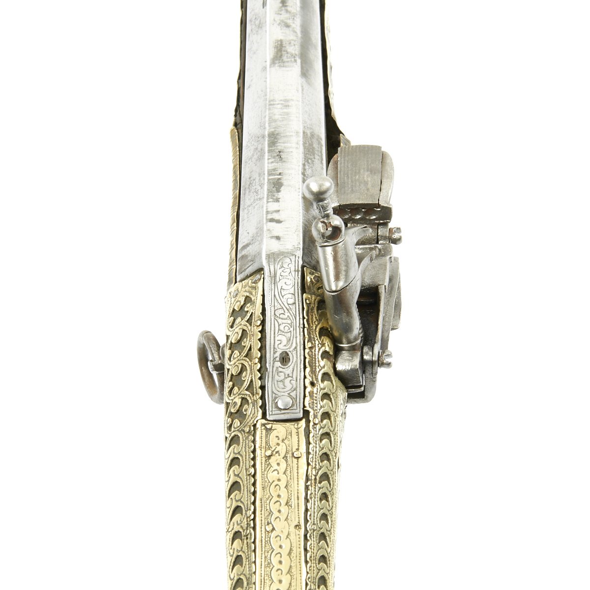 This particular weapon came from the Northern part of the Empire which could reach from Greece to southern Ukraine to the Caspian sea in the East. The lock is a MIQUELET developed in Spain and Italy in the 17th. century. The iron barrel is 46" in length and overall the weapon measure 60". The stock of wood is hardly visible at all, as it is covered in fretted out brass embossed and engraved sheeting, with a workmanship of truly great quality.