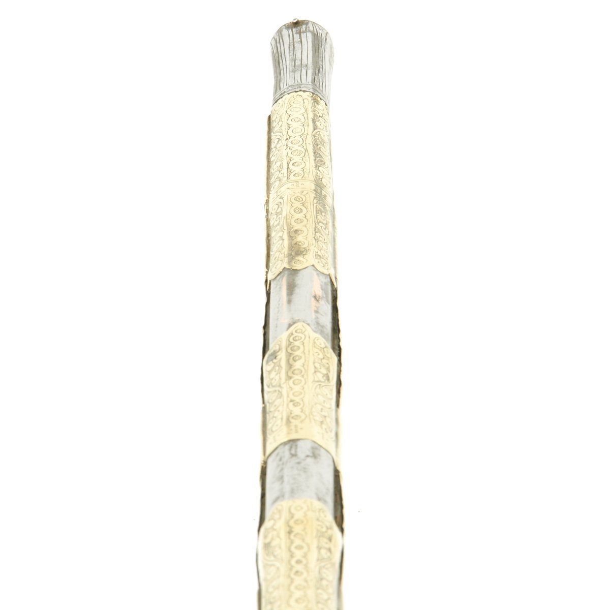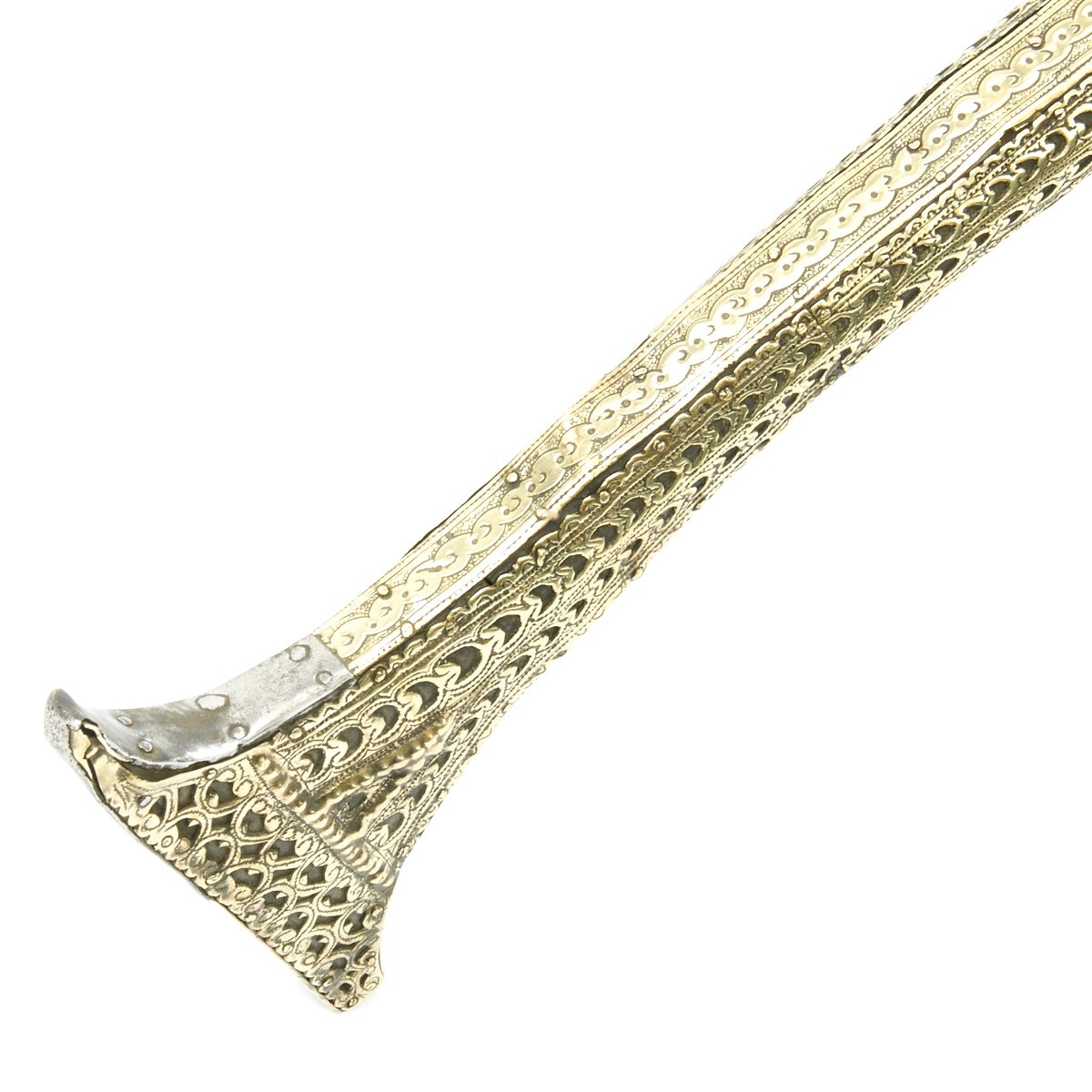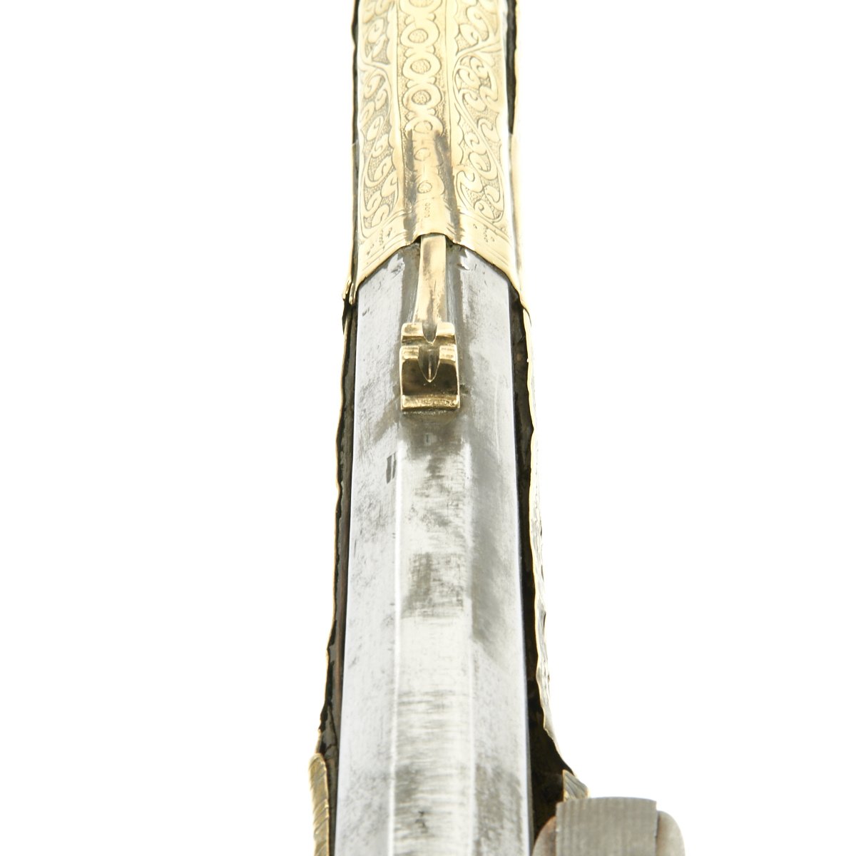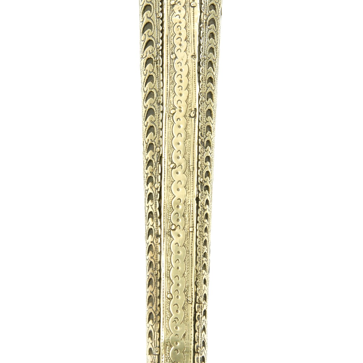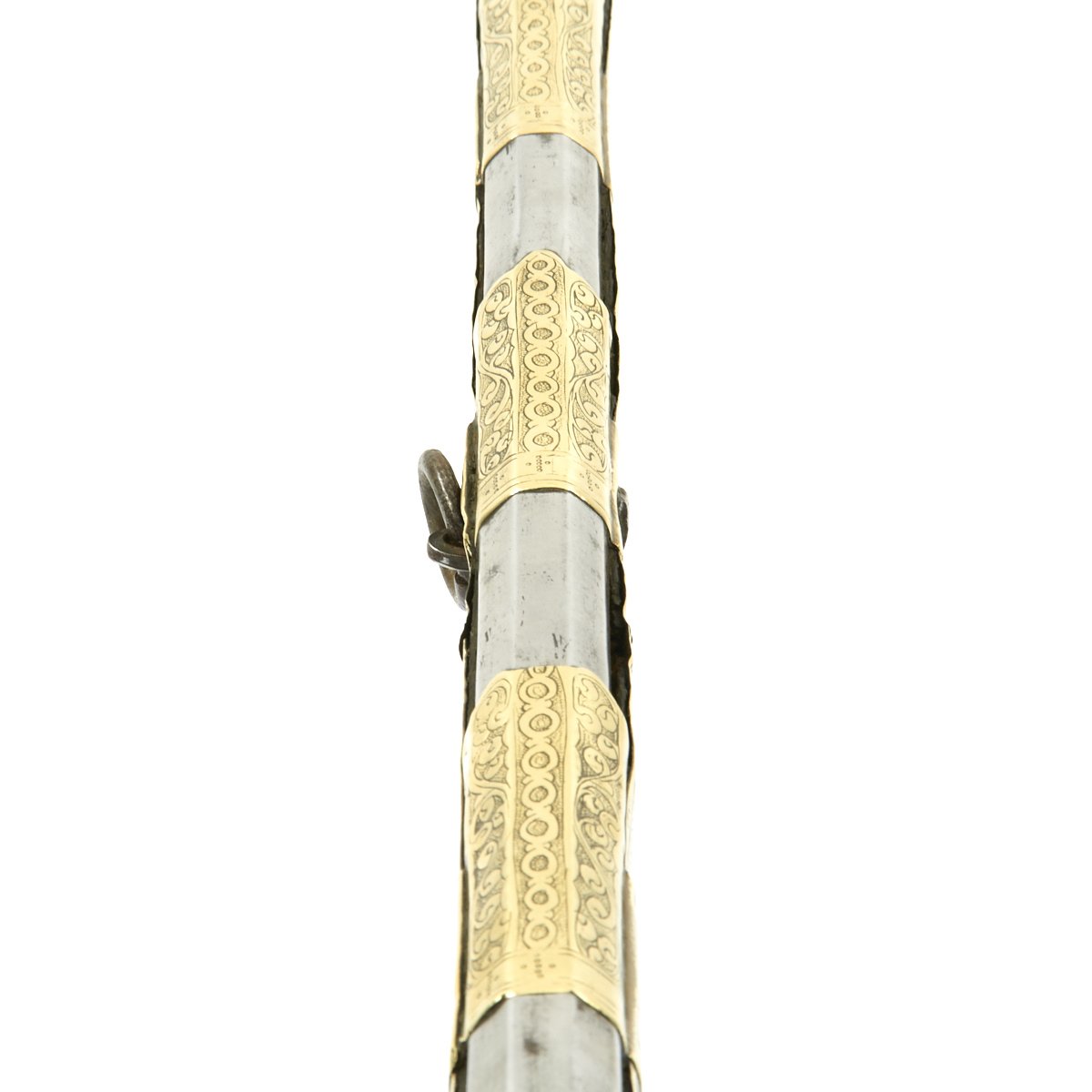 This particular weapon came from the Northern part of the Empire which could reach from Greece to southern Ukraine to the Caspian sea in the East. The lock is a MIQUELET developed in Spain and Italy in the 17th. century. The iron barrel is 46" in length and overall the weapon measure 60". The stock of wood is hardly visible at all, as it is covered in fretted out brass embossed and engraved sheeting, with a workmanship of truly great quality.