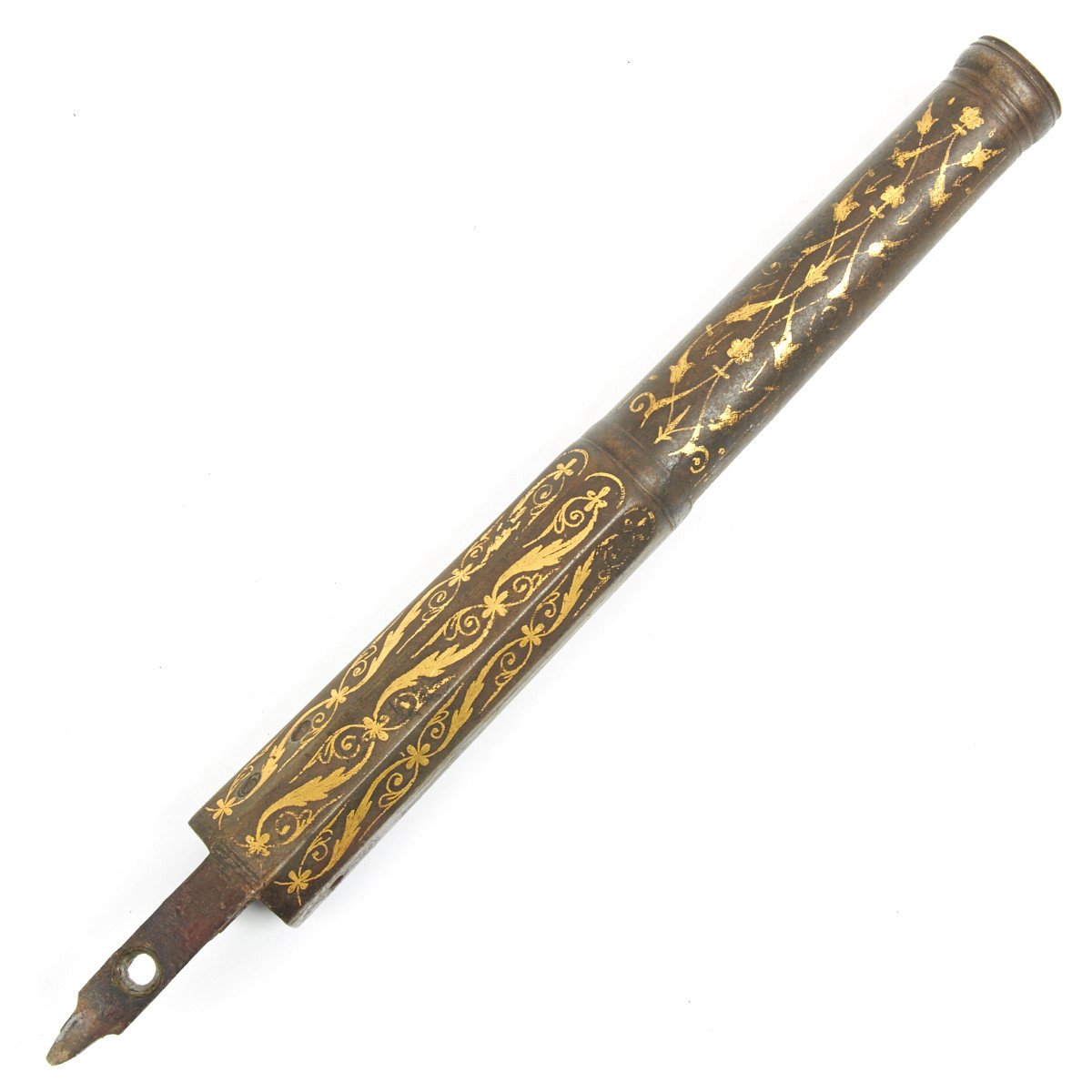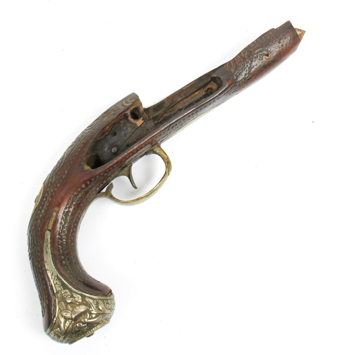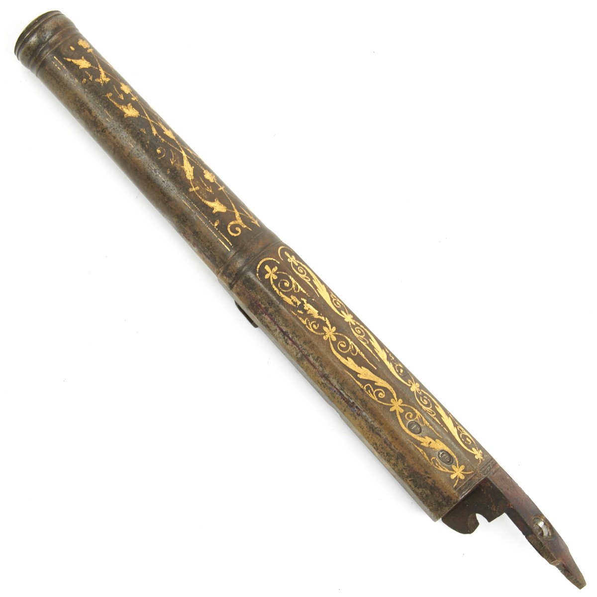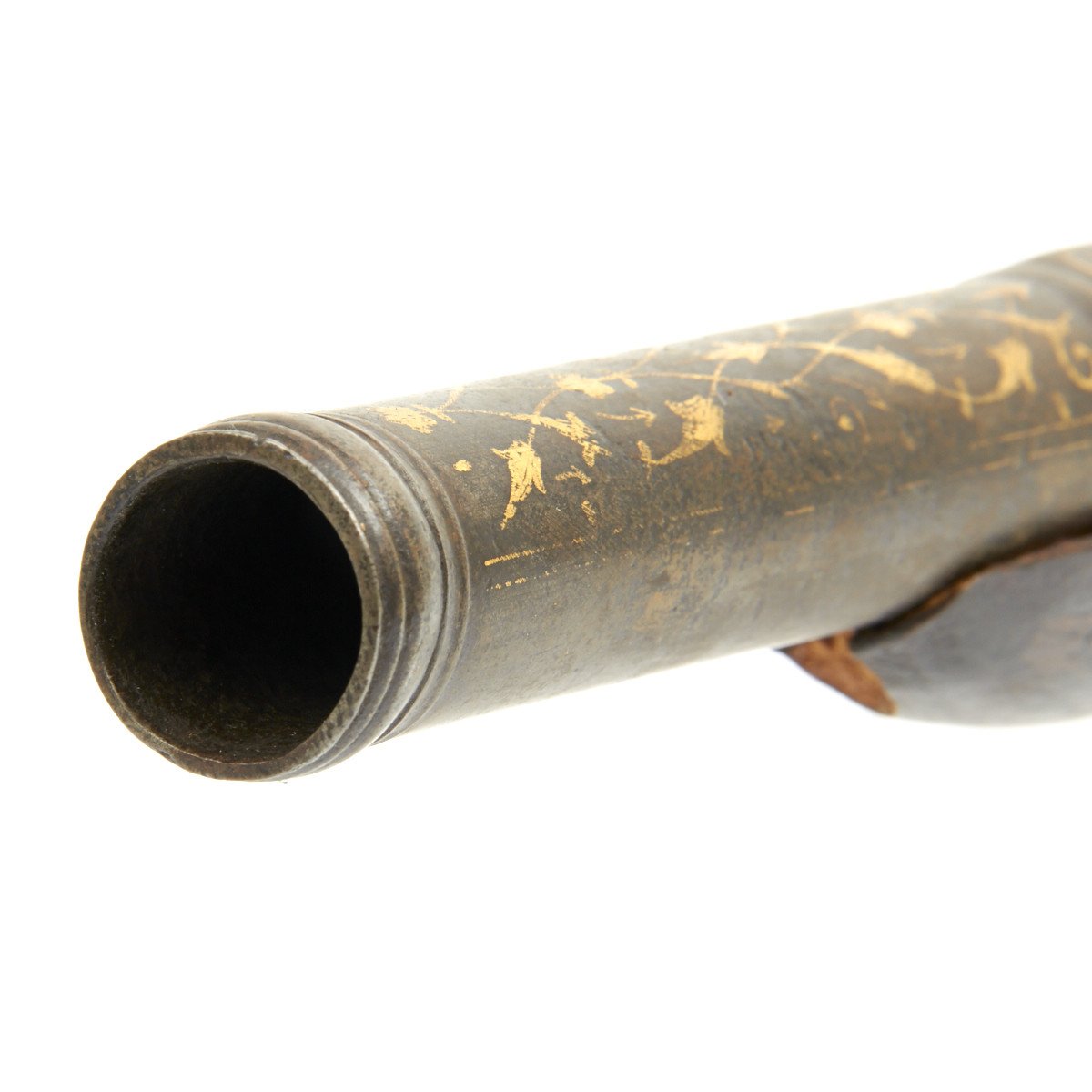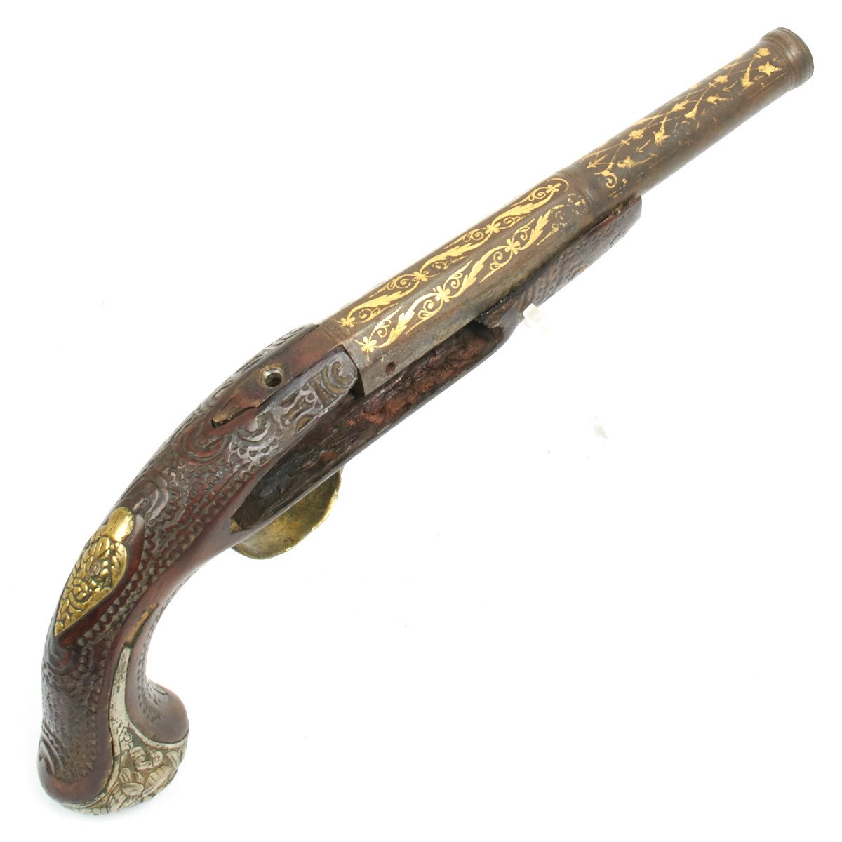 Original Item: One-of-a-kind. This is an incomplete Flintlock pistol dating from about 1820 originating from the Ottoman Empire. In fact, this pistol has a magnificent early 18th century gold inlaid cannon barrel that appears to have English proof marks (Crown "V"). The barrel is almost 8.5 inches in length not including the tang that has had some later modification for it's Ottoman life that can be easily remedied.