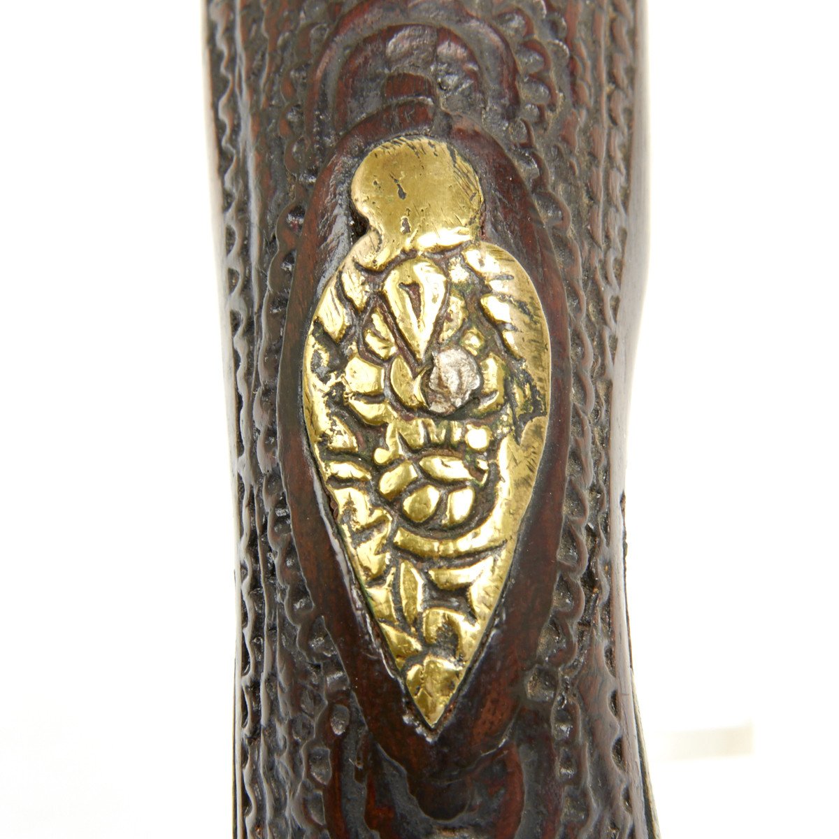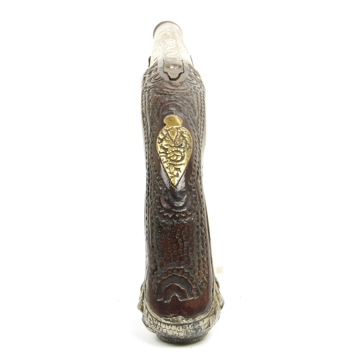 The rest of the pistol which came without a lock is brass mounted but has a good quality silver eared butt cap decorated with cast in trophies of arms.