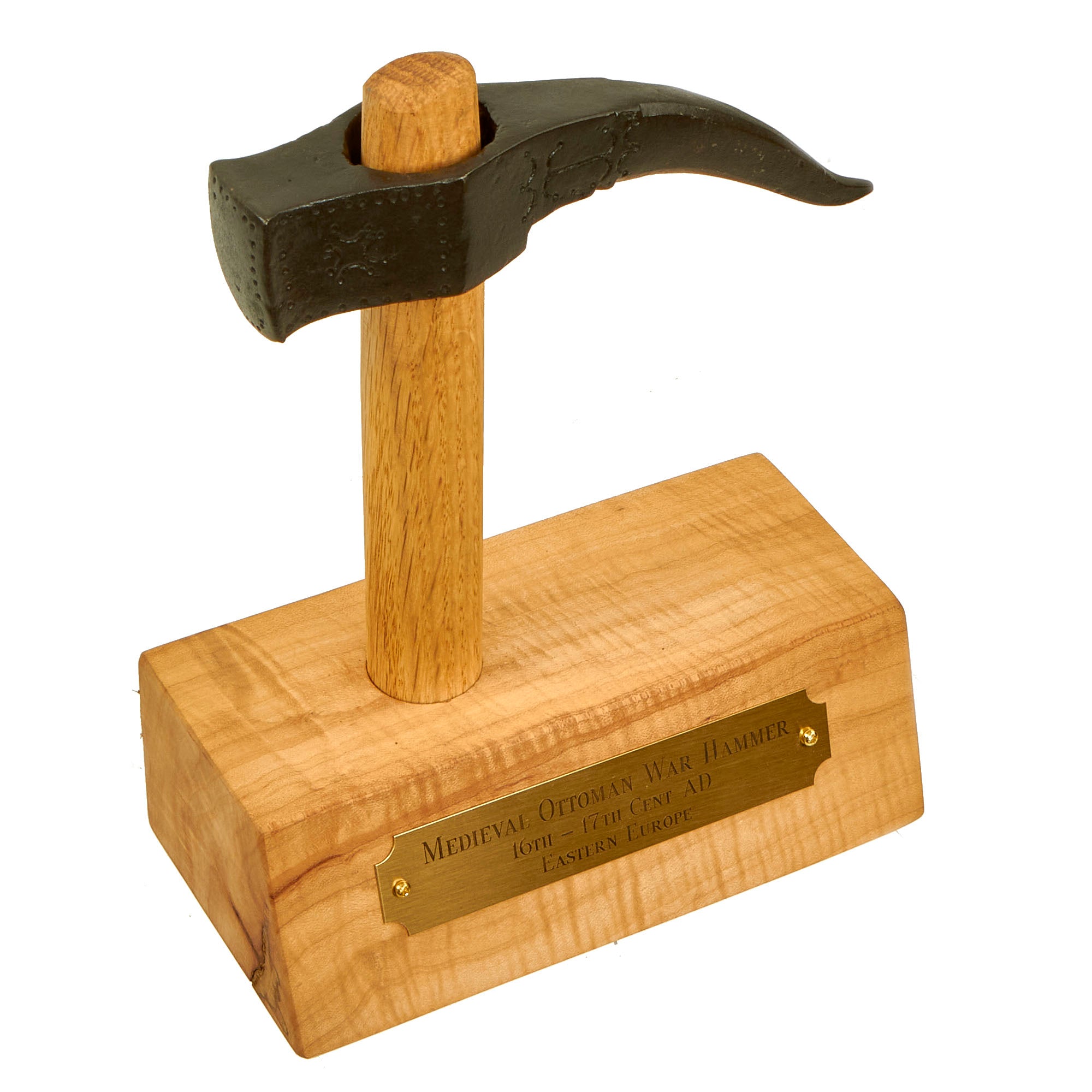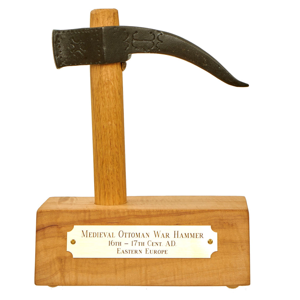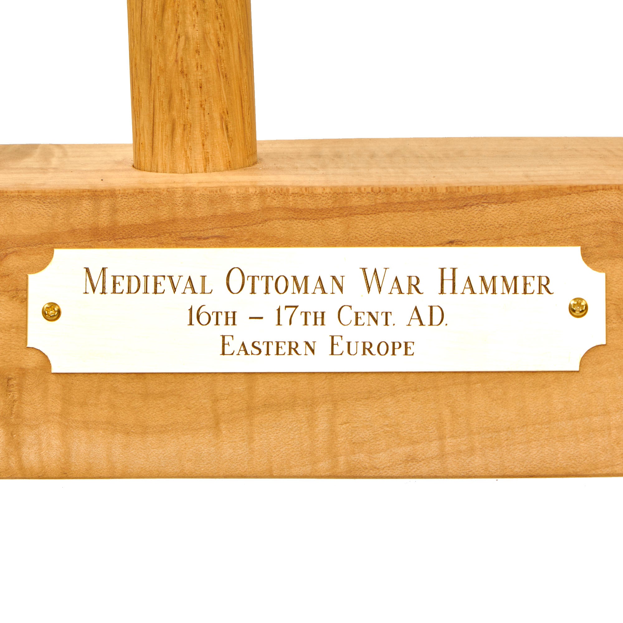 This example measures 6” from end to end with a width measuring 1 ¼” at the widest point. We believe that it is the type of war hammer called a "kulunk", which is one of the "piercing" types, and it can be seen that the spike end would be very effective at penetrating armor and helmets. This design spread to areas in Eastern Europe, however these are usually unadorned. The designs engraved into this definitely resemble other kulunk examples we have seen. It comes mounted on a wooden dowel to imitate the polearm it would have been attached to which is then seated inside of a lovely wooden base with a museum style brass ID plate.
