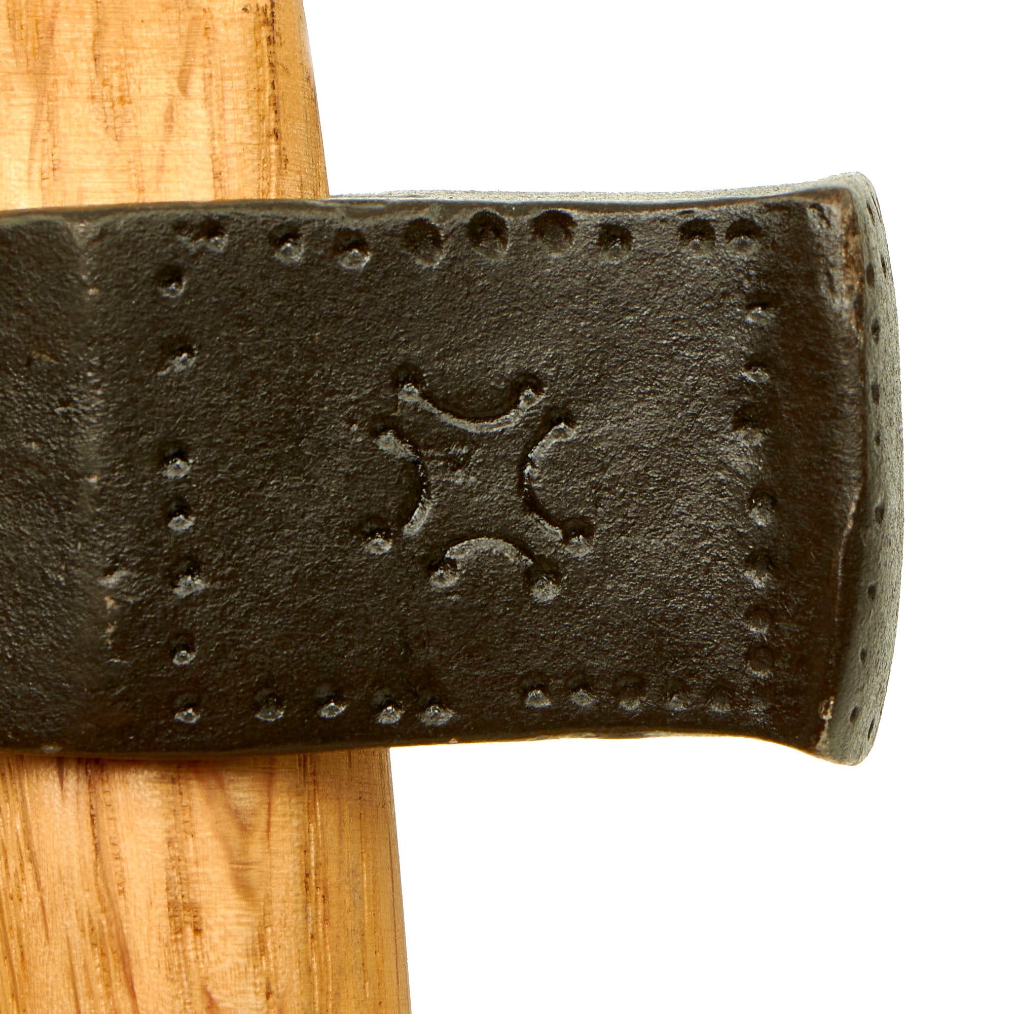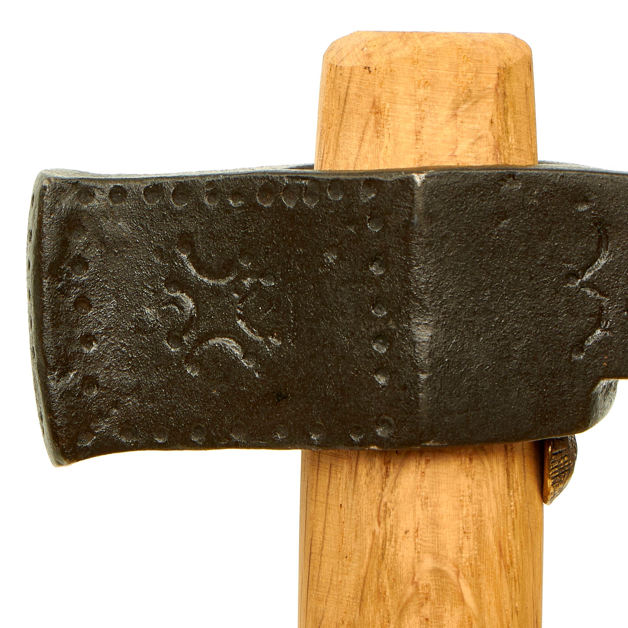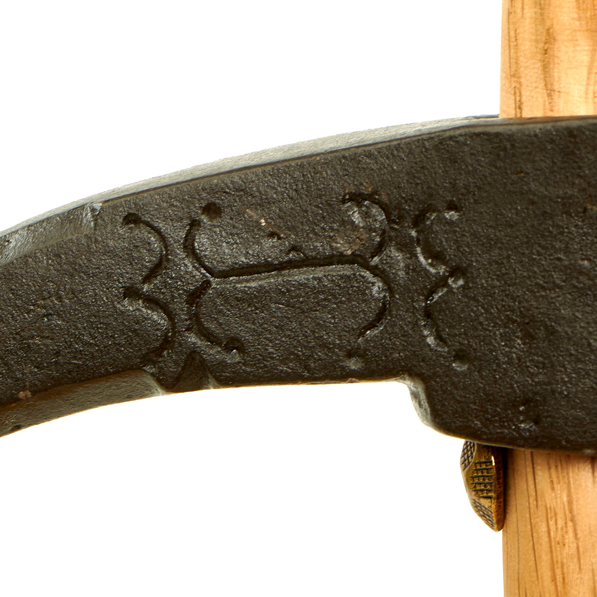 This example measures 6” from end to end with a width measuring 1 ¼” at the widest point. We believe that it is the type of war hammer called a "kulunk", which is one of the "piercing" types, and it can be seen that the spike end would be very effective at penetrating armor and helmets. This design spread to areas in Eastern Europe, however these are usually unadorned. The designs engraved into this definitely resemble other kulunk examples we have seen. It comes mounted on a wooden dowel to imitate the polearm it would have been attached to which is then seated inside of a lovely wooden base with a museum style brass ID plate.