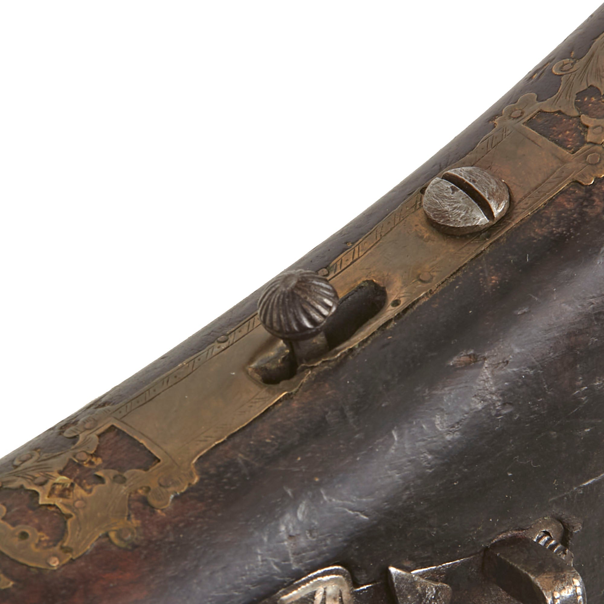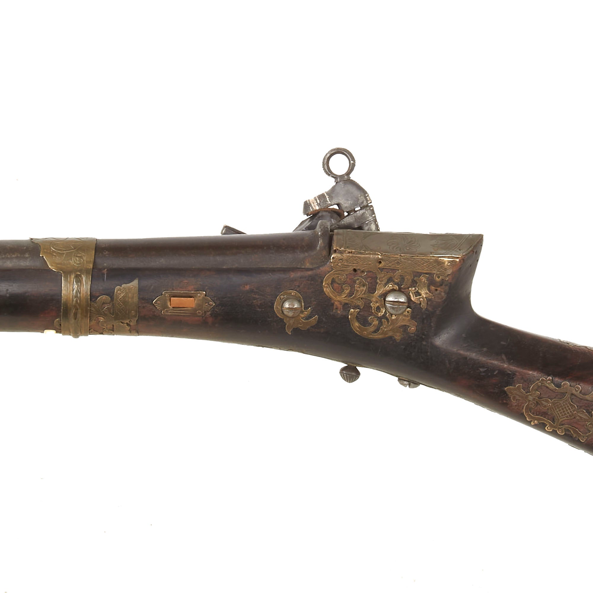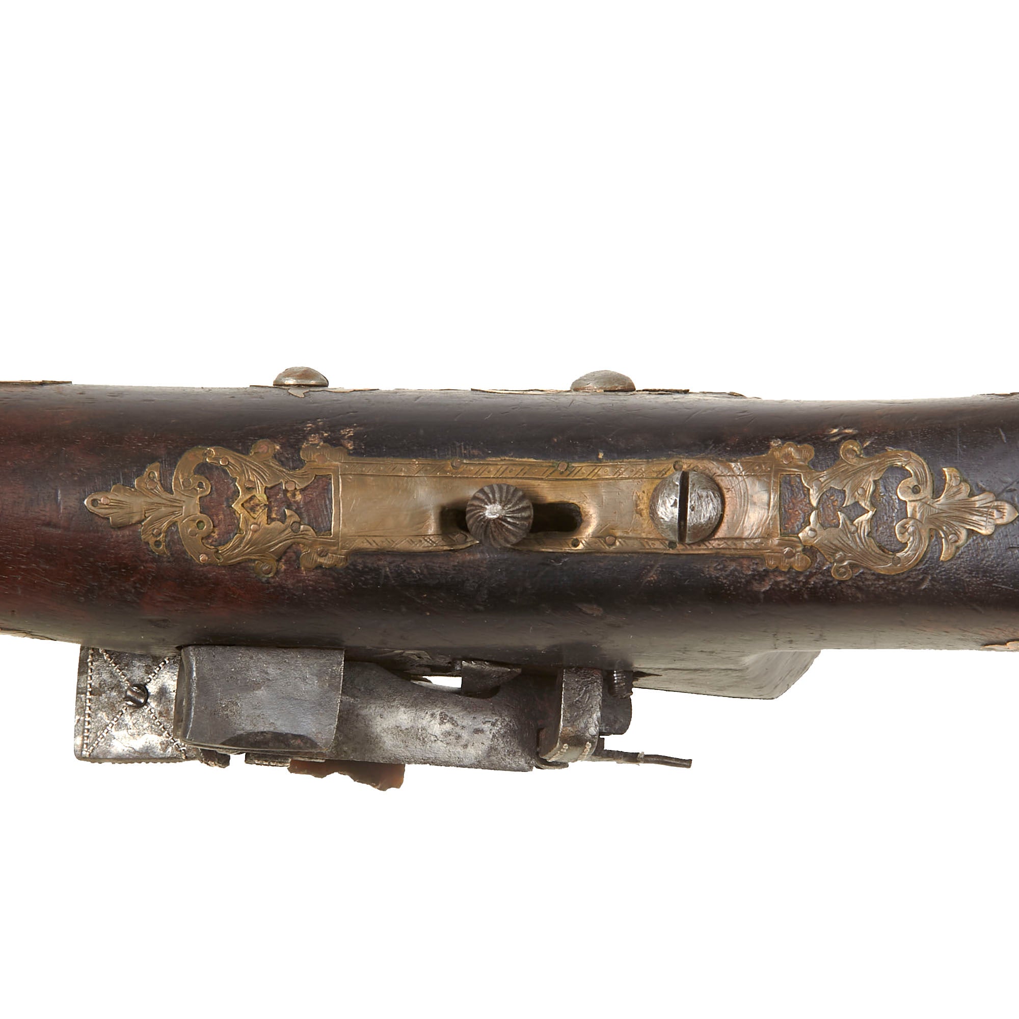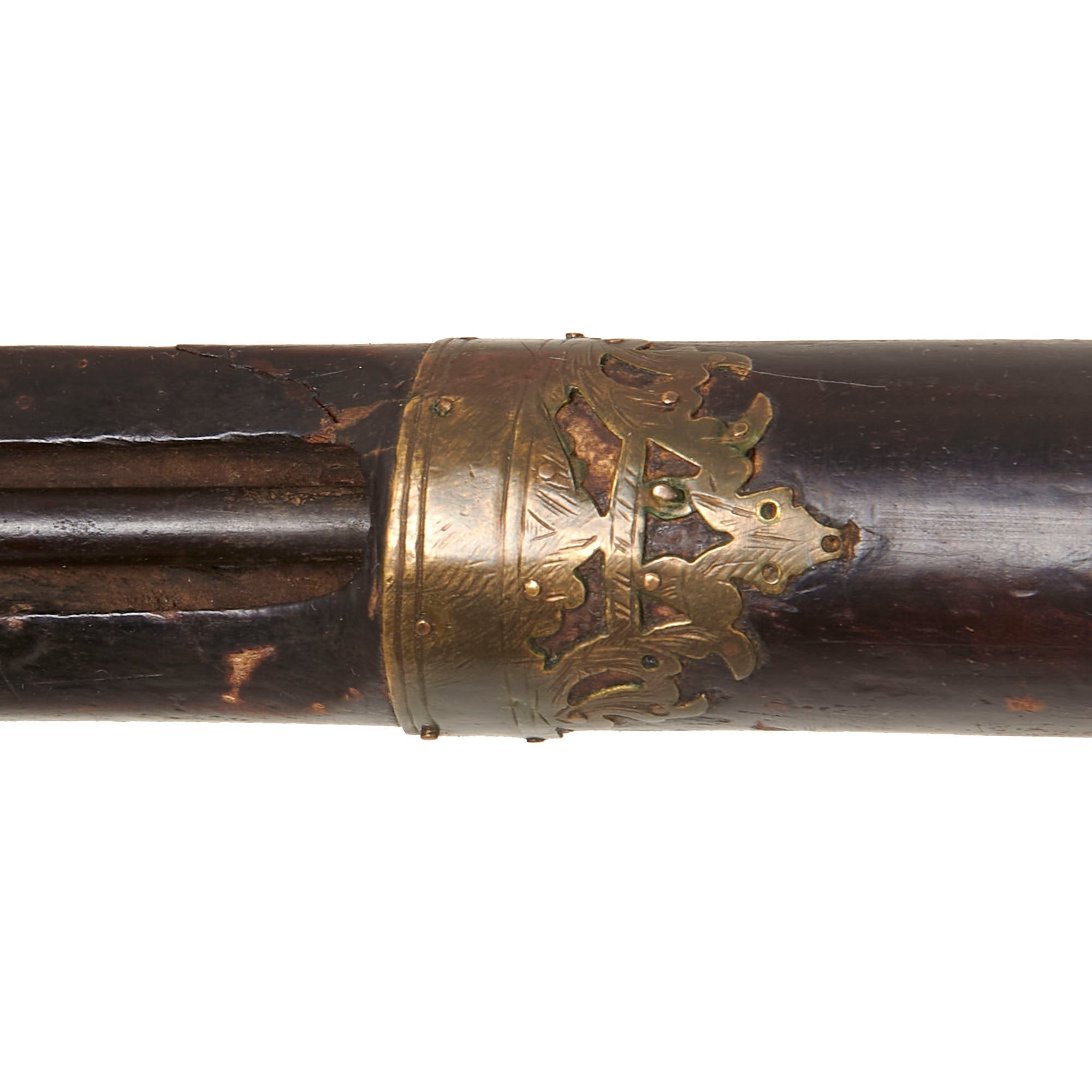 Here we offer a Classic, high quality, Ottoman Miquelet Musket known as a "SHISHANA" dating probably to the late 18th century. It features a 41"smothbore barrel with a bore approximately 0.73" in diameter, and is held in place with highly decorative embossed sheet brass bands. We also see what look to be two solid copper barrel wedges to help the heavy barrel stay in place. The wooden stock has additional embossed sheet brass fittings, as well as cladding on the top of the characteristic fitting around the barrel tang.